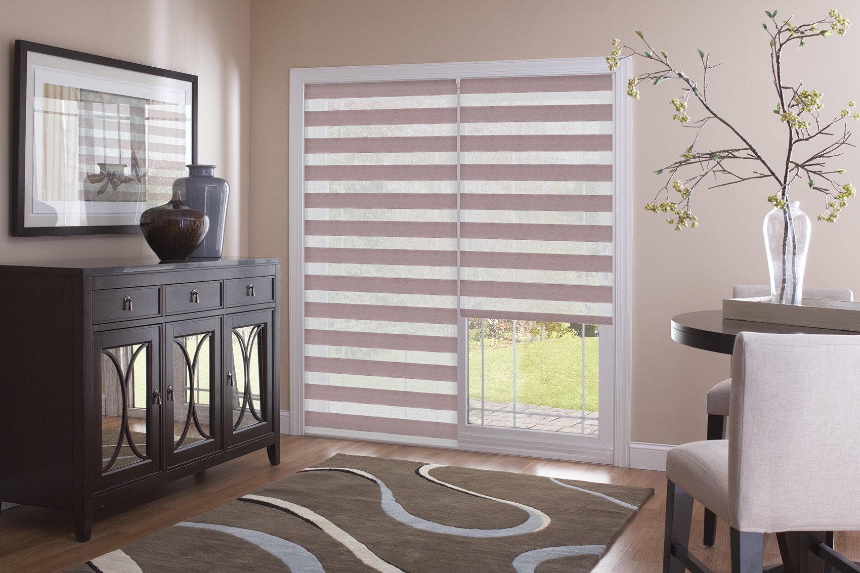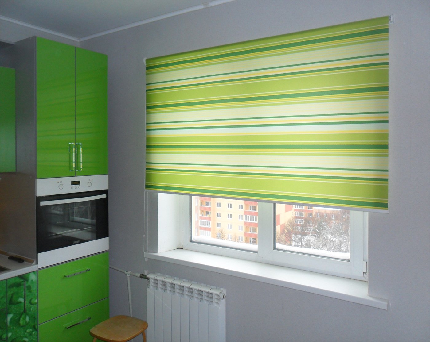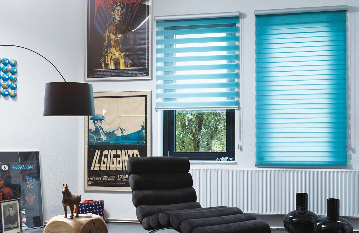 "Día-noche" (cebra).Tipo muy popular. Representa una tela doble en la que se alternan tiras de malla de color y transparentes. Tales cortinas pueden oscurecer completamente la habitación, jugar con la luz y crear un ambiente confortable.