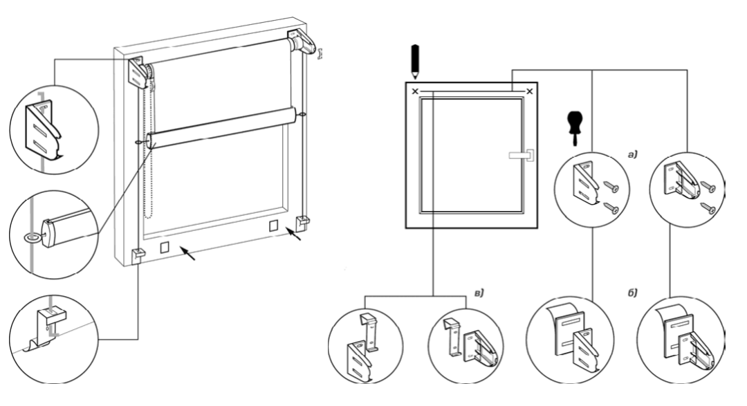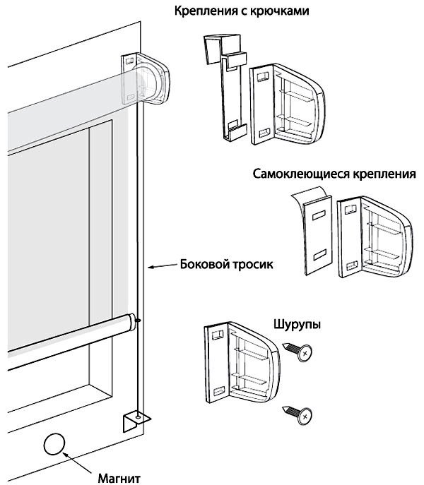 Dependiendo del peso de la estructura, se elige un método de montaje. Los modelos pequeños se pueden pegar en velcro de doble cara, y los mecanismos pesados para ventanas panorámicas se fijan mejor en clips especiales o se atornillan.El proceso de instalación de bricolaje es muy simple, es el siguiente: