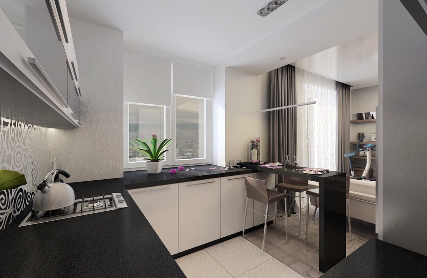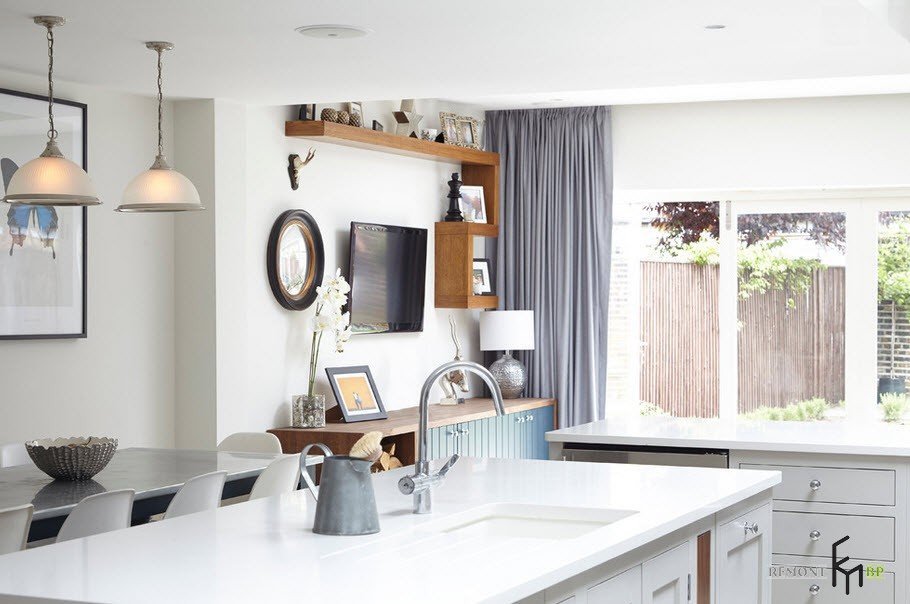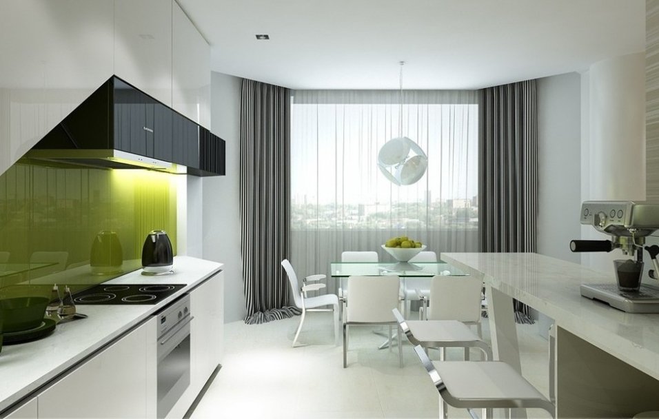 Muchas cocinas monofónicas que combinan varios tonos del mismo tono no pueden llamarse aburridas y mundanas. Si desea hacer que los muebles sean realmente hermosos o incluso lujosos, necesita la combinación correcta. La cocina ubicada en el lado soleado está decorada con objetos de tonos blancos, grises, azules, azules o verdes. Es apropiado usar morado y azul, combinado con gris: aquí todo se basa en la gama general y el estilo. Si desea difundir ligeramente los rayos del sol, use tul o muselina. Si las ventanas miran hacia el lado norte o noroeste, los mismos tonos blancos o grises, acompañados de rojo, amarillo o rosa, serán útiles para crear un ambiente cálido y acogedor.