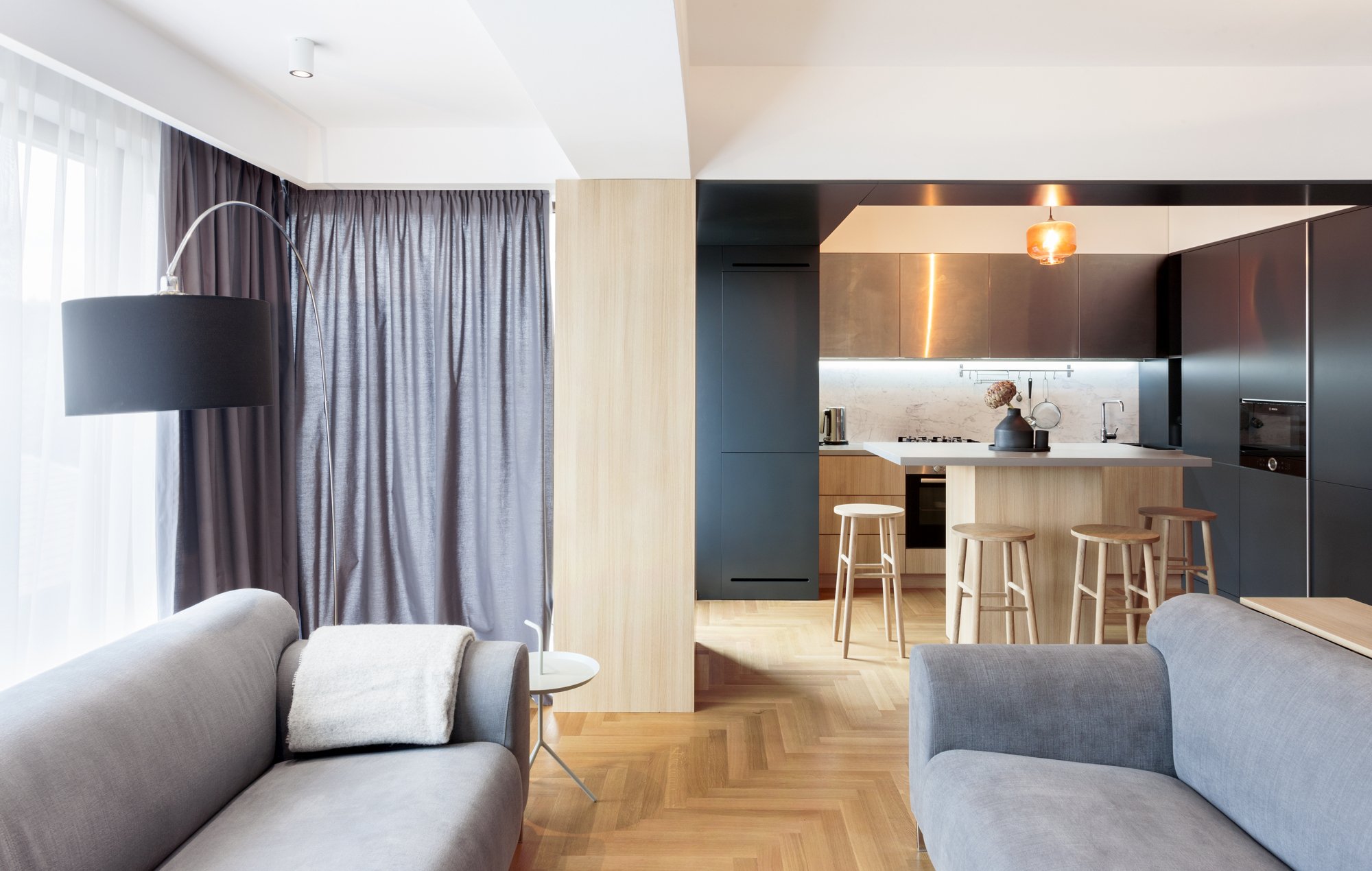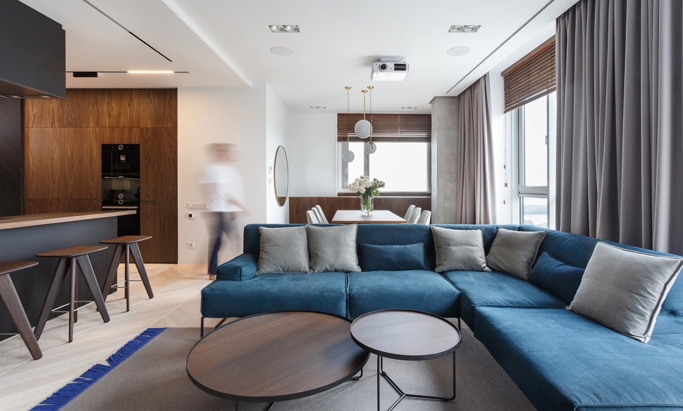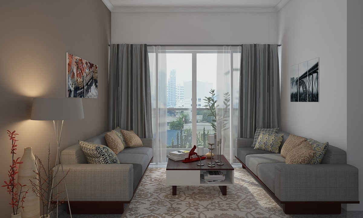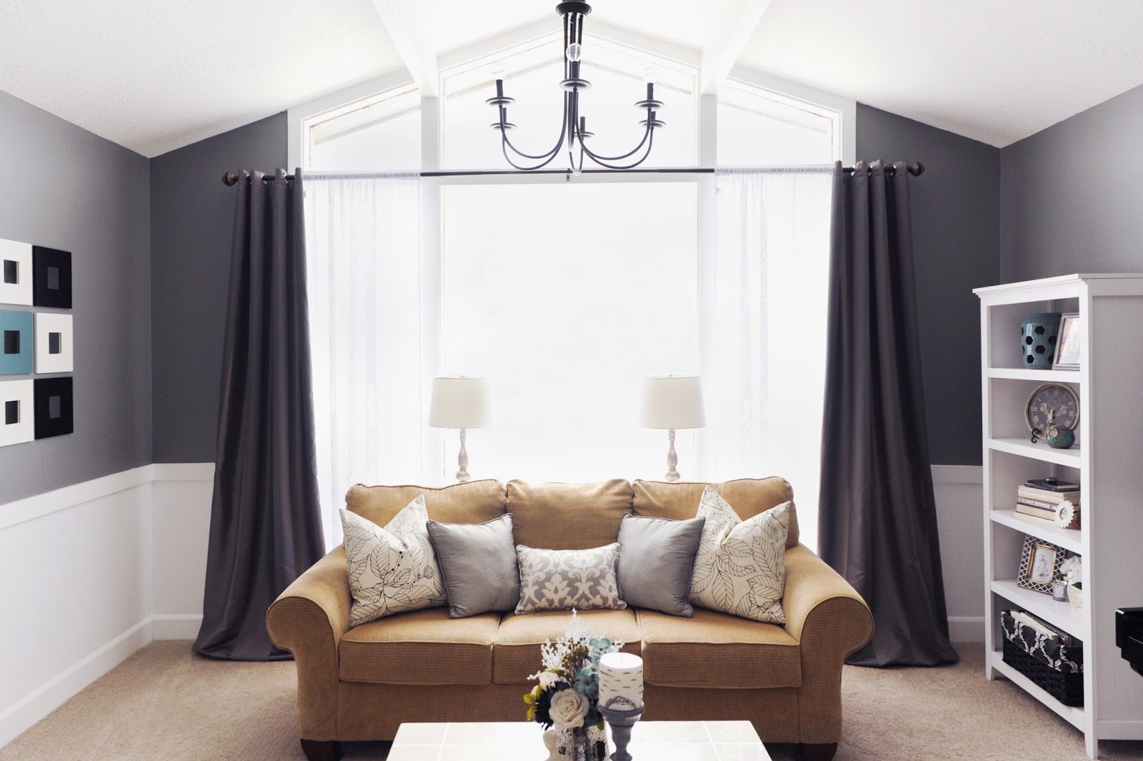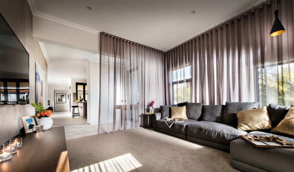 Se pueden seleccionar cortinas de color gris oscuro si la sala de estar tiene una iluminación adecuada con un nivel de iluminación suficiente.