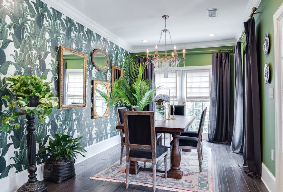 Las cortinas de color oscuro son la mejor solución para habitaciones soleadas, que además se combinan con paredes y muebles claros, como el bambú. Principalmente en el interior utilizan productos de fresno, gris-violeta, pizarra, plata, perla.Se adaptan perfectamente a cualquier estilo: clásico y barroco, moderno y de alta tecnología. Los productos hechos de telas naturales con estampados florales encajan incluso en el diseño provenzal.