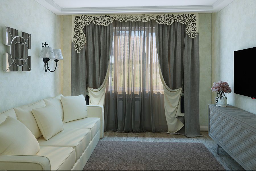 Al elegir cortinas grises para el salón, debe mirar telas elegantes: terciopelo, satén, satén y otros materiales que se decoran fácilmente con cortinas. Curling en ojales es una gran opción para crear pliegues estéticamente agradables. Las dimensiones de las cortinas se determinan dependiendo de los anillos utilizados como accesorio. Los productos de terciopelo están en perfecta armonía con la tapicería de los muebles, y gozan de una gran popularidad. Si no puede encontrar la manera de lograr la combinación perfecta, vale la pena decorar la habitación con varios detalles. Ya sea un mantel, alfombra, cortinas, servilletas comunes, esto lo ayudará a lograr la armonía de la habitación.
