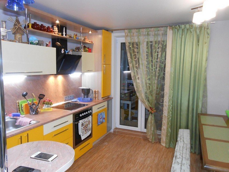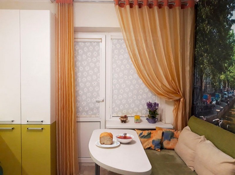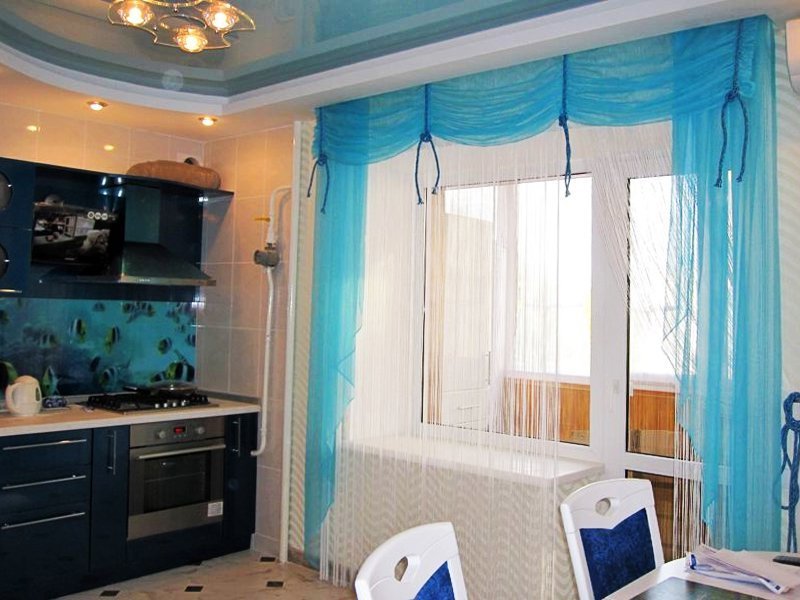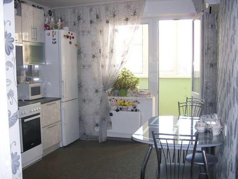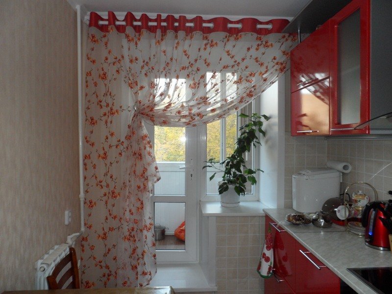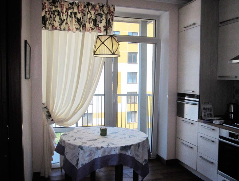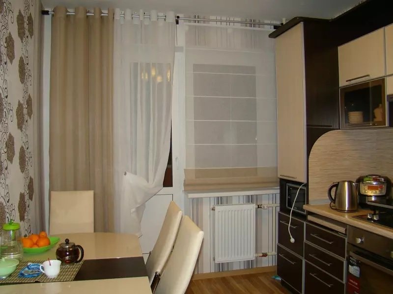 El acceso gratuito al balcón es imprescindible. De hecho, el balcón de la cocina, según las estadísticas, se visita con más frecuencia que desde otras habitaciones. Por lo tanto, incluso en la etapa de planificación de la compra, elija las cortinas para no aferrarse a ellas.