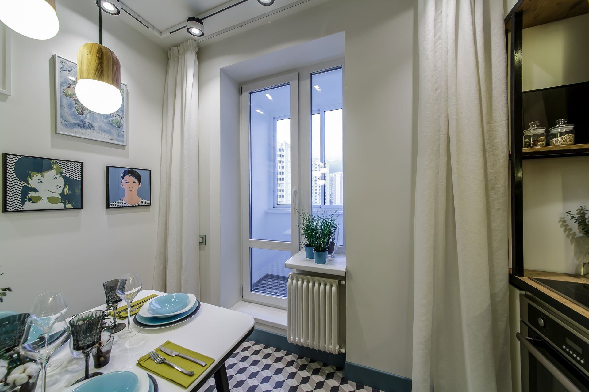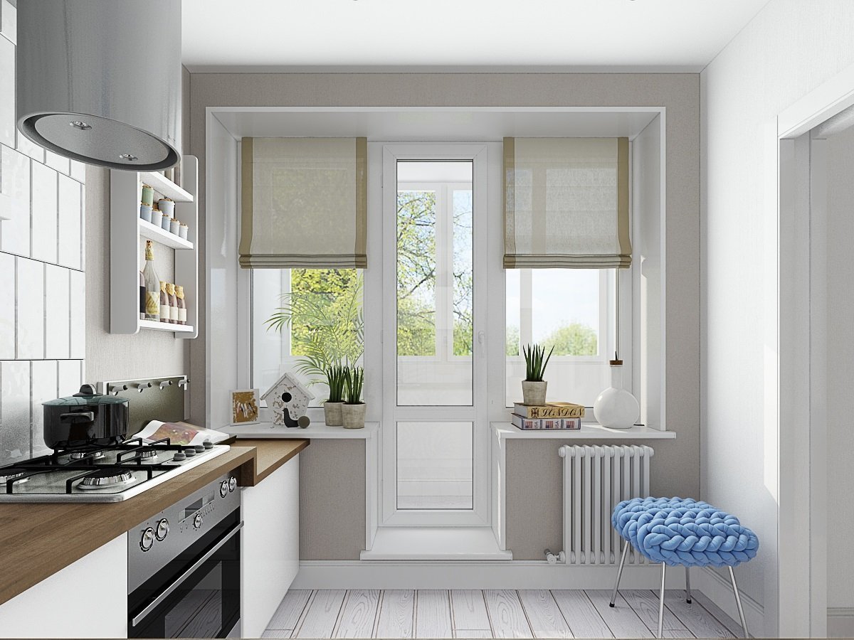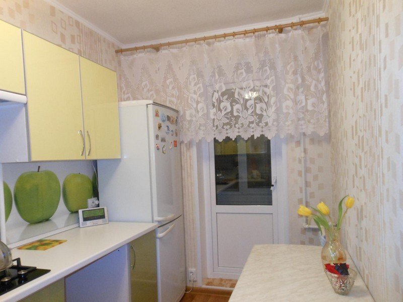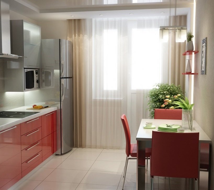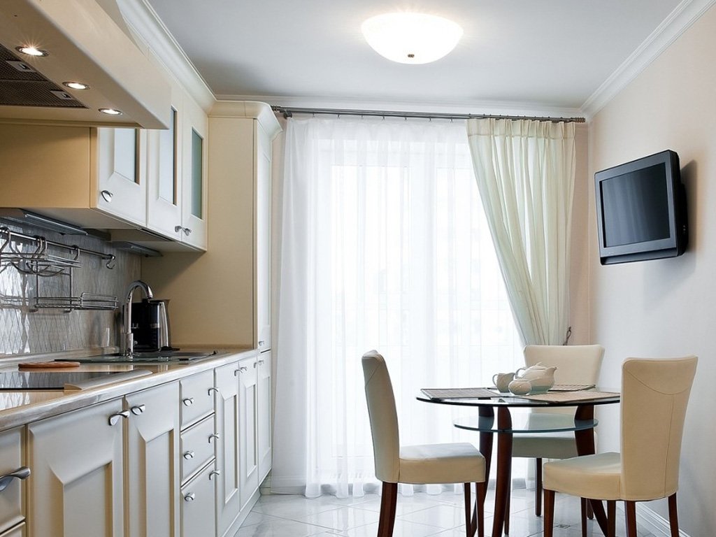 El acceso gratuito al balcón es imprescindible. De hecho, el balcón de la cocina, según las estadísticas, se visita con más frecuencia que desde otras habitaciones. Por lo tanto, incluso en la etapa de planificación de la compra, elija las cortinas para no aferrarse a ellas.