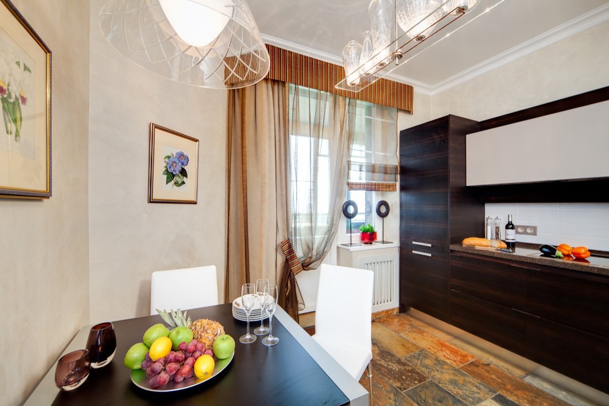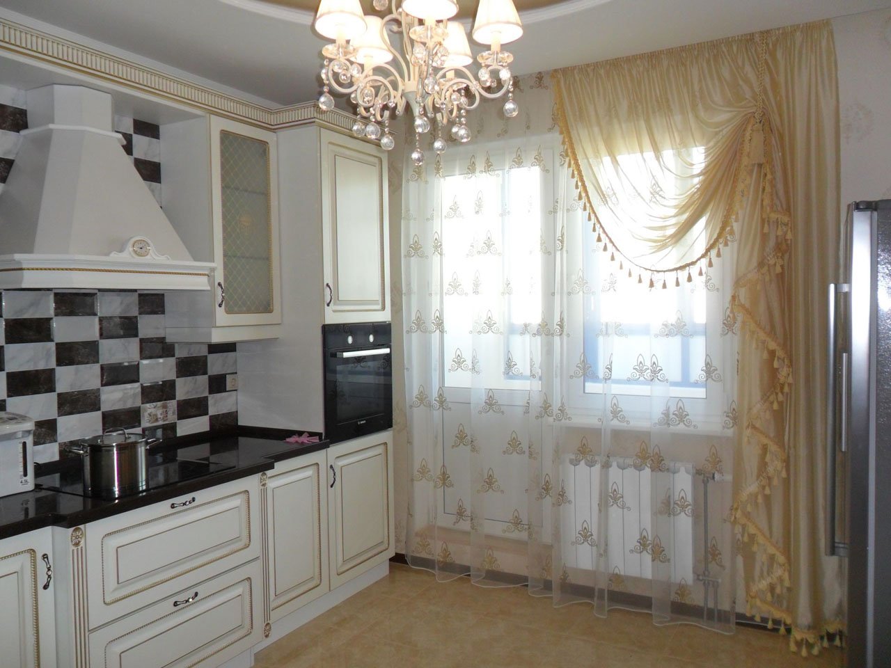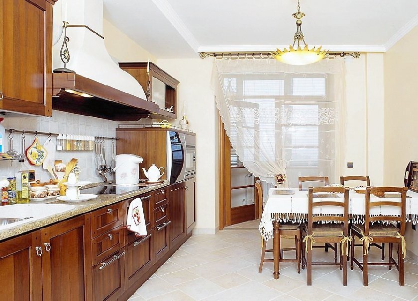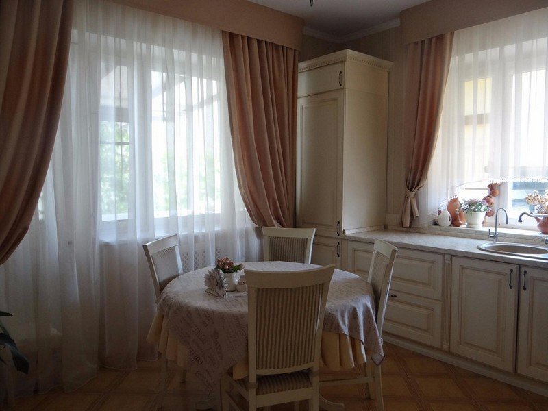 Las elegantes cortinas de organza y satén se ven orgánicamente en cocinas imperiales o barrocas. En particular, si la sala de la cocina sirve simultáneamente como comedor o sala de estar.