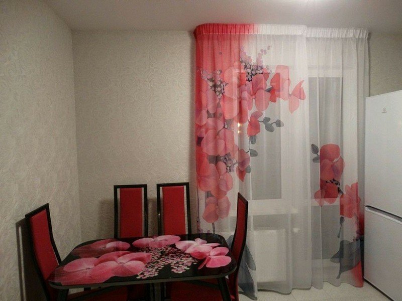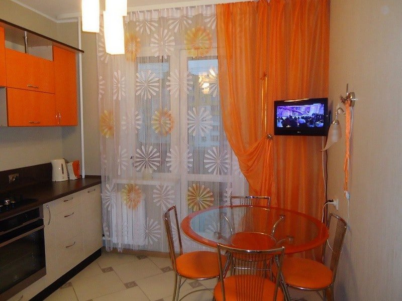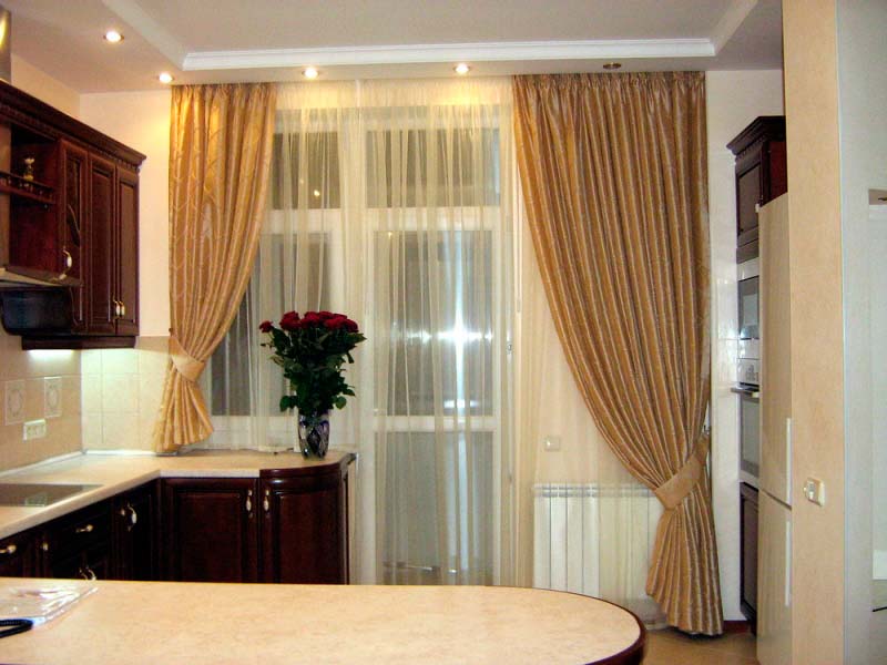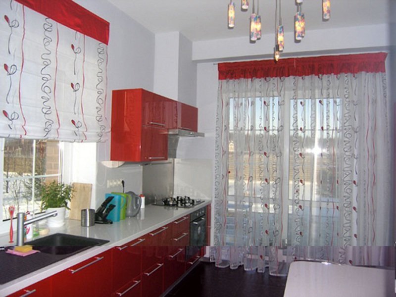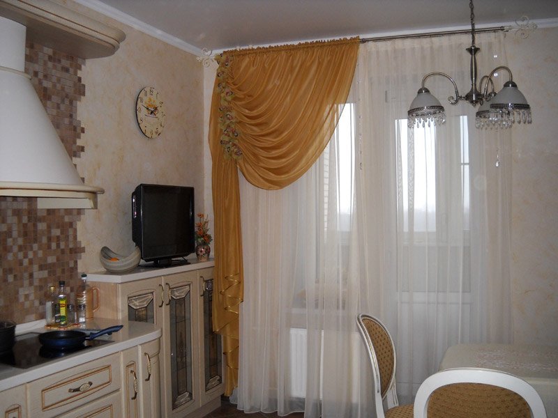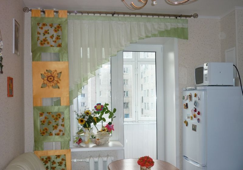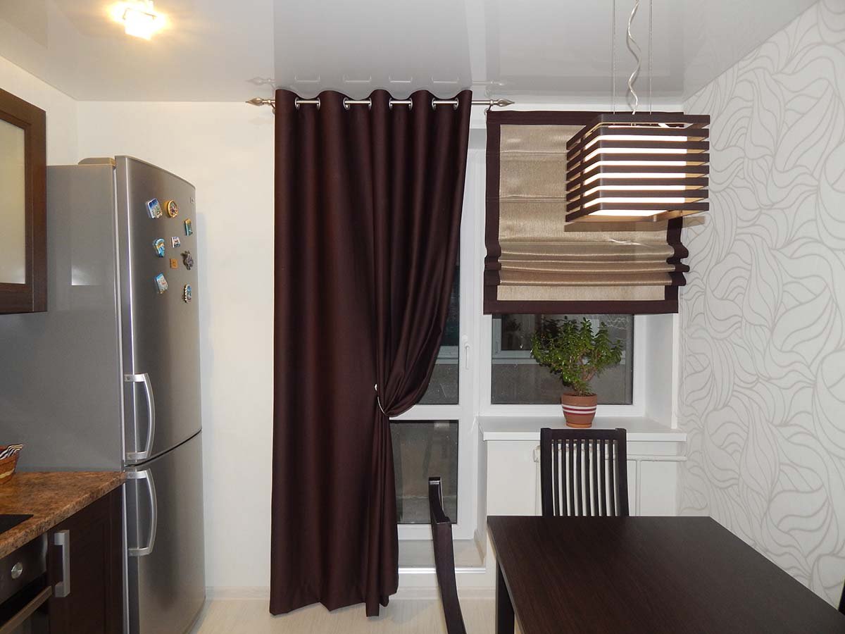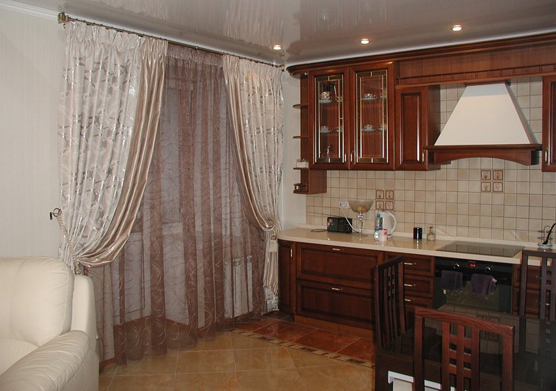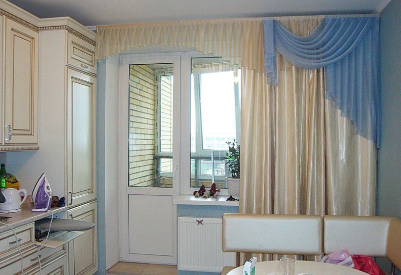 Una combinación clásica para una cocina que no pretende tener un diseño exquisito es una combinación de tul elegante y ligero con cortinas de diferentes longitudes.Se coloca una cortina más larga a un lado, al costado de la salida al balcón. Se requiere la intercepción de las cortinas, ya que esto simplificará la apertura de la puerta del balcón hacia adentro. La longitud de la cortina en el lado opuesto a la puerta está justo debajo de la línea del alféizar de la ventana. Una solución original son las cortinas en cornisas montadas a diferentes alturas.