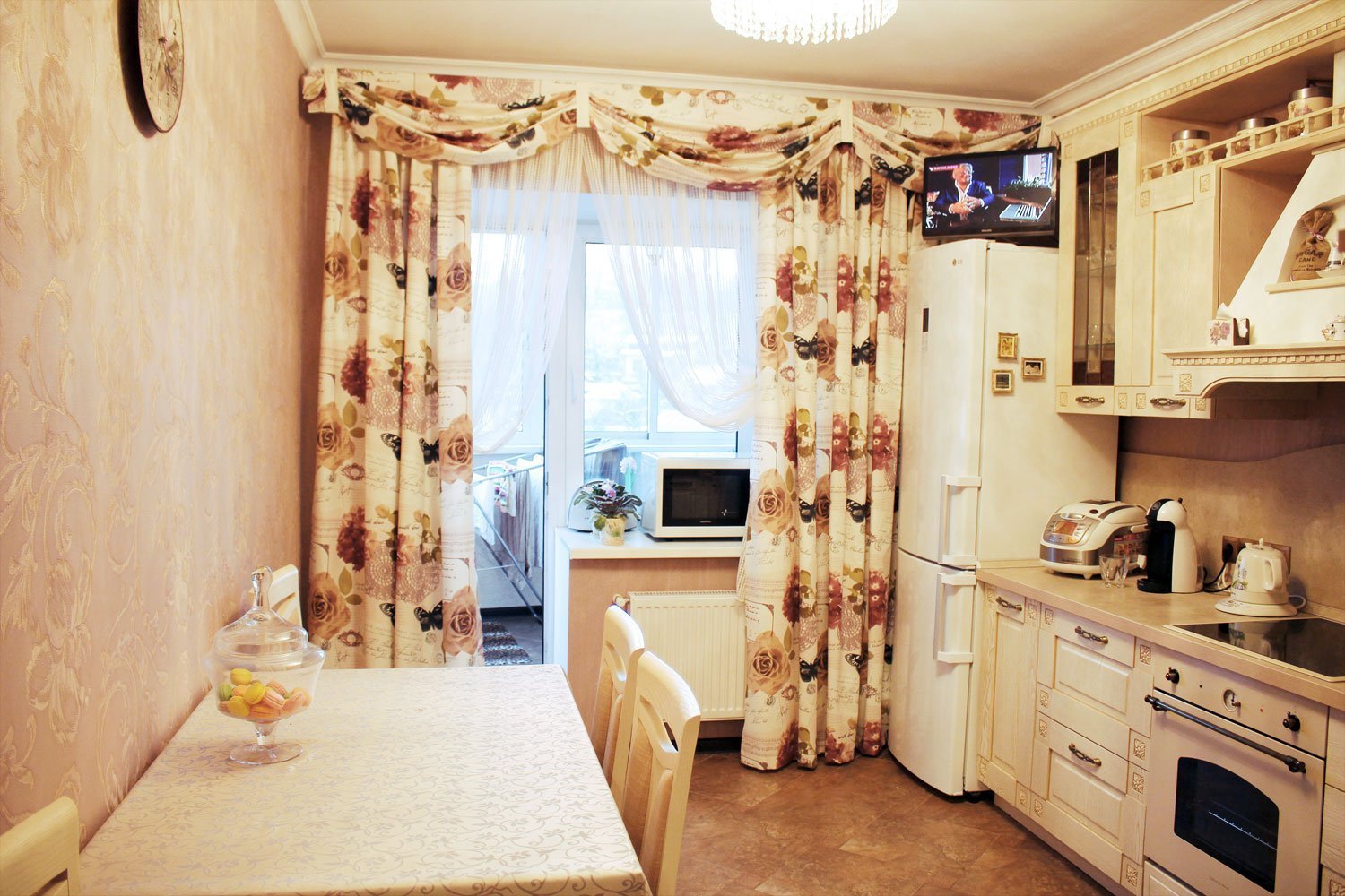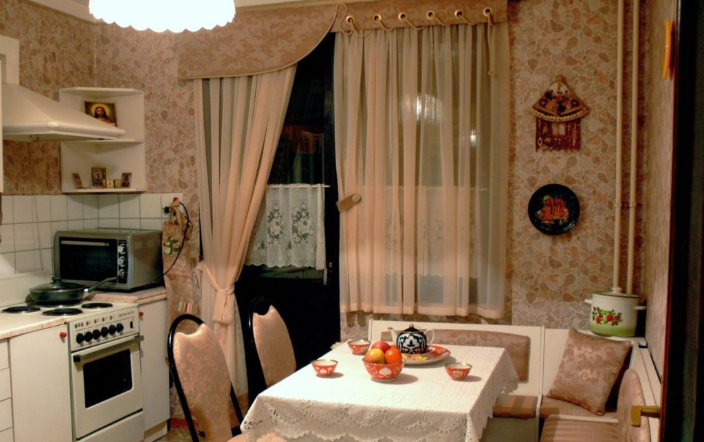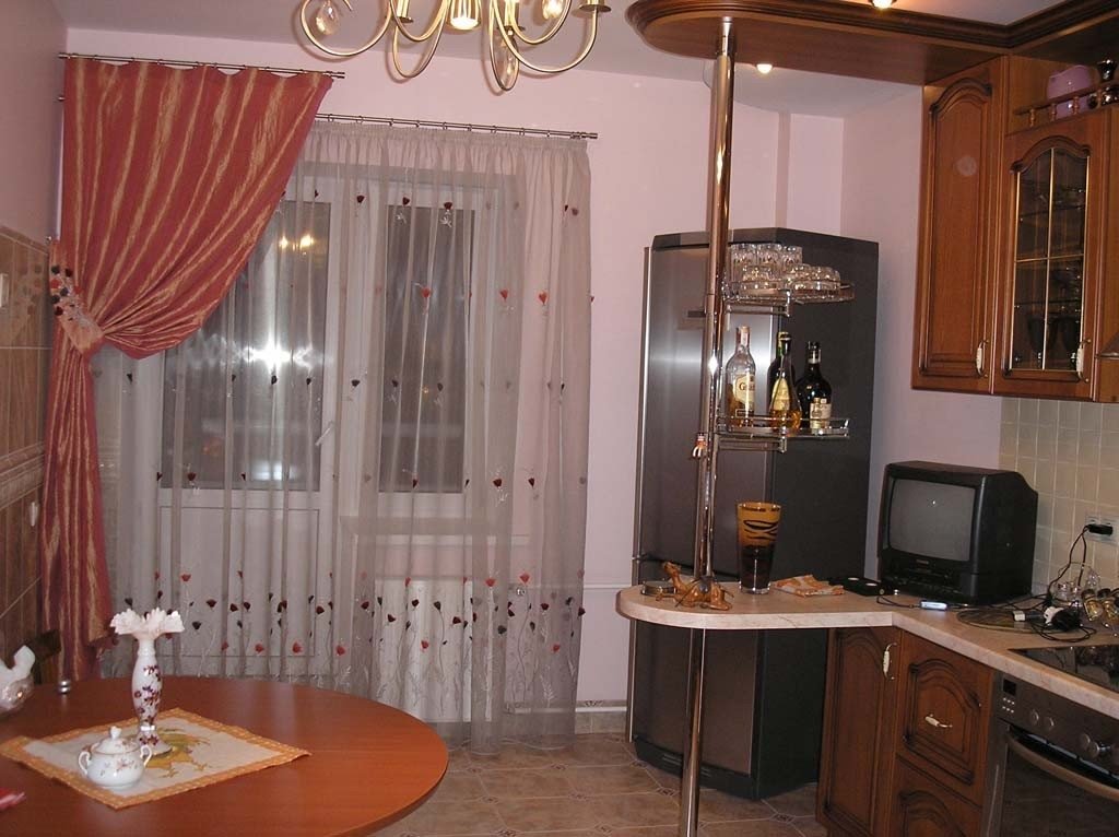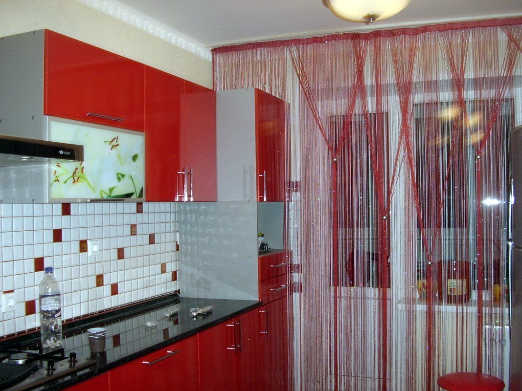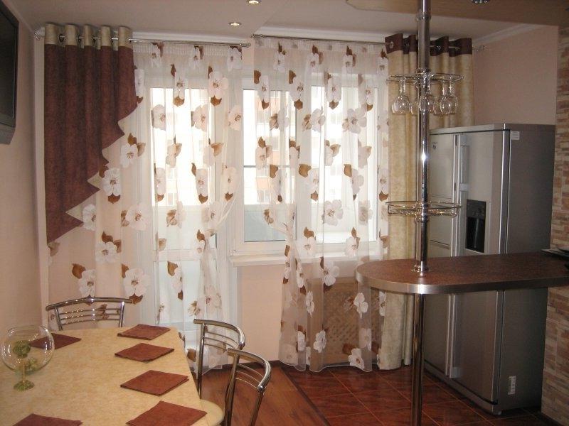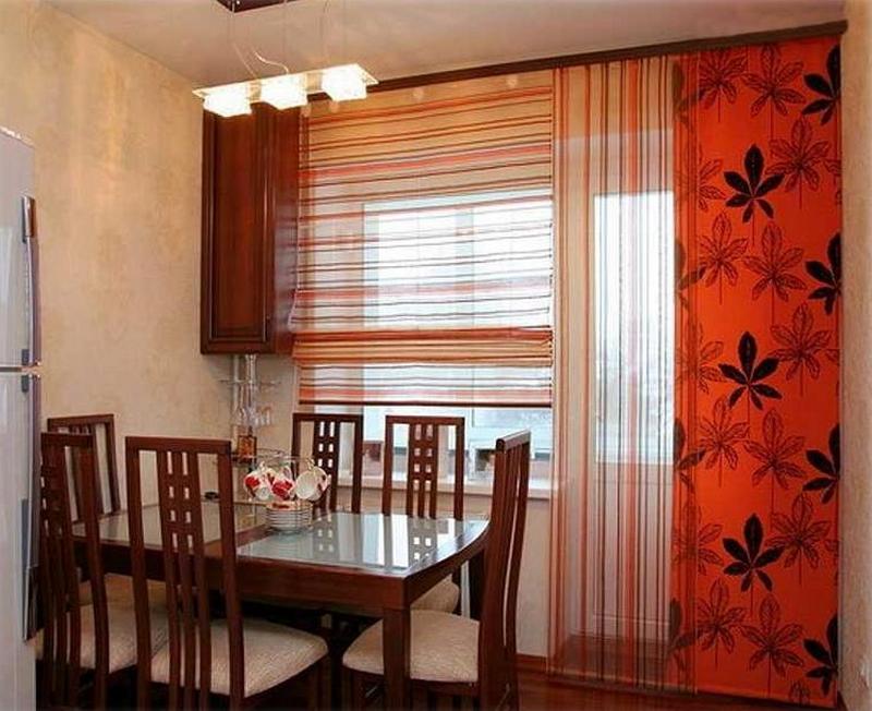 Una combinación clásica para una cocina que no pretende tener un diseño exquisito es una combinación de tul elegante y ligero con cortinas de diferentes longitudes.Se coloca una cortina más larga a un lado, al costado de la salida al balcón. Se requiere la intercepción de las cortinas, ya que esto simplificará la apertura de la puerta del balcón hacia adentro. La longitud de la cortina en el lado opuesto a la puerta está justo debajo de la línea del alféizar de la ventana. Una solución original son las cortinas en cornisas montadas a diferentes alturas.