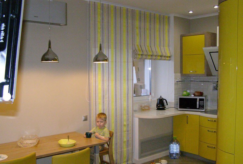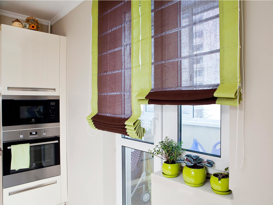 En un espacio de cocina estrecho, las cortinas con sistemas de elevación también son apropiadas: persianas romanas, persianas, persianas. No serán rechazados por un borrador, el tejido tiene una impregnación repelente a la suciedad, el mantenimiento del material es extremadamente simple. Además, puede ajustar el nivel de luz natural.