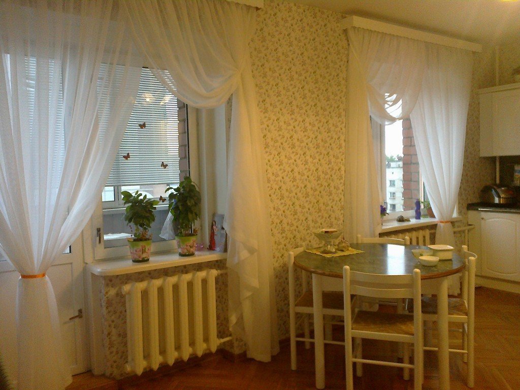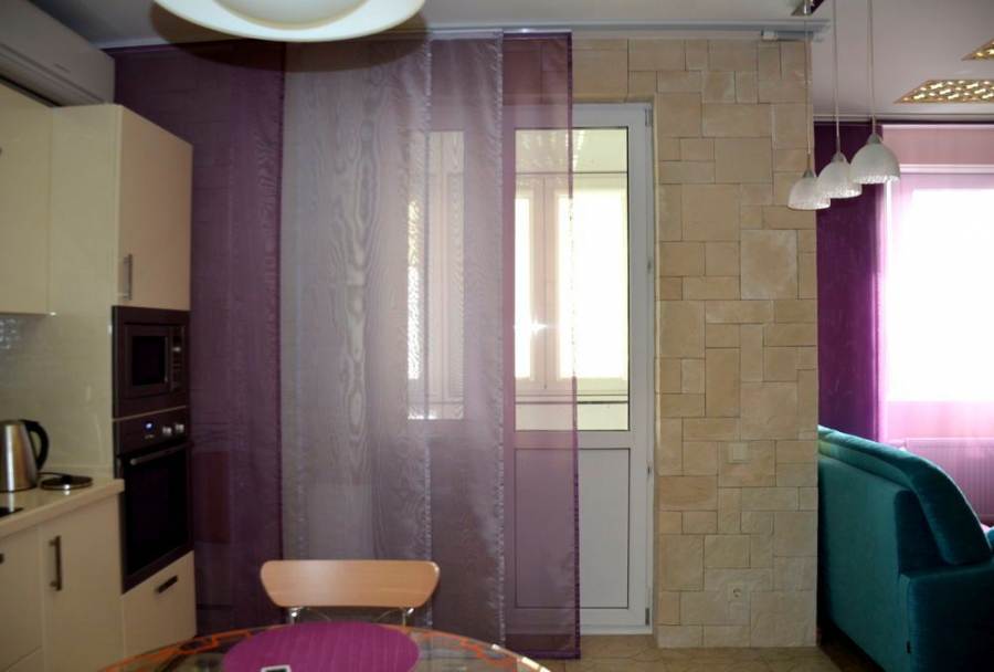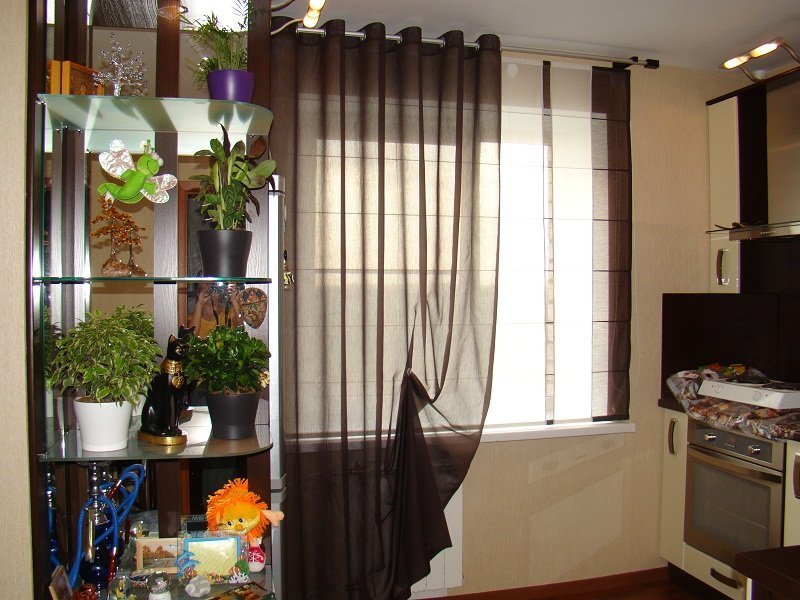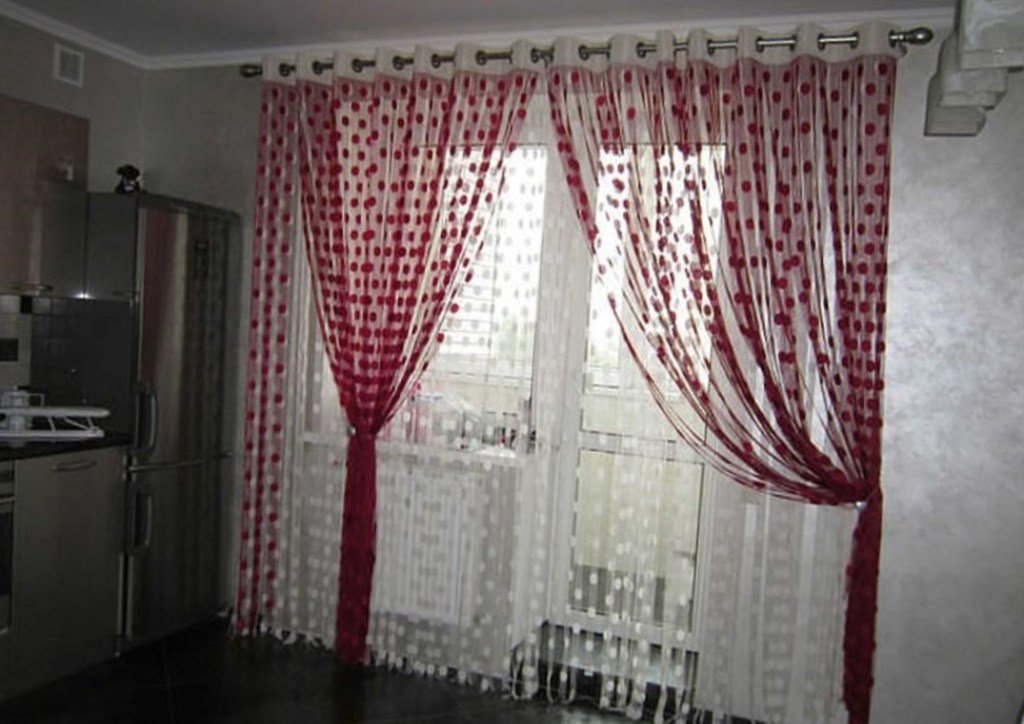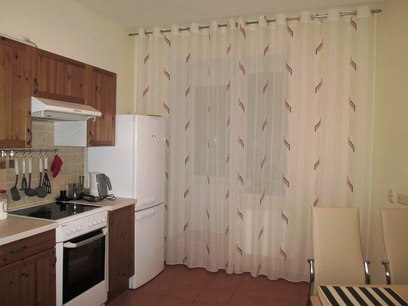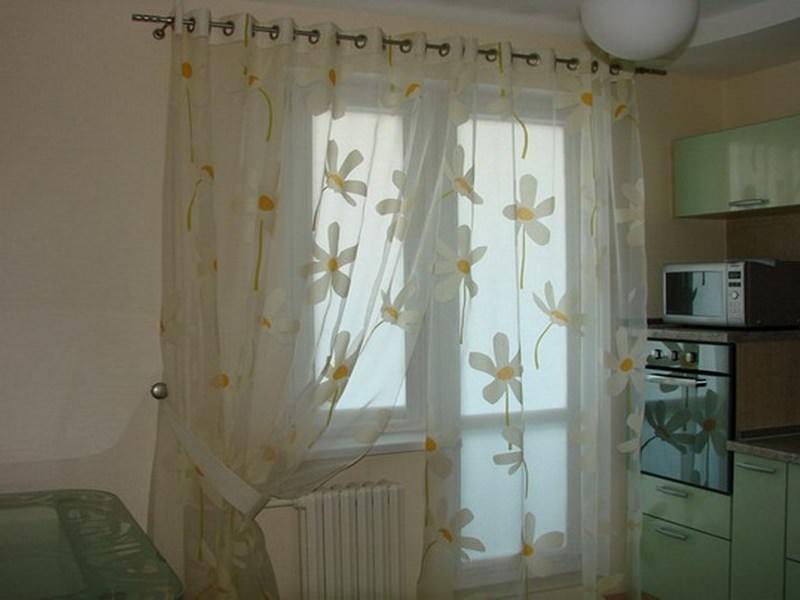 Es una tela delgada y translúcida que dispersa la luz del día y apaga el resplandor de la luz. Puedes usar una tela de tul. Al mismo tiempo, es importante que se mueva a lo largo de la repisa sin obstáculos, creando acceso al balcón. Conveniente a este respecto, cortinas en los ojales. Dan la impresión de pulcritud y son fáciles de mover. El color más común es el blanco. Una combinación de dos o más tonos se ve igualmente hermosa. El tul es un material inflamable, por lo que colocar esas cortinas al lado de la estufa no es la mejor solución.