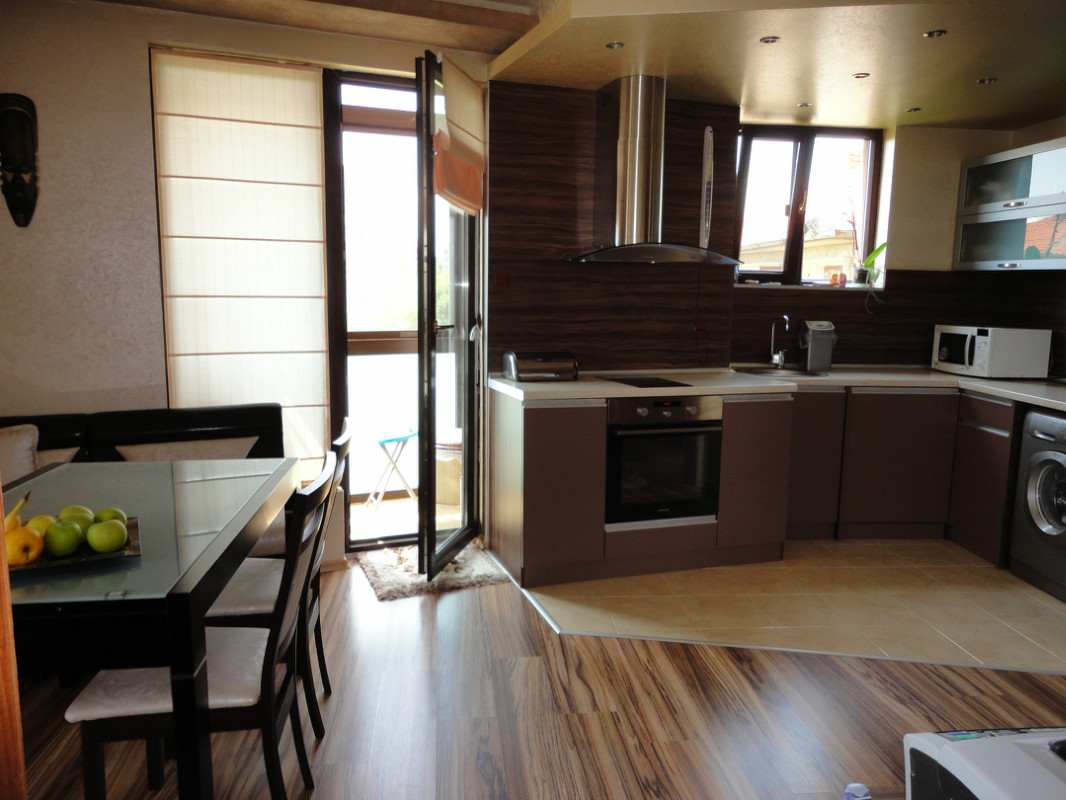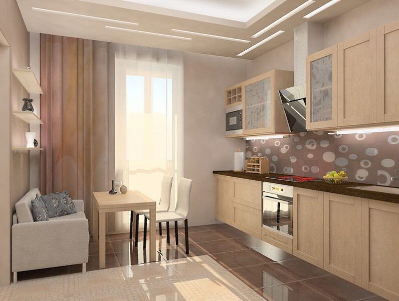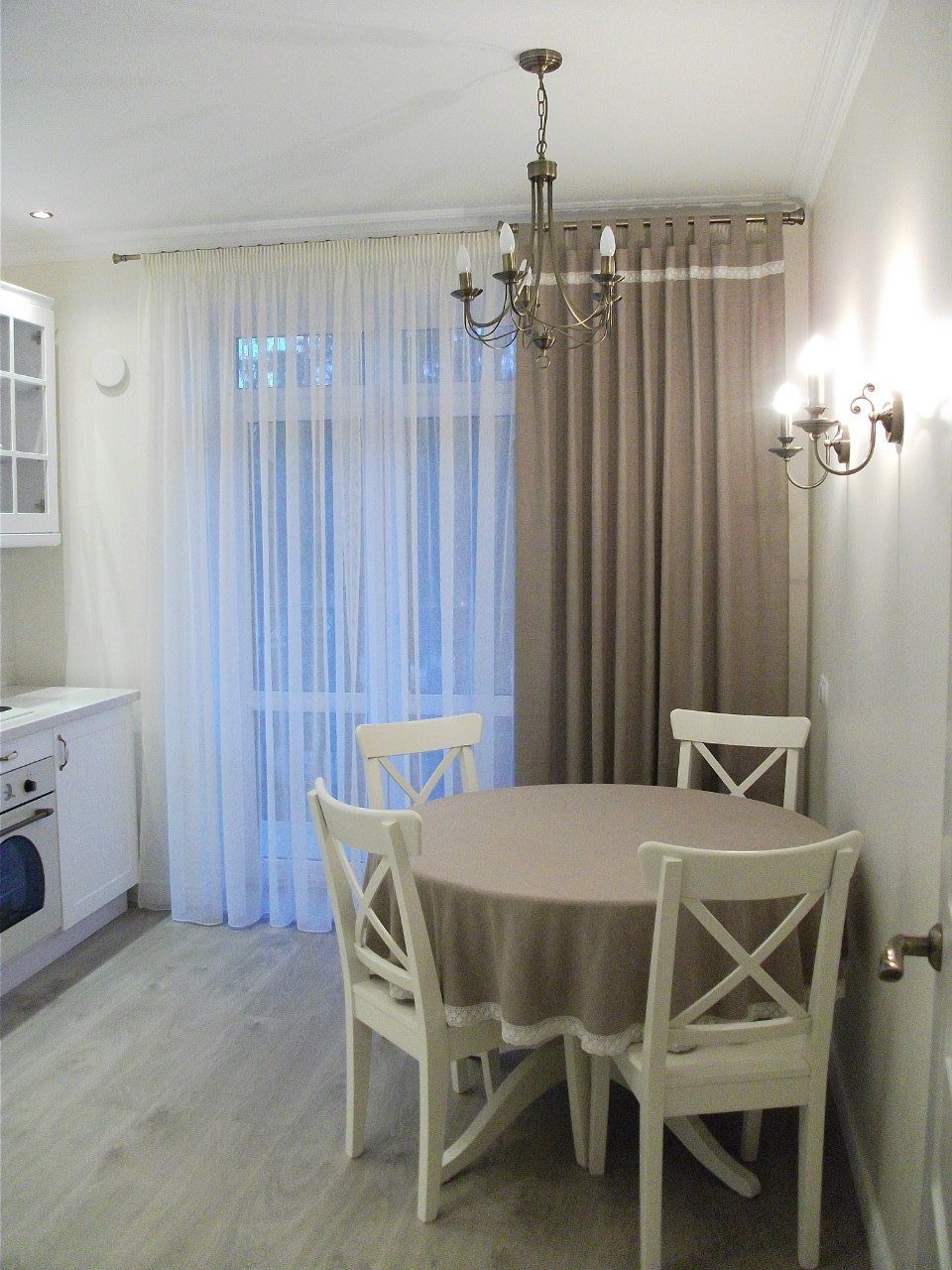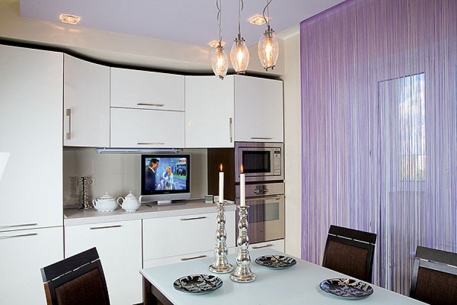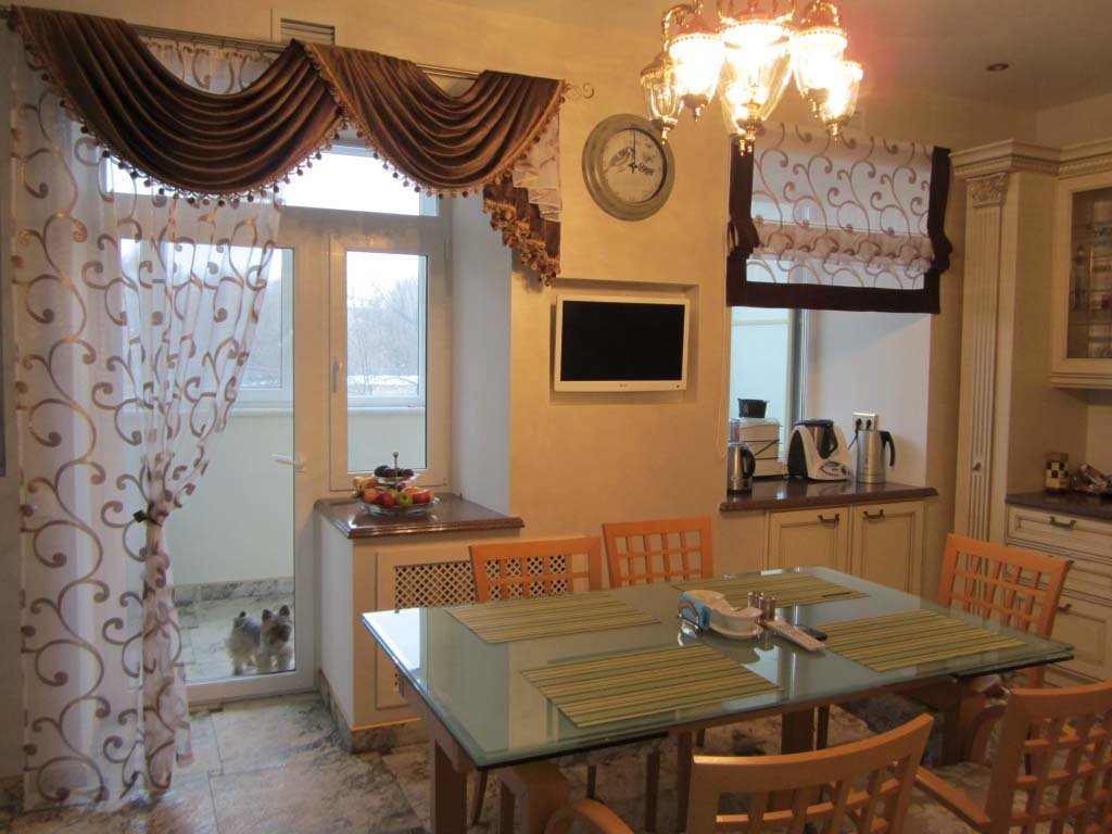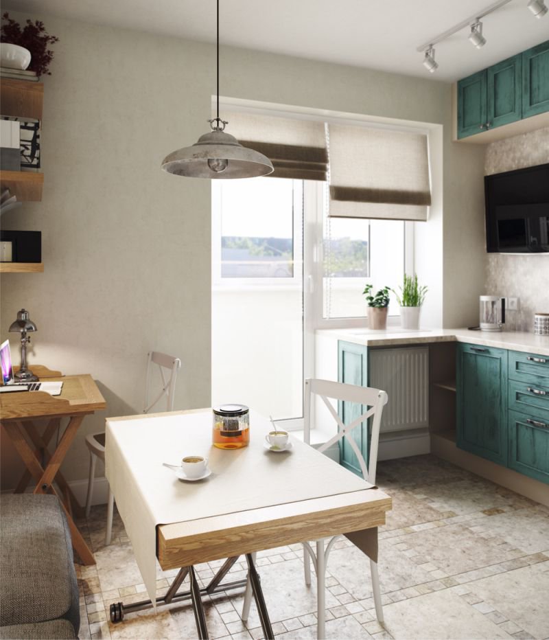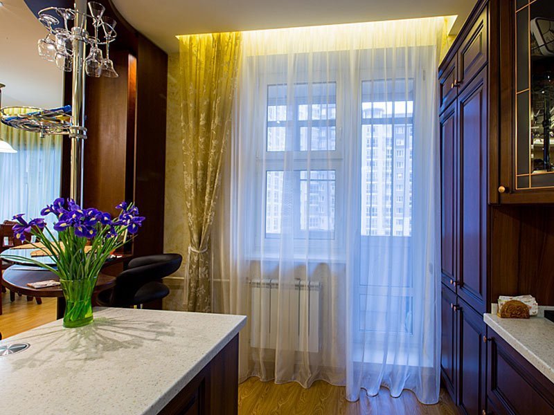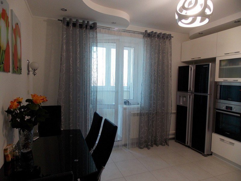 Iluminación Una cocina con balcón es peor que sin ella. Por lo tanto, se deben preferir materiales ligeros de un tono claro. Una excepción a esta regla son las grandes cocinas cuadradas, donde las cortinas oscuras solo decorarán la habitación, creando la impresión de riqueza y lujo.