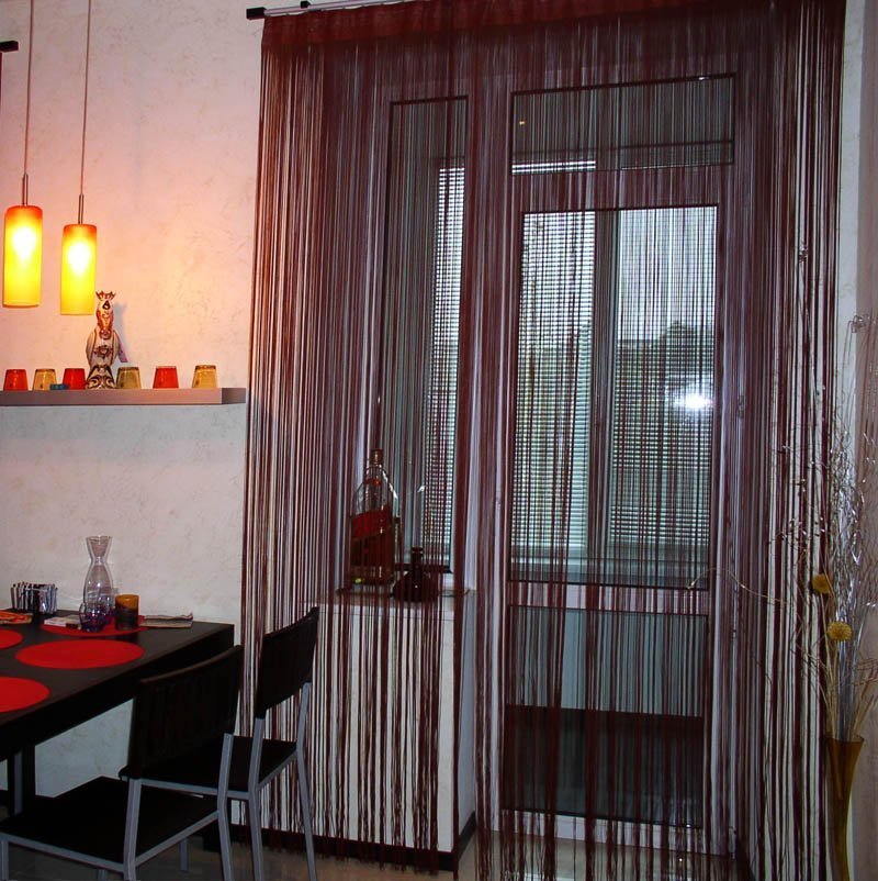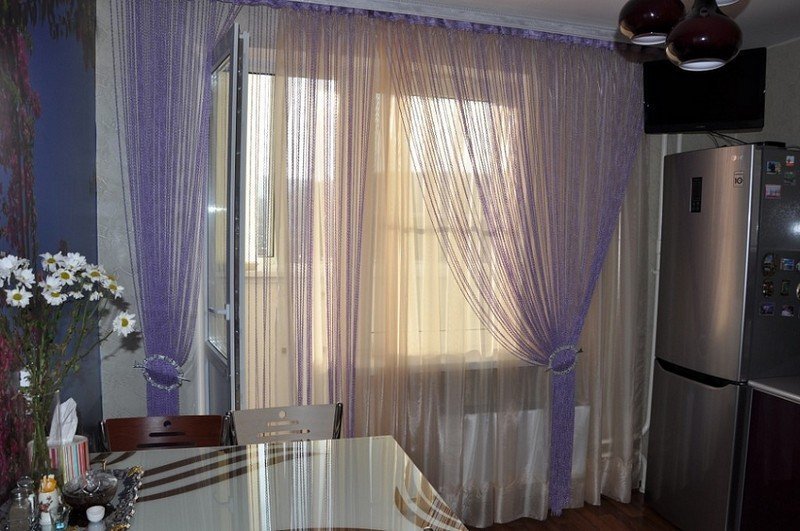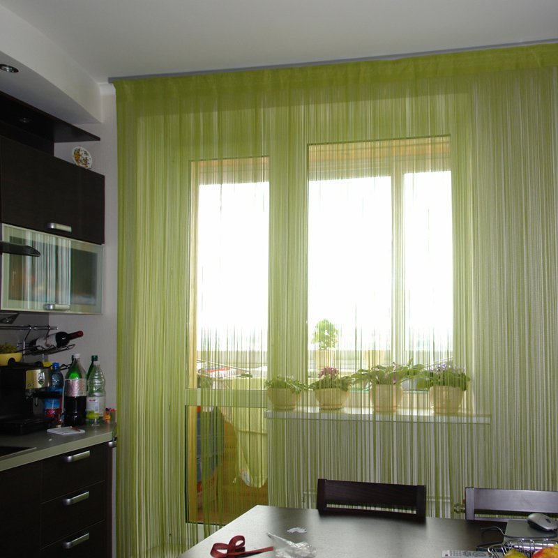Kiseya aumenta visualmente el espacio, por lo que las cortinas de hilo son una solución excelente para cocinas pequeñas y bajas, por ejemplo, en Jruschov. Puede combinar la cortina de muselina con textiles clásicos. El color de las cortinas puede ser simple. La transición gradual de colores o una combinación de hilos contrastantes se ve hermosa. La cortina de muselina es práctica y fácil de limpiar. Puede hacerlo usted mismo, especialmente porque nada está cosido y cortado al mismo tiempo. Lavar gatito es fácil.Para que los hilos no se enreden, se vendan en varios lugares.