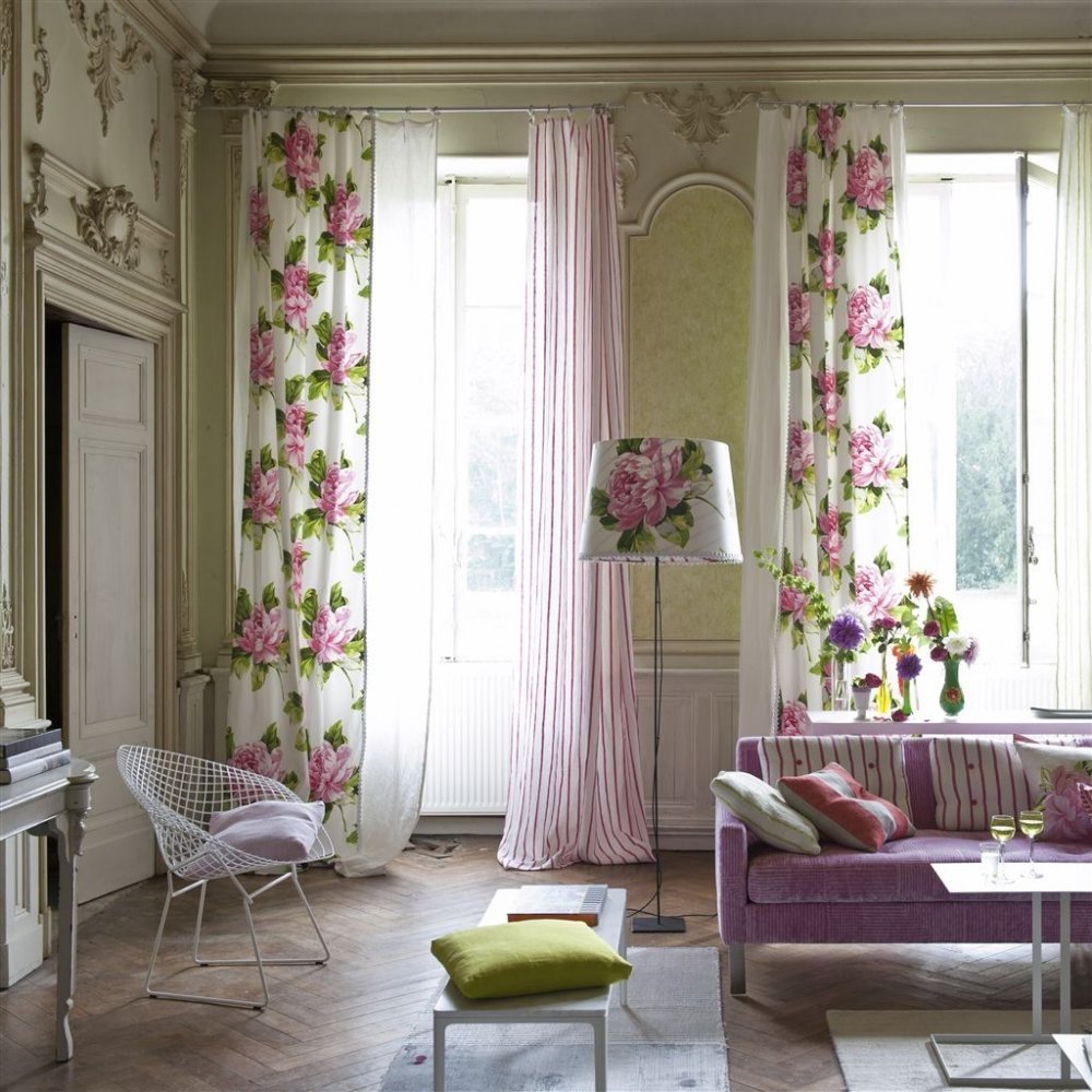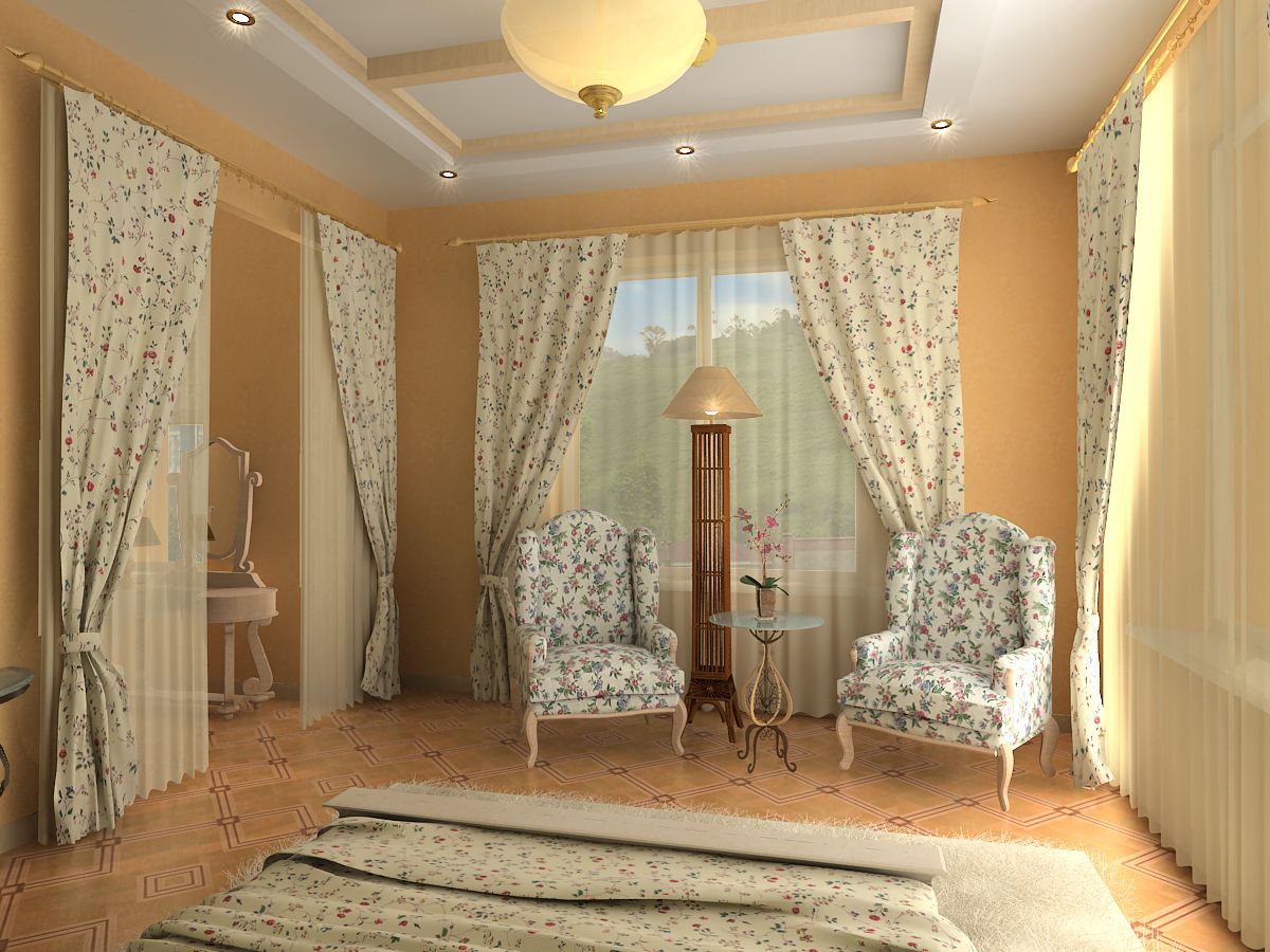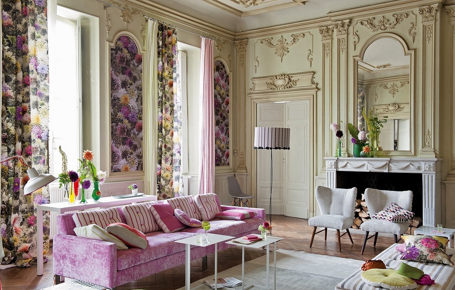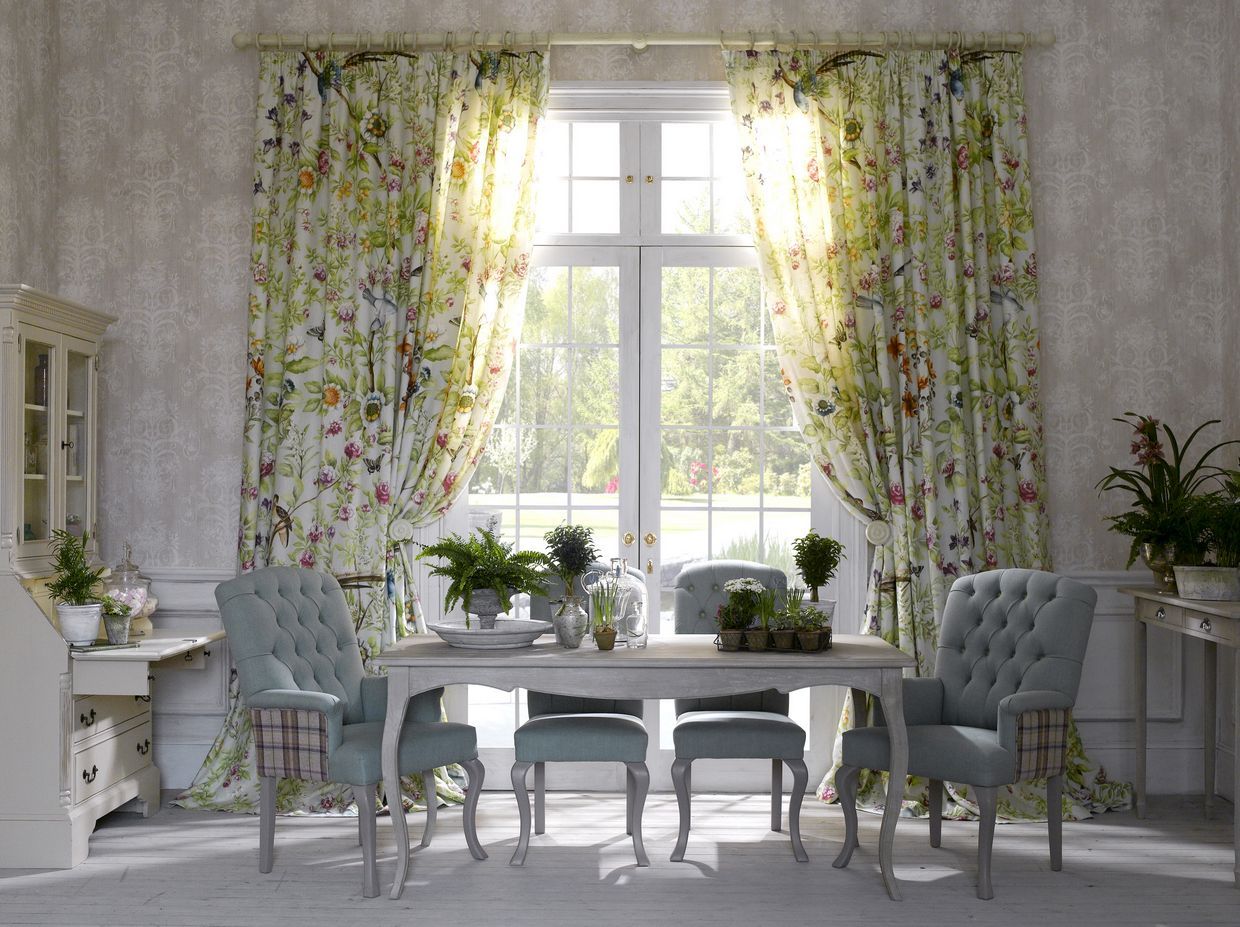 Las cortinas con adornos florales se adaptan a casi todos los estilos, excepto el techno y otros modernos, donde un estampado delicado se verá fuera de lugar. Se ven muy bien en el diseño de los siguientes estilos: