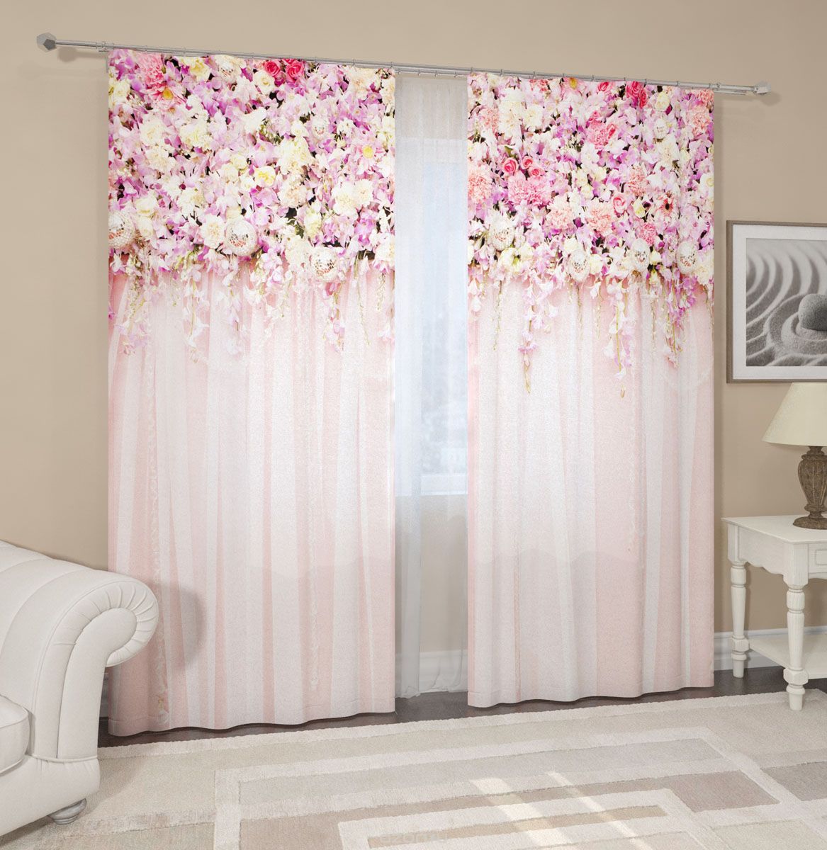 Estilo clásico: cortinas con numerosos capullos rosados de todos los tamaños.