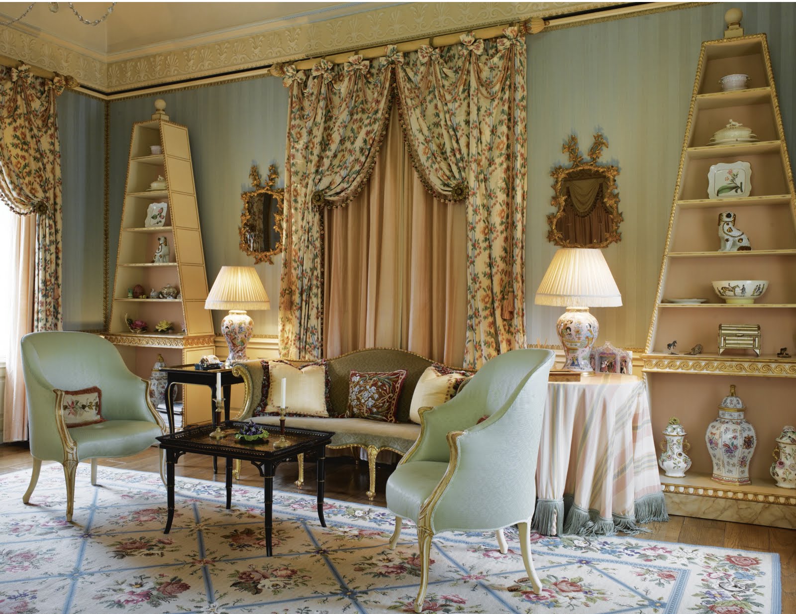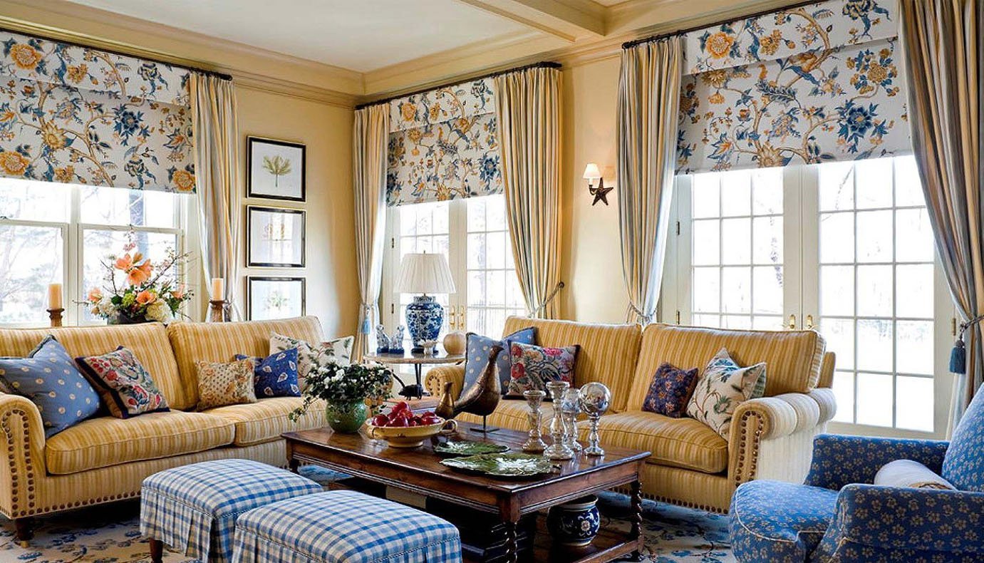 Un tono cobalto, la presencia de terciopelo en los elementos de los muebles, así como en los lugares, un patrón gráfico también ayudará a diversificar los clásicos. Jugar en contraste siempre es rentable. Alternativamente, puede elegir la esquina más sombreada de la habitación y colocar una silla amarilla brillante allí. Las mismas salpicaduras brillantes deben estar en la cortina. Esta opción tampoco está mal: cortinas romanas con flores grandes, un interior con accesorios de un color que destacan por su brillo. Negro intercalado allí, pero de vez en cuando.
