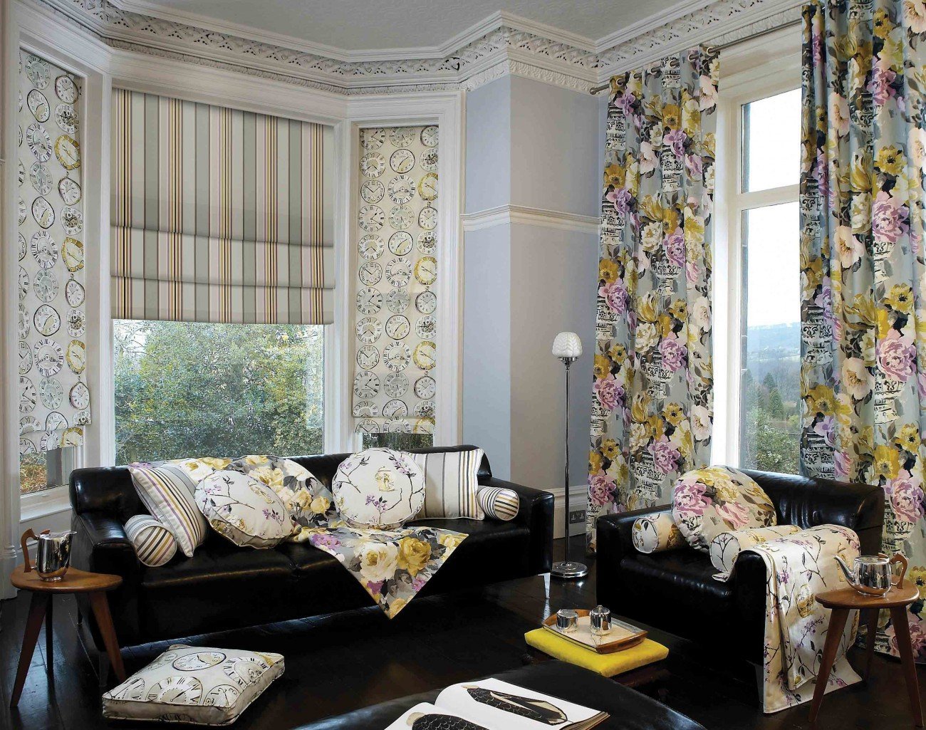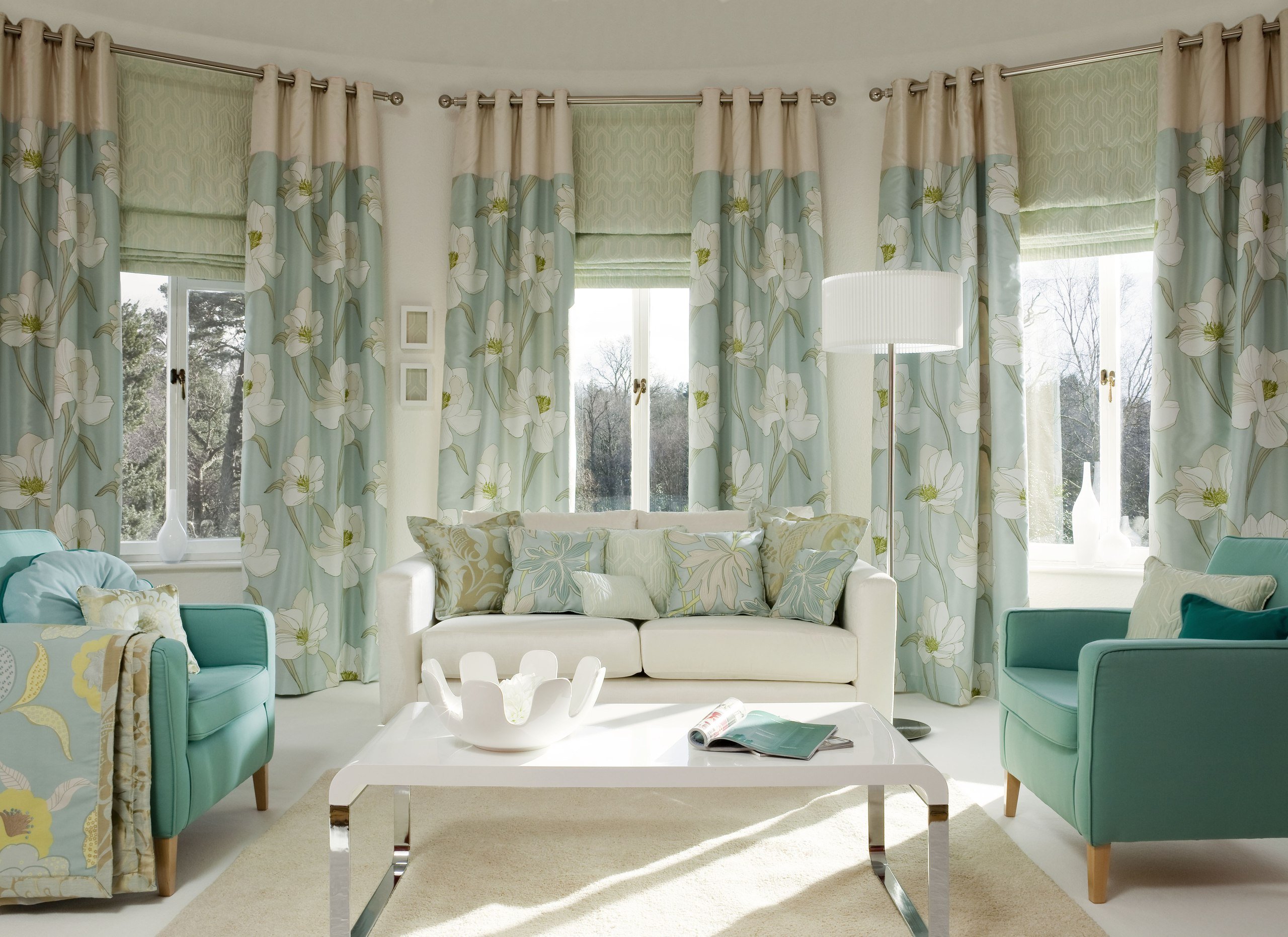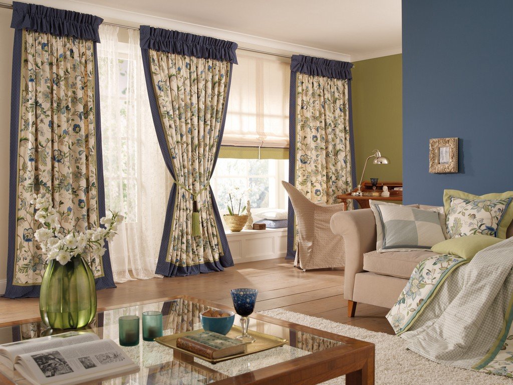 Las cortinas con decoración floral se seleccionan para combinar con el papel pintado o los muebles. Por ejemplo, si el sofá está hecho en tonos grises, las cortinas se deben combinar con este color. Al mismo tiempo, las almohadas ubicadas descuidadamente en el lugar de descanso deben contener un patrón similar. Se ve bien la opción de diseño combinado. Los colores azul y blanco están probados en el tiempo. Y si le agregas acentos amarillos, todo brillará con colores solares.