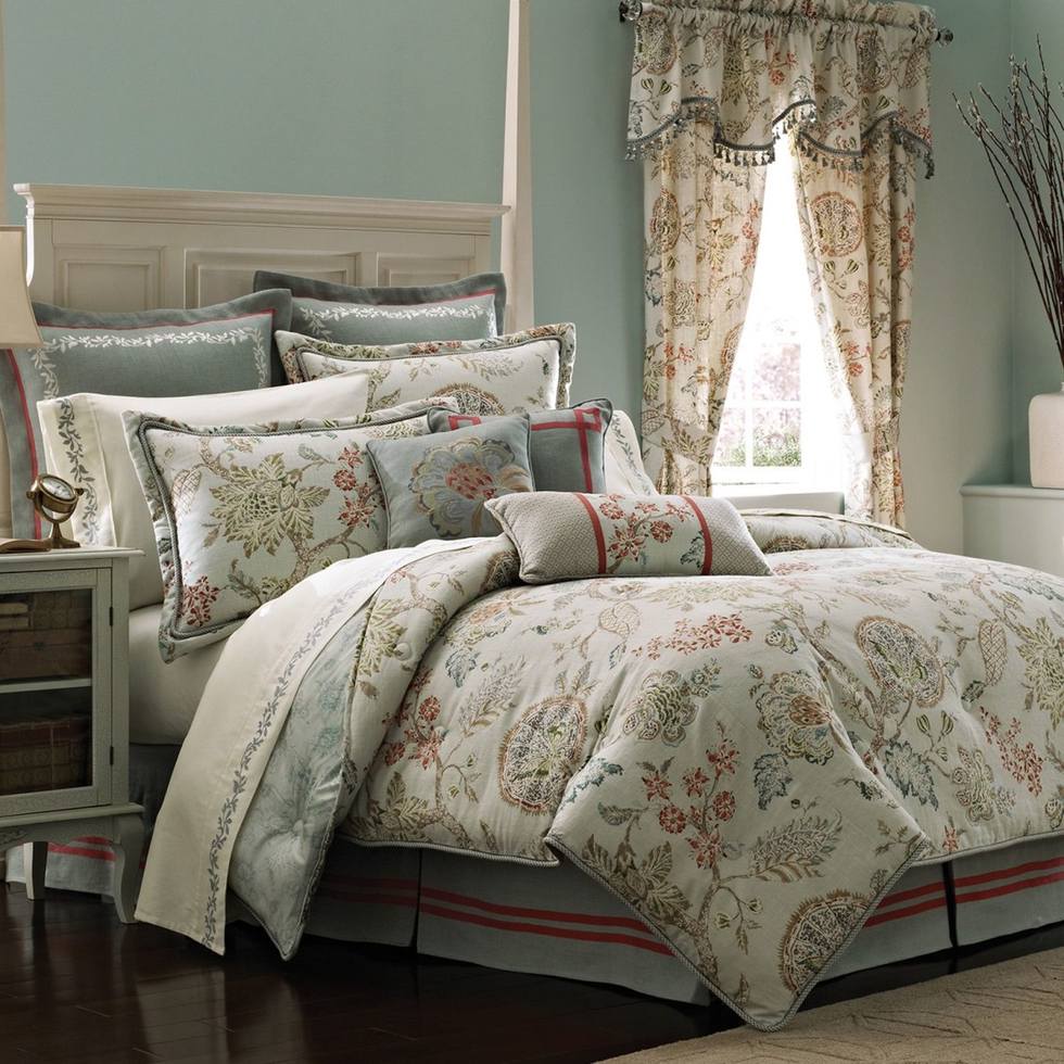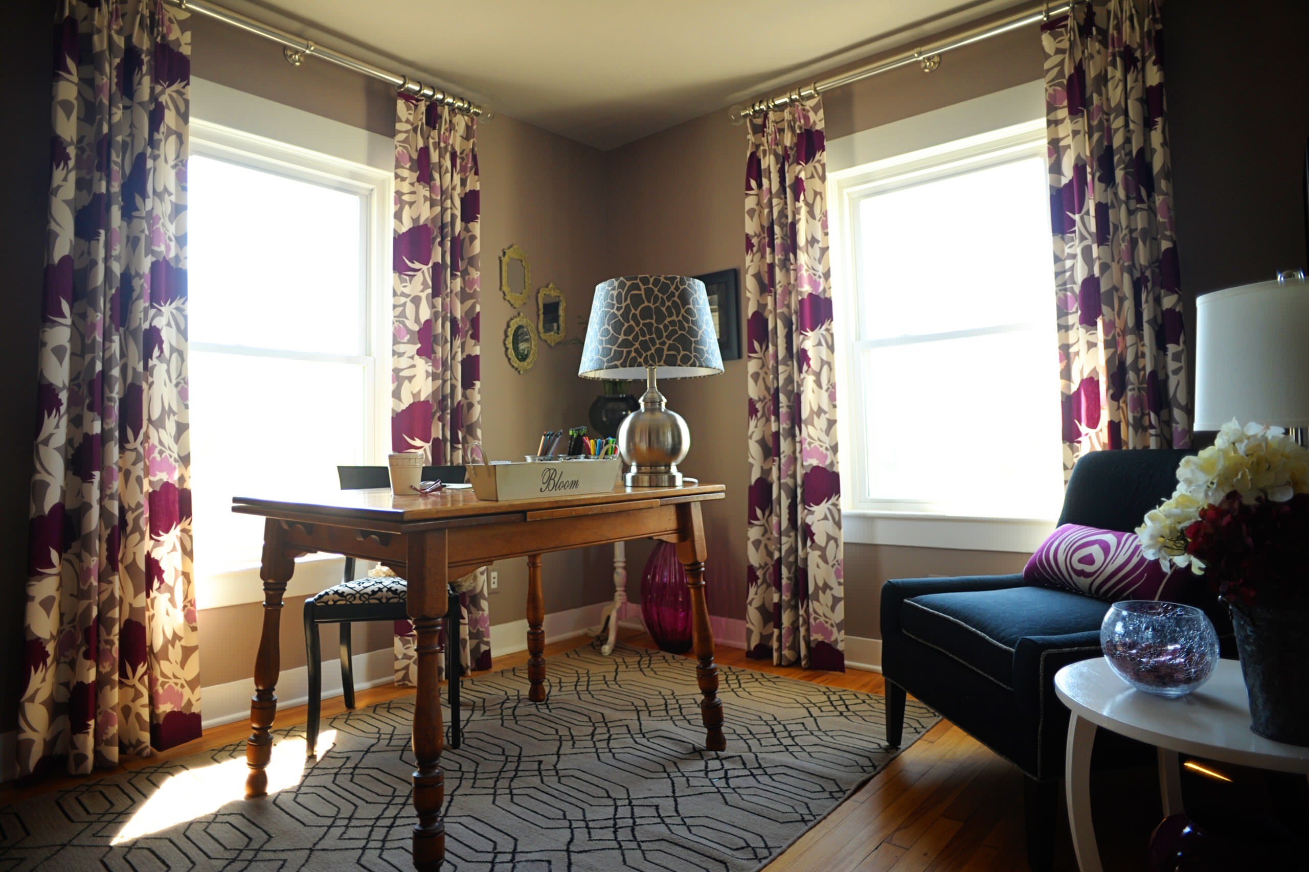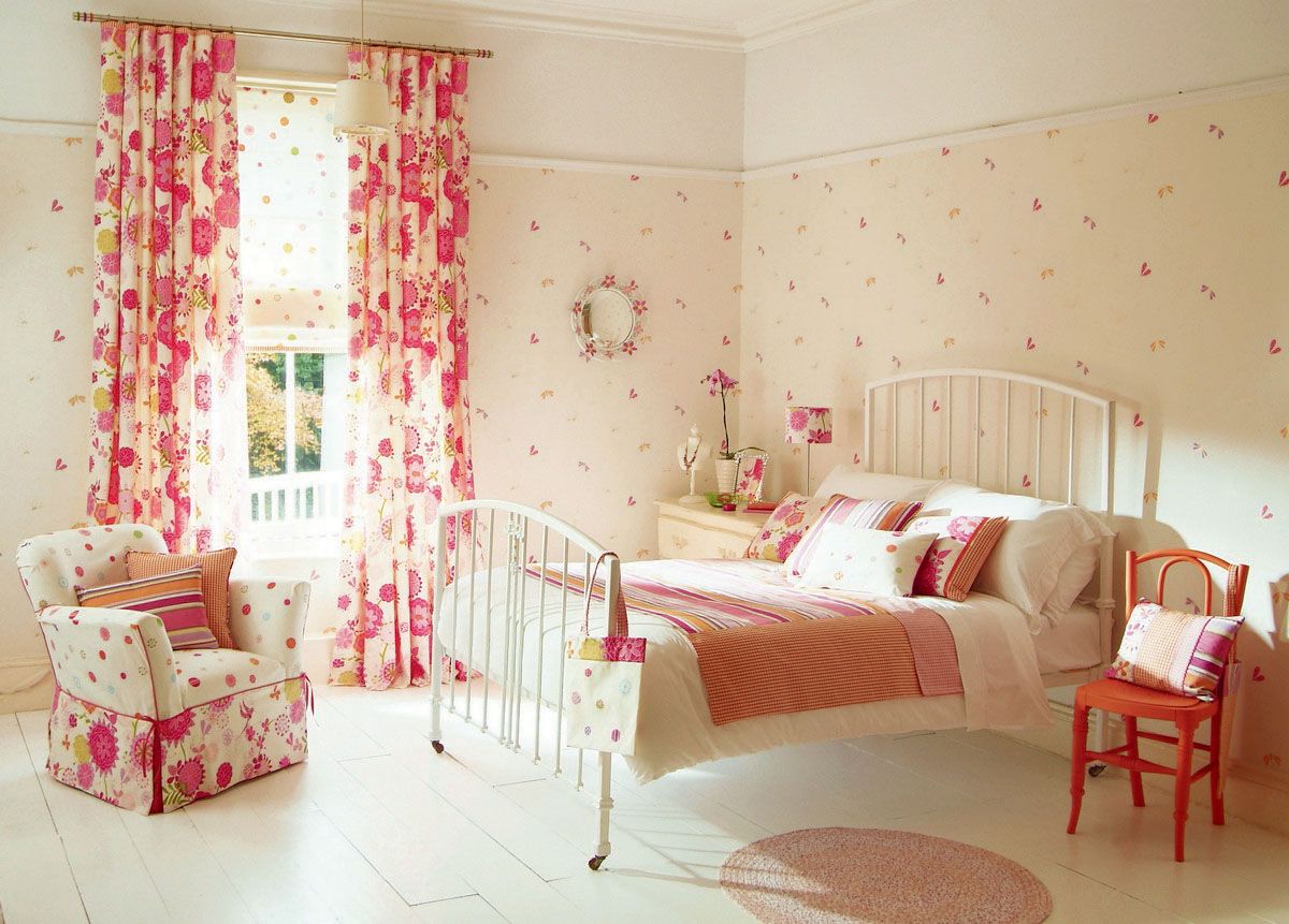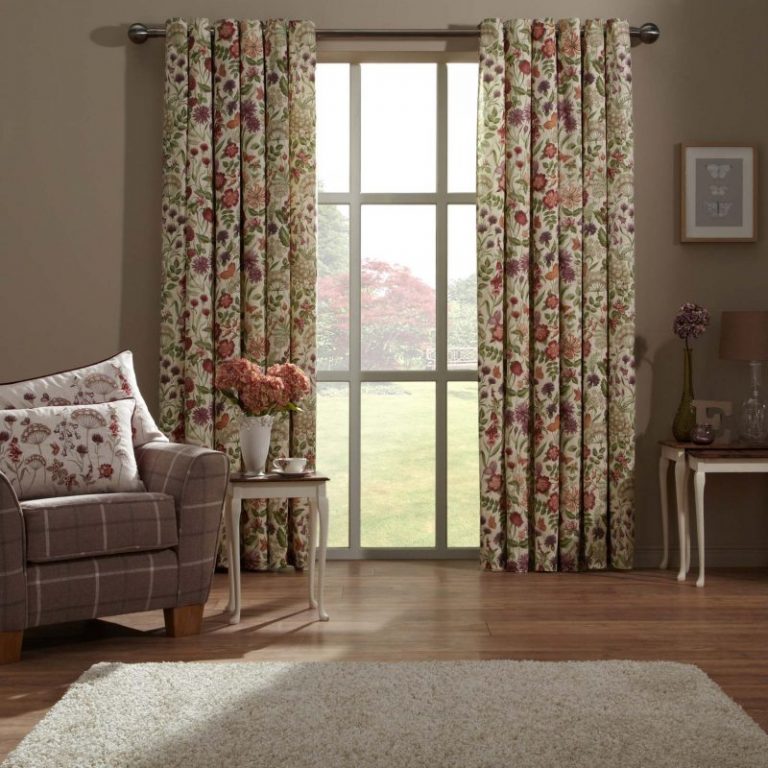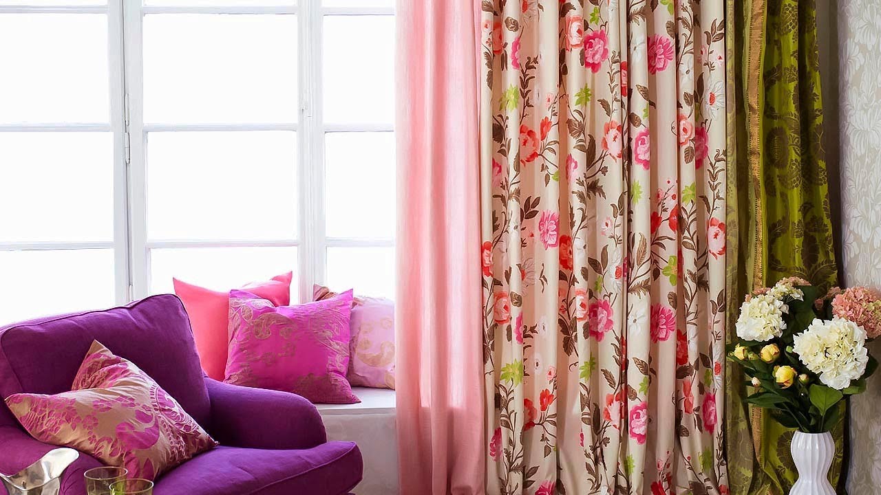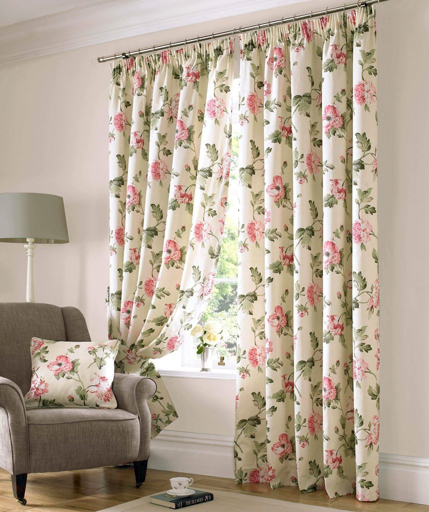 Características de la decoración de la habitación con cortinas con estampado floral.