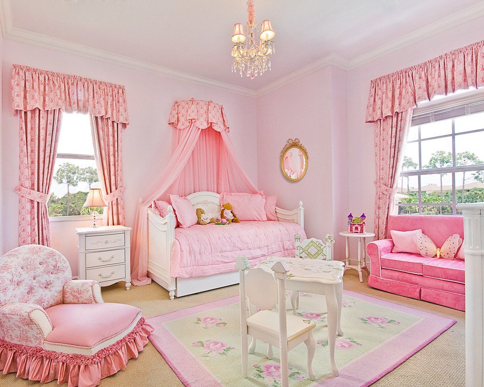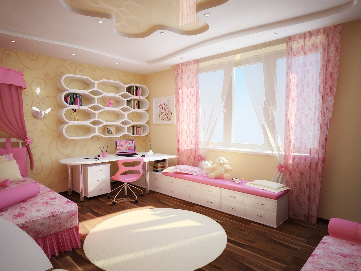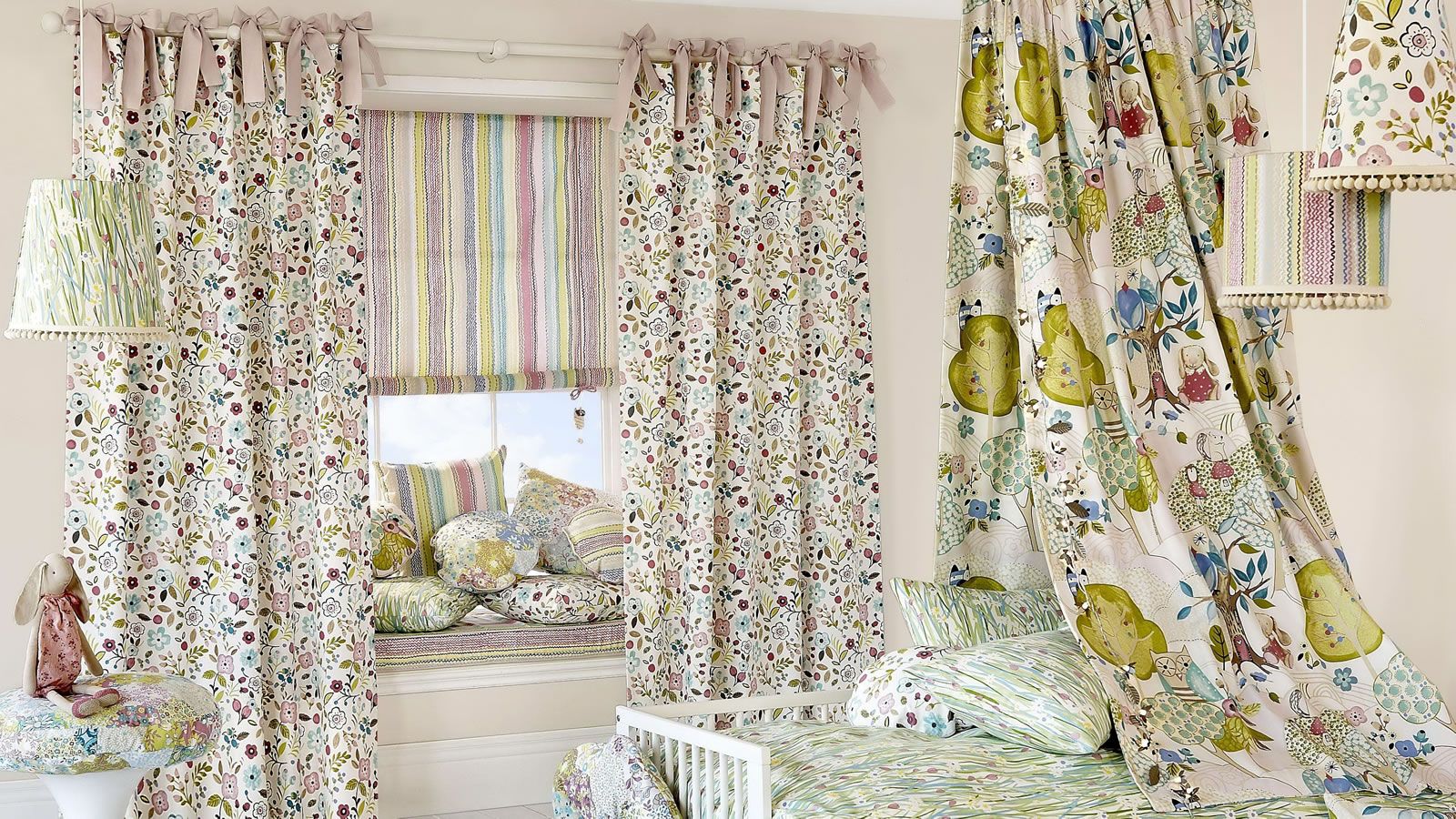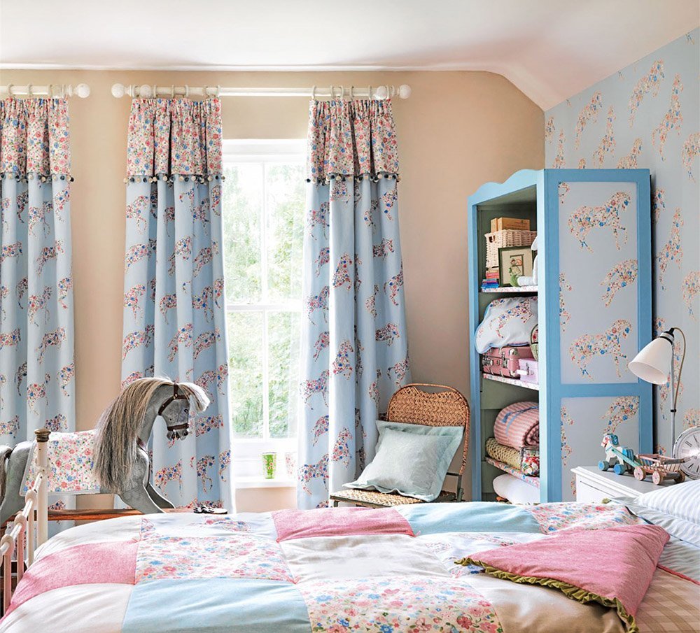 Las cortinas rosadas de color azul pálido hechas de telas simples de alta calidad crean una atmósfera de seguridad, estabilidad y comodidad en la habitación de un niño. Una pequeña flor agrega ternura. Dependiendo del género del niño, puede elegir el tono correcto. Dichas cortinas son más adecuadas para bebés o niños de hasta 2 años. Los niños mayores estarán encantados con tonos más jugosos con elementos de dibujos animados. Las flores se pueden esparcir en las cortinas, como dibujadas por la mano de un niño o hechas en un voluminoso gráfico de computadora.