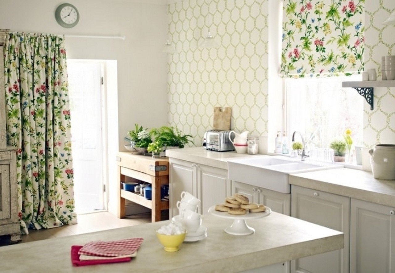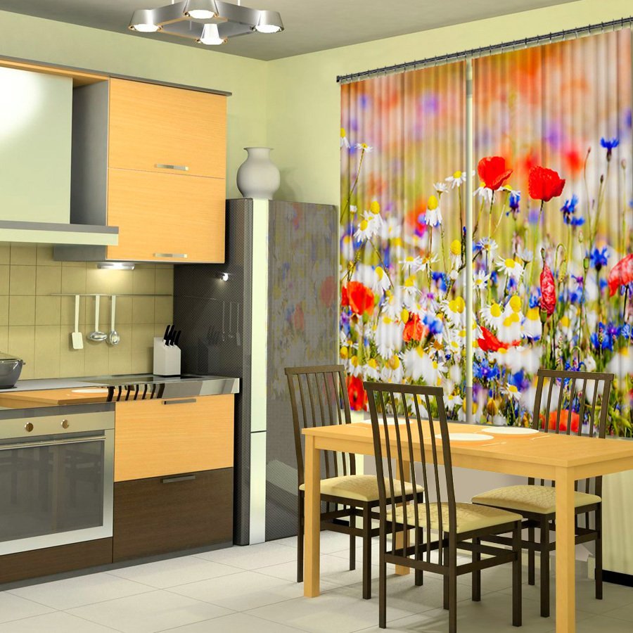 La cocina es un lugar de cocina y privacidad tranquila. Al elegir un producto de cortinas, debe decidir cuál será su función principal. Si está destinado solo al diseño estético de la ventana, entonces son adecuados lienzos translúcidos, delicados e ingrávidos con pequeñas flores apenas perceptibles. En el caso de que las cortinas sean más necesarias para ajustar la iluminación, puede detenerse en las cortinas romanas con flores grandes. Pero solo si la cocina es amplia con techos altos. Los lienzos con pastillas, que decoran simultáneamente el modelo, lo protegen de un quemador ardiente, serán relevantes. Si la cocina está hecha en un estilo clásico simple, las mismas cortinas clásicas con un patrón que son varios tonos más claros que todo el fondo encajarán allí. Las cortinas cortas y exuberantes se consideran las más prácticas y más utilizadas en la cocina.