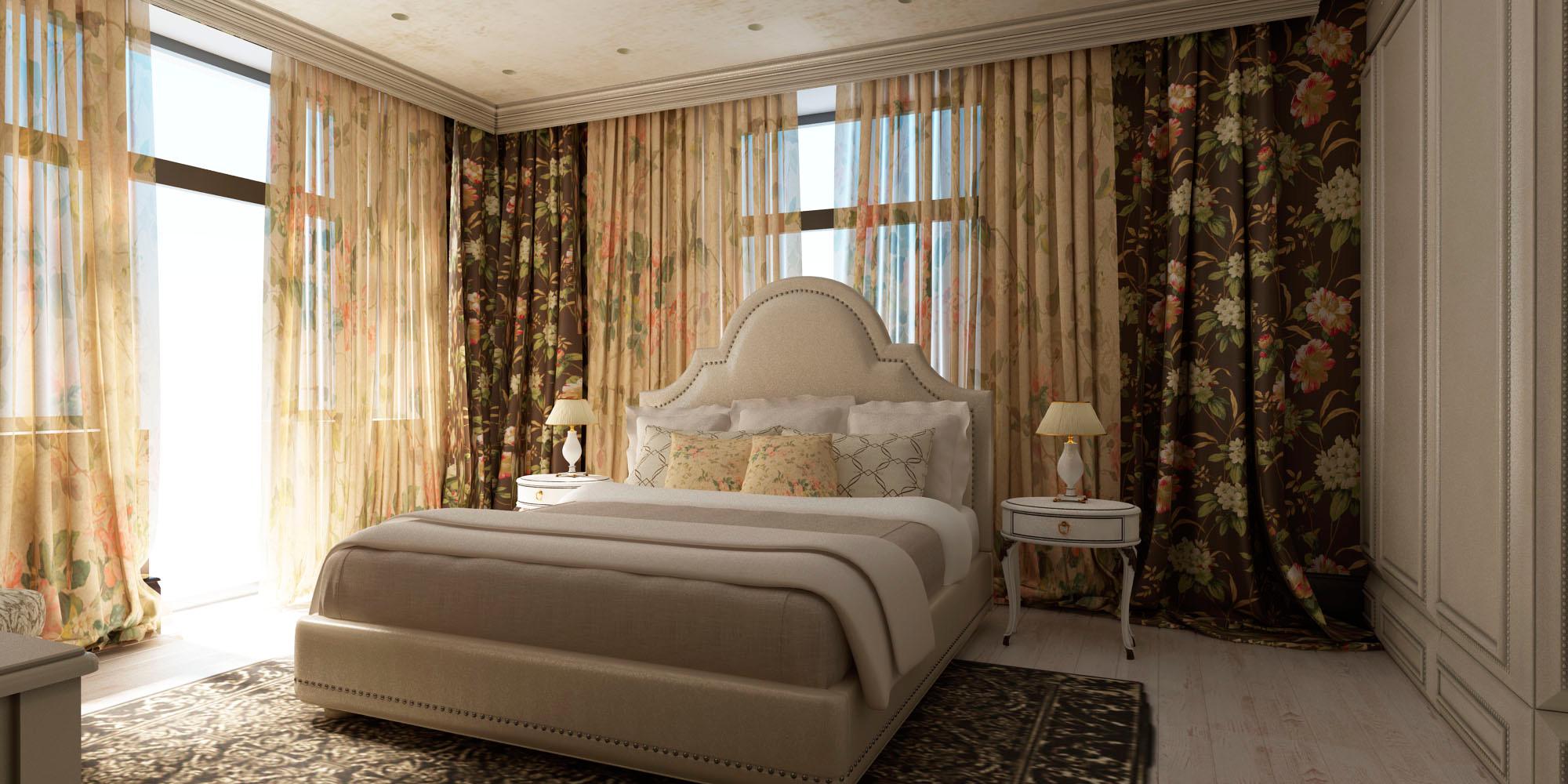El diseño interior de la habitación debe ser misterioso, amortiguado, calmar la vista y descansar. Este es un lugar de soledad para una o dos personas, lo que significa que todo en él debe hablar sobre gustos, características de la vida, contener algunos detalles exclusivamente individuales. Las cortinas con flores brindan paz, una sensación de confort en el hogar, una atmósfera de relajación y son relevantes en el dormitorio como en ningún otro lugar.Deben fusionarse con el estilo general y combinarse en tonos con elementos de la cama. Por ejemplo, si las cortinas son suaves o de color púrpura oscuro, la ropa de cama debe hacerse en el mismo tono y con un patrón similar. En este caso, el tamaño de las flores no juega un papel especial. Lo principal es que no debería haber demasiados, y no debería haber una sensación de pegajosidad.