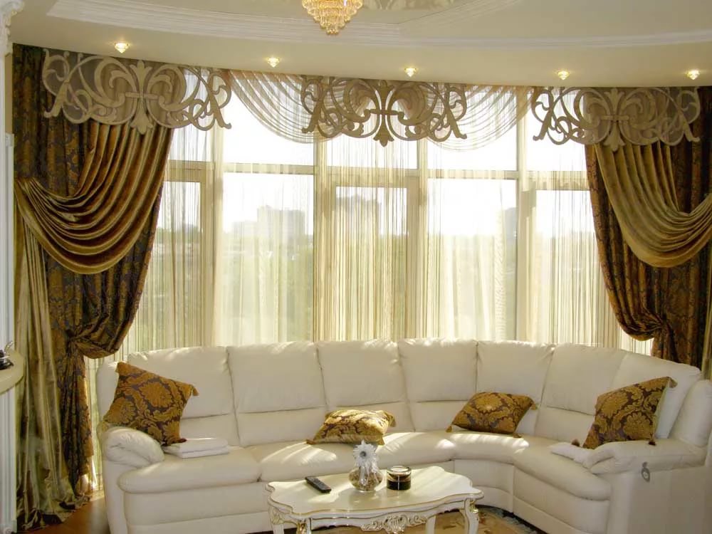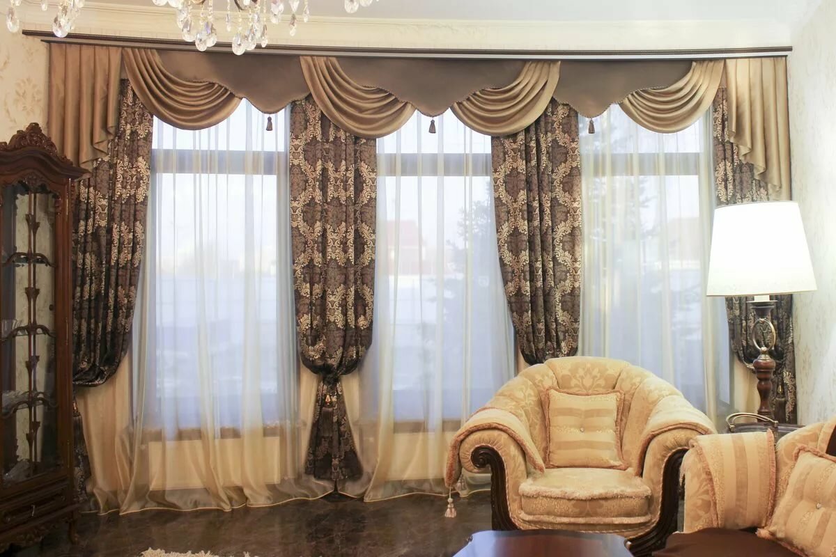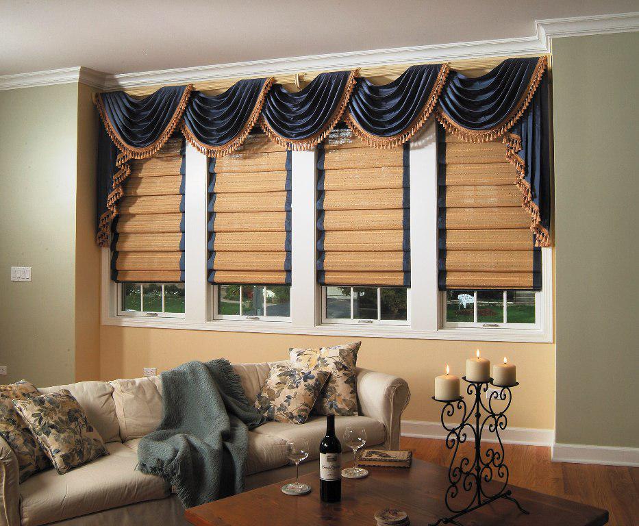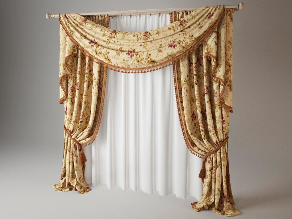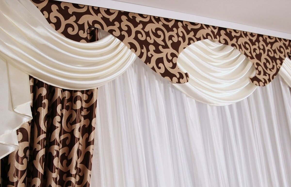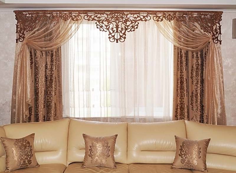 Para crear un lambrequin combinado, deberá colocar una barra adicional cerca de la cornisa. Esto ayudará a enfatizar la altura de los techos. Conjuntos decorativos complejos constan de varios componentes. Al elegir la forma, el tipo de material y el color, debe entenderse que, independientemente del diseño de las cortinas, dichos elementos atraerán la máxima atención.