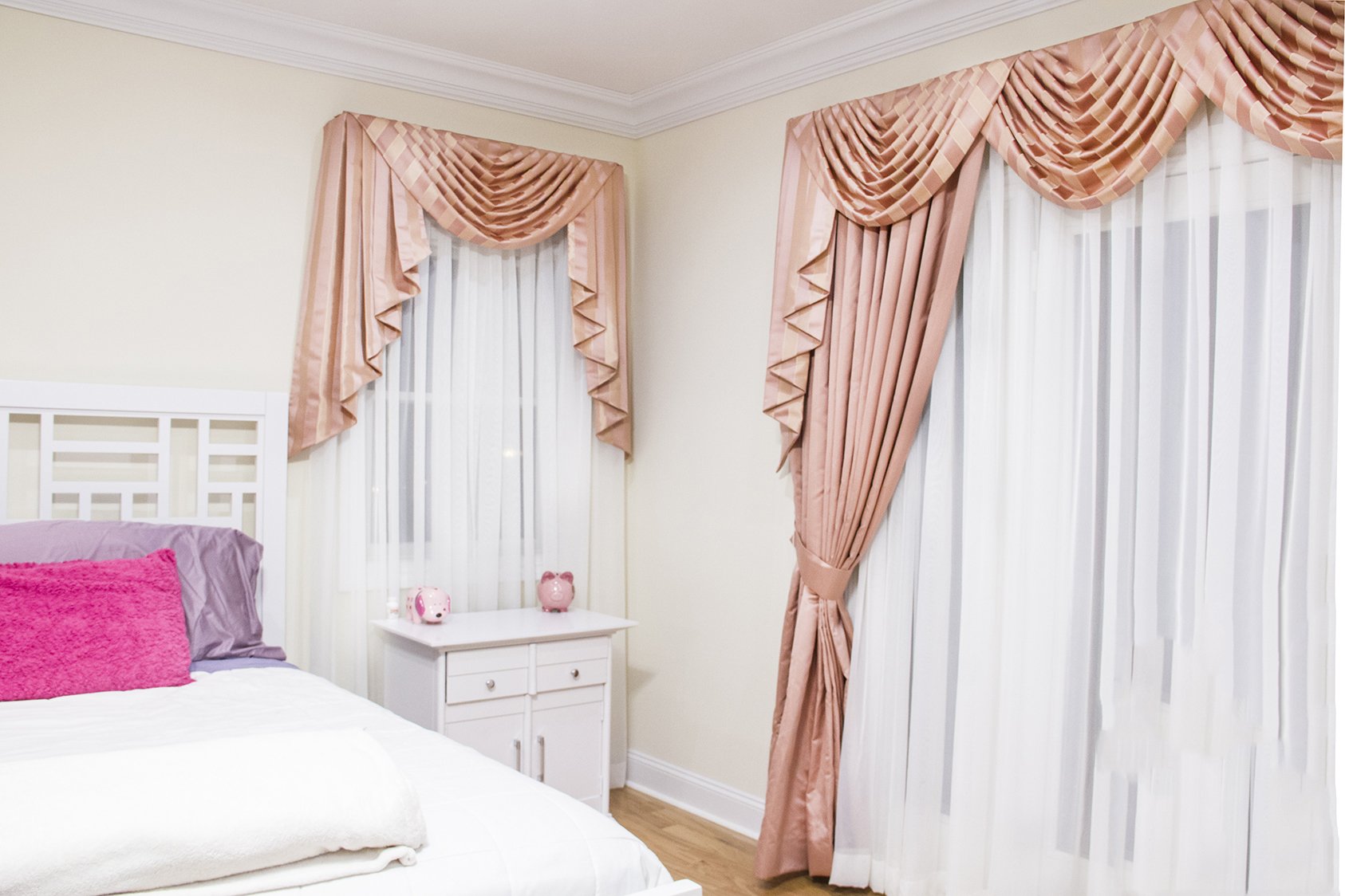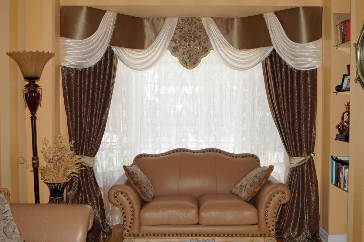 La combinación de una base rígida y cortinas suaves se ve sólida y elegante. En cualquier caso, será una decoración elegante y elegante. Las telas se pueden colocar en capas y alternar en cualquier orden, creando formas elegantes e interesantes.