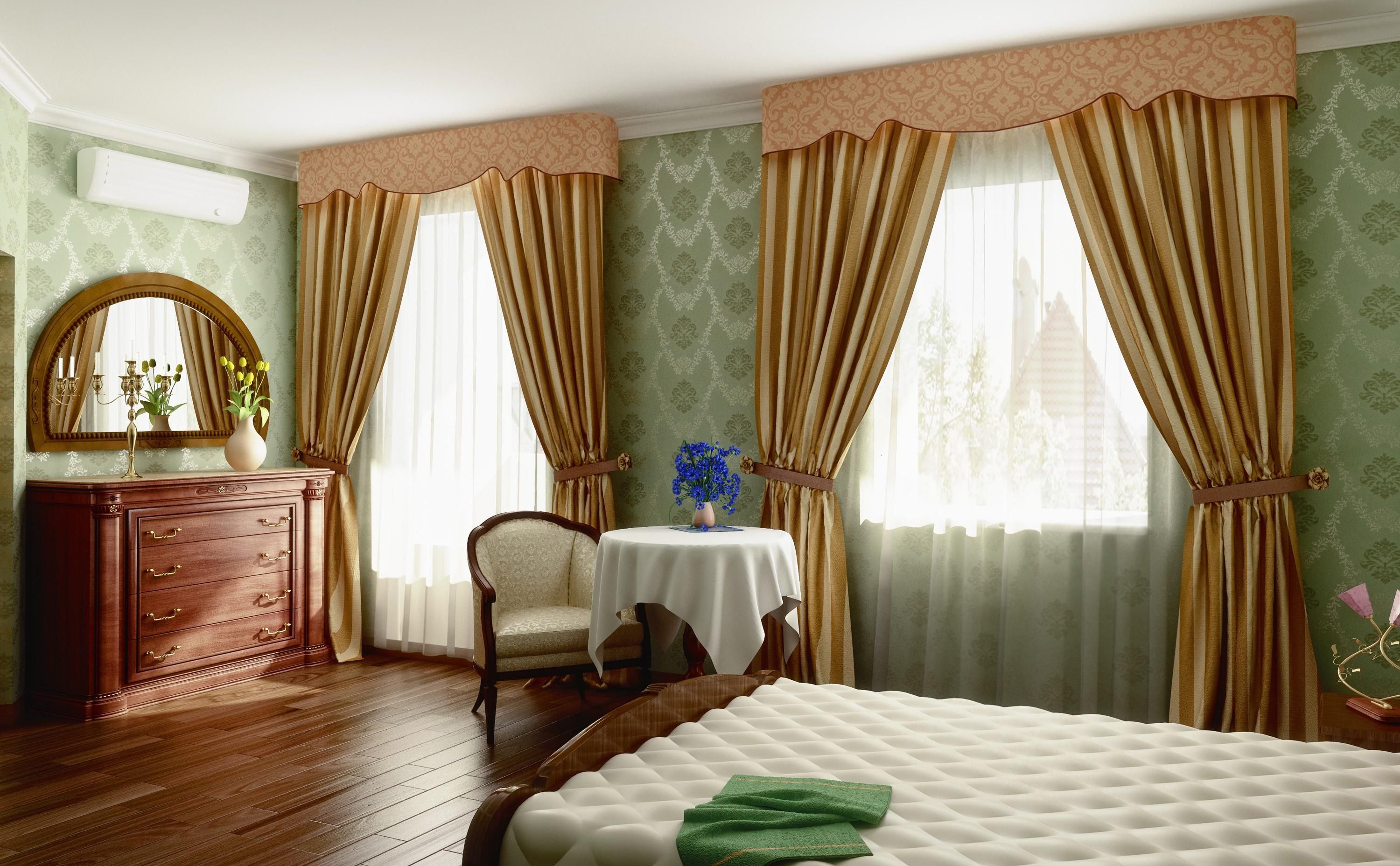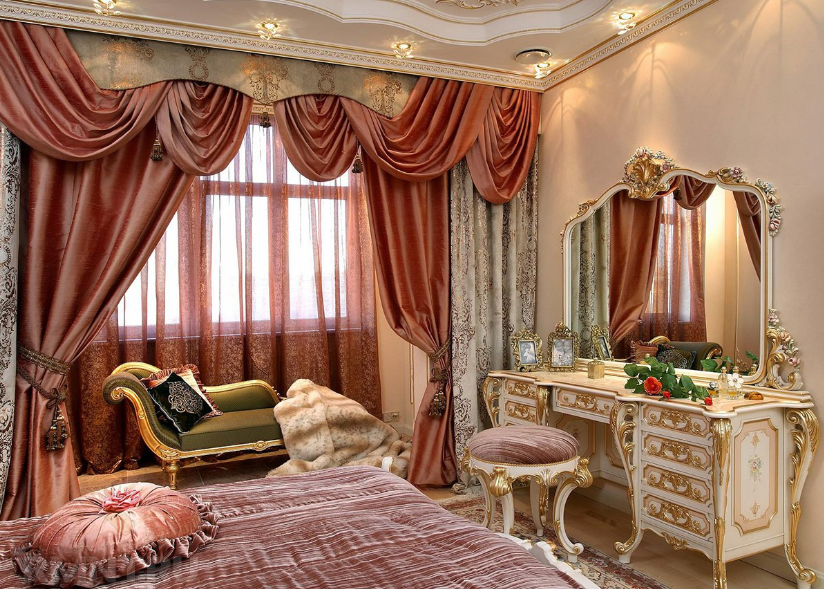 Al dormitorio Las cortinas de luz con una cantidad mínima de decoración se verán bien. El tono del textil debe coincidir con el tono general del acabado. Puede ser idéntico o contrastante. Para el baño y el sueño, las composiciones multicapa que combinan varios colores son adecuadas.