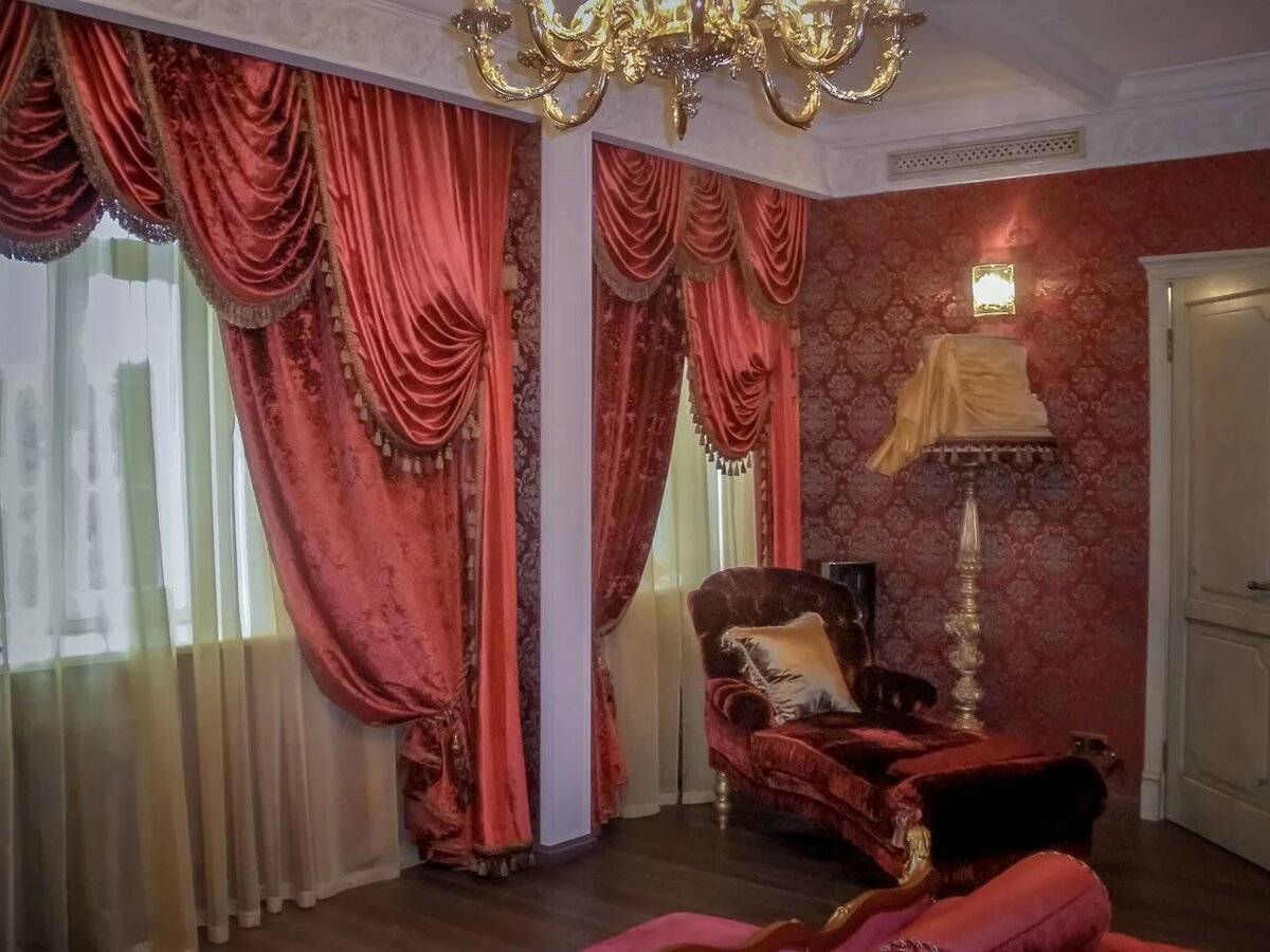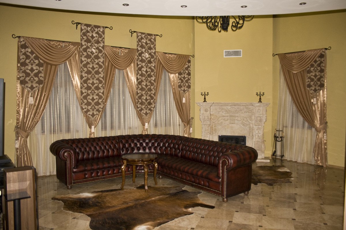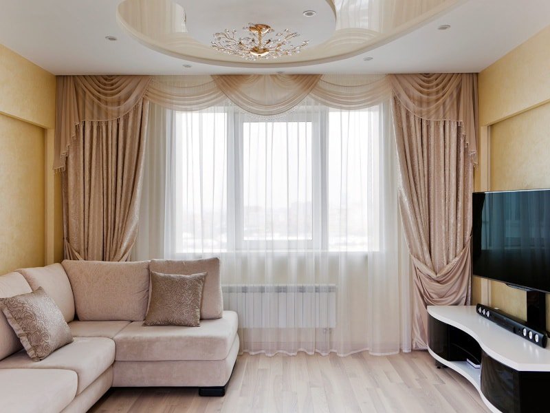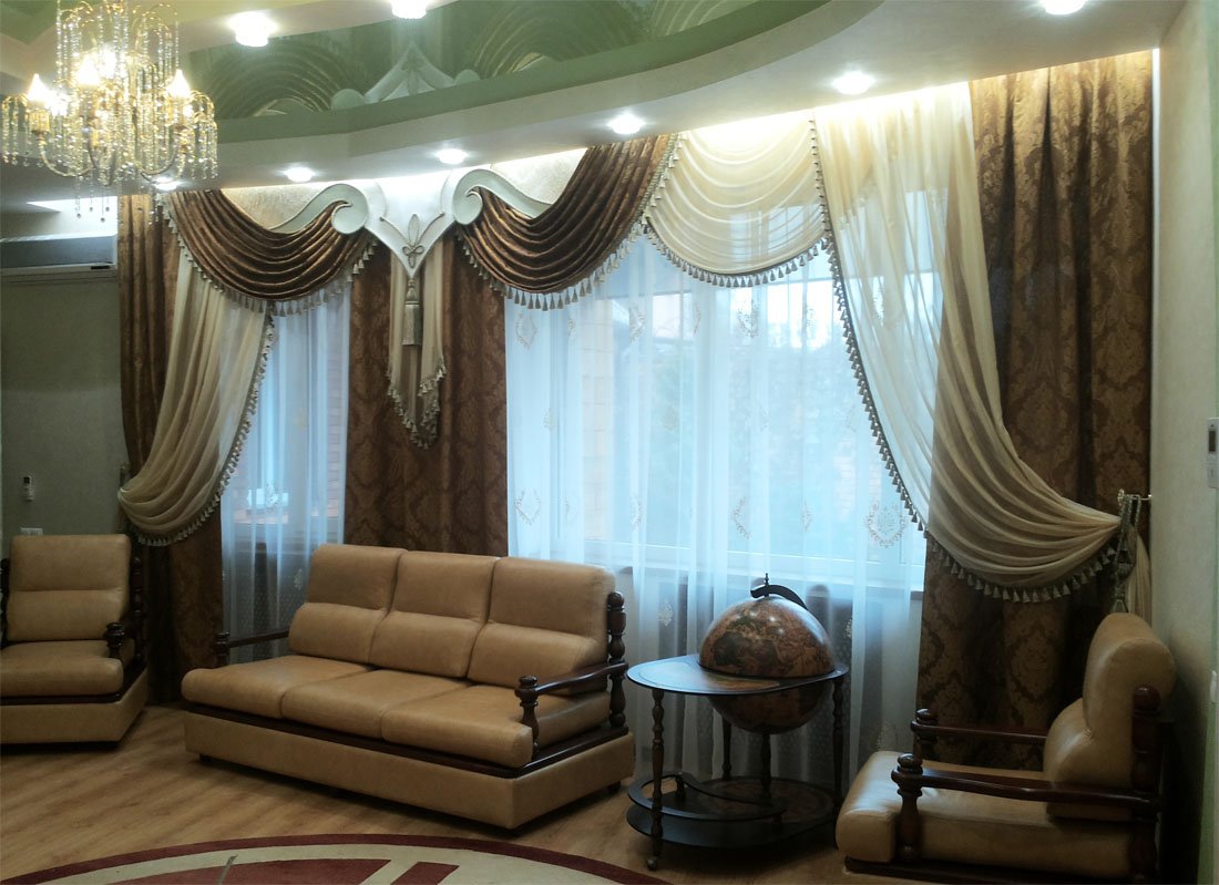 Para la sala de estar, hall. Las cortinas de cualquier tipo son adecuadas, combinadas con el interior general. La opción difícil hará que la habitación sea estricta, formal, suave: agregue notas románticas y lúdicas. Tejidos adecuados: terciopelo, gabardina, terciopelo, velo, organza.