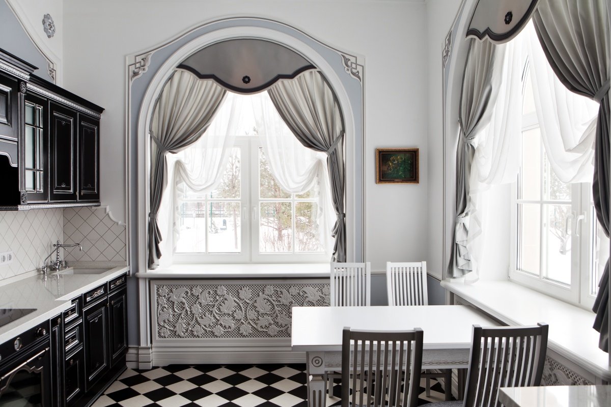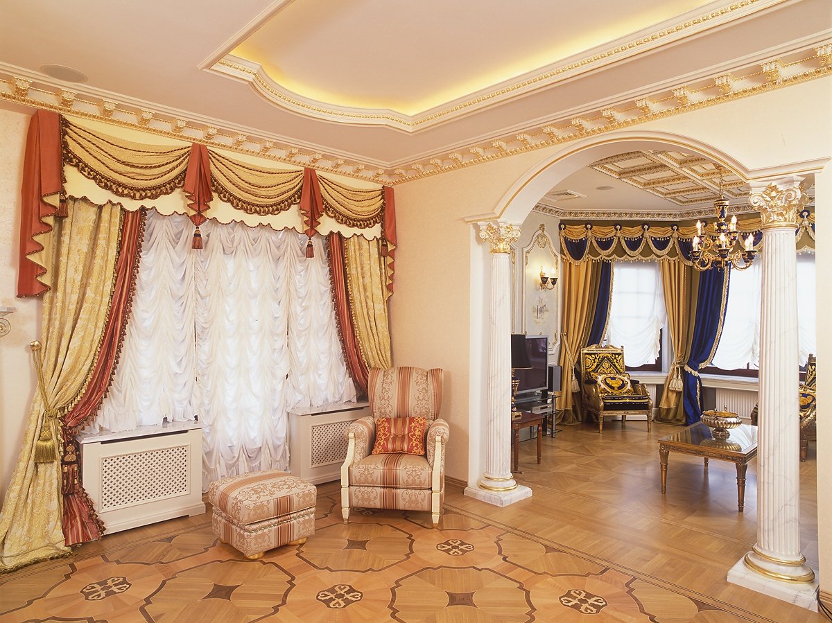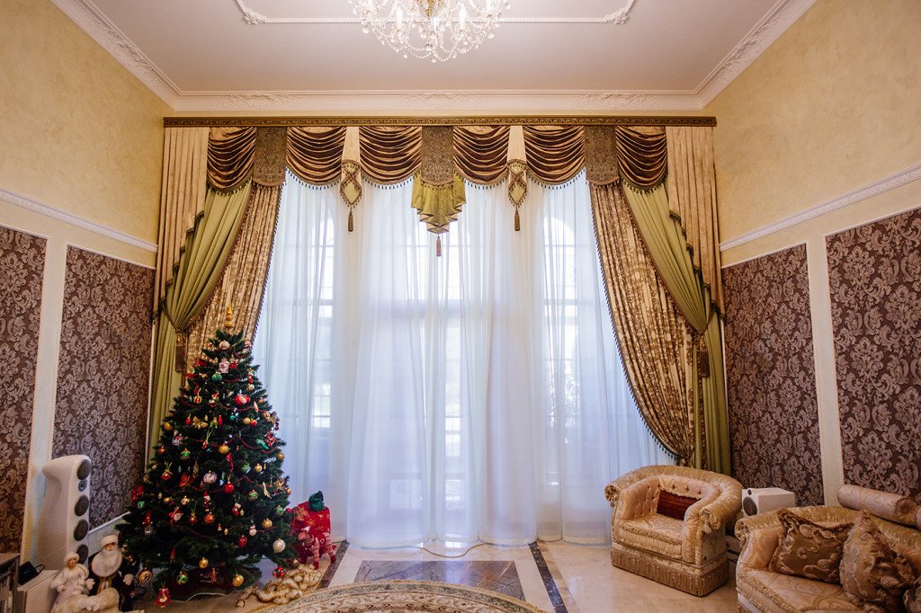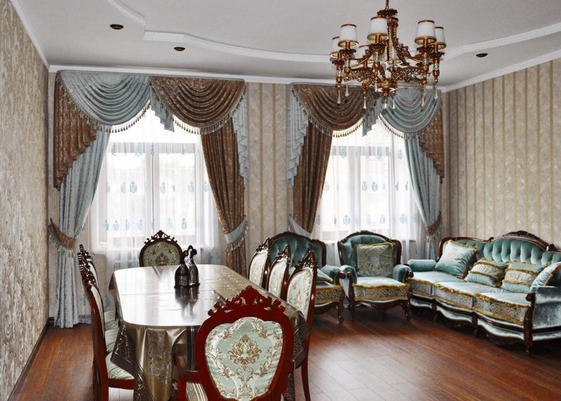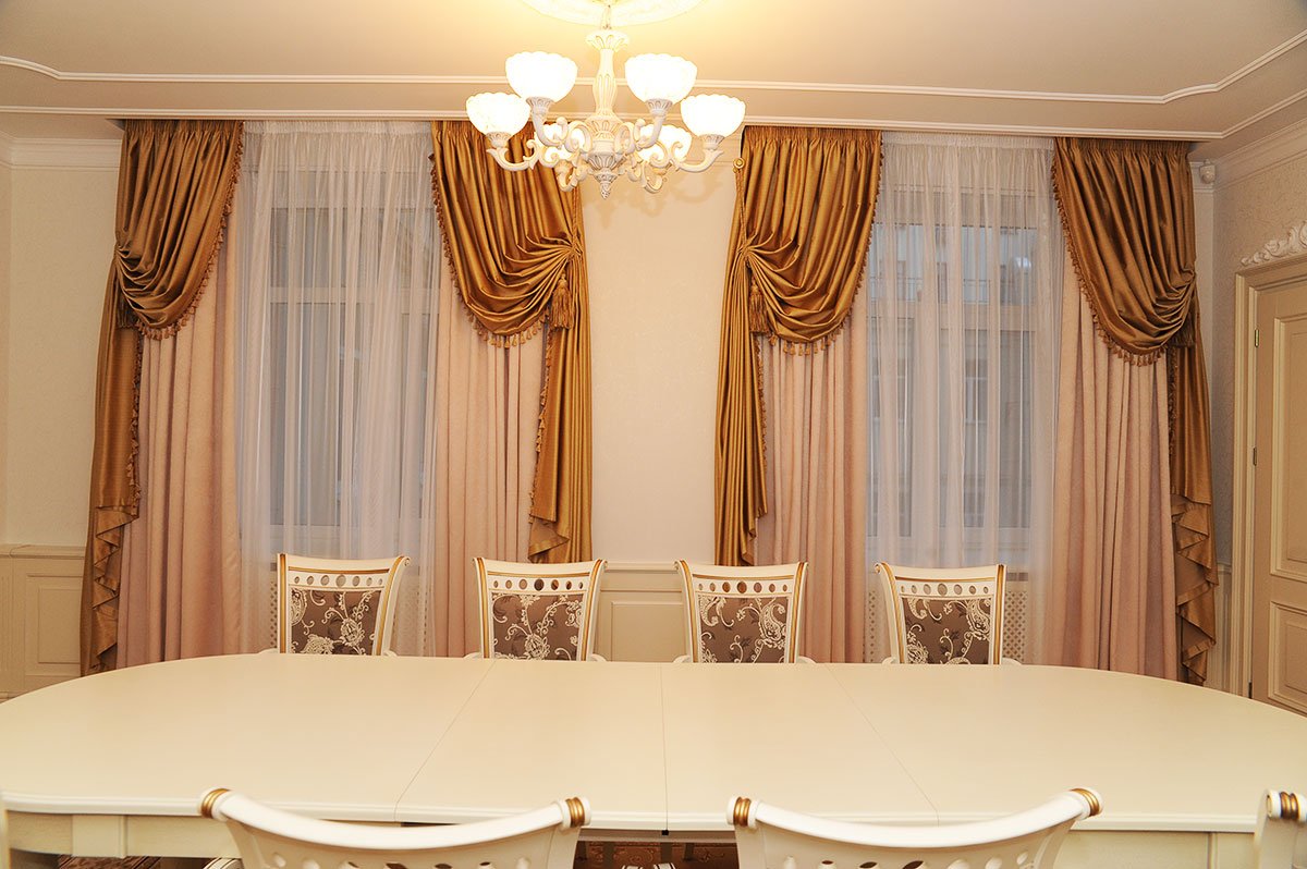 El objetivo principal de las cortinas en un interior clásico es enfatizar el estilo y la sofisticación, y no distraer la vista de otros componentes del diseño. Como ataduras laterales, elija arcos o nudos de varios tipos y recogidas de cuerdas. Los bordes del tul se tratan con un agente de ponderación: cornetas, flecos.