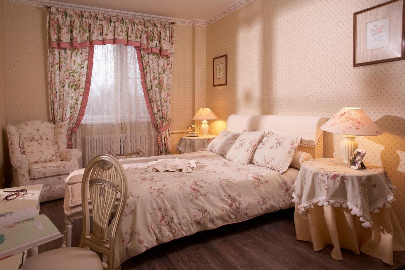 La calma y la comodidad son enfatizadas por lambrequines con campanas y volantes. Las cortinas en colores pastel claros con estampado floral complementan la elegancia de los muebles antiguos. Textiles plisados ligeros crean un ambiente romántico.