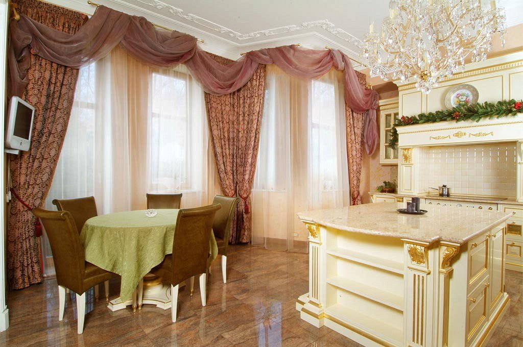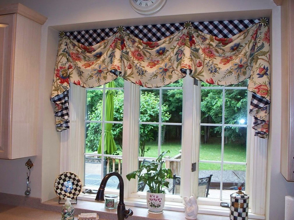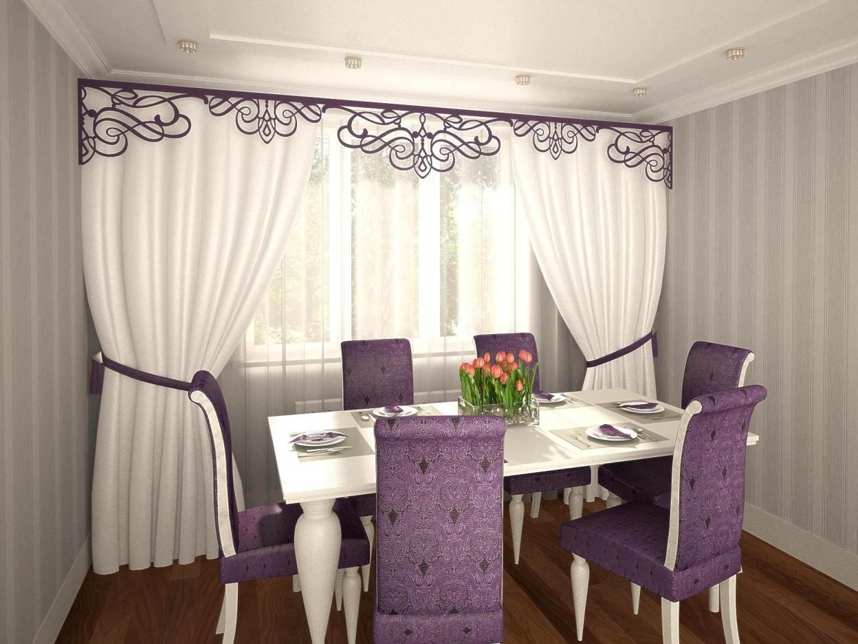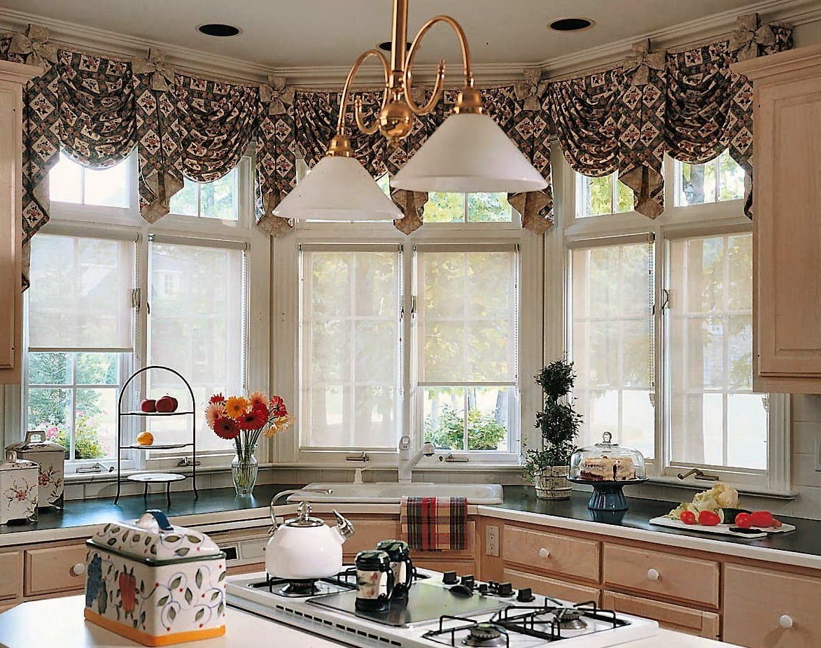 A la cocina Al elegir una decoración con bisagras, el tamaño de la habitación, el diseño de la abertura de la ventana y las características de planificación juegan un papel importante. Si un auricular, refrigerador, estufa se encuentra al lado de la ventana, se utilizan modelos asimétricos. Para resaltar el espacio, es mejor usar un lambrequin duro, una corona, tela recolectada con pandeo natural.