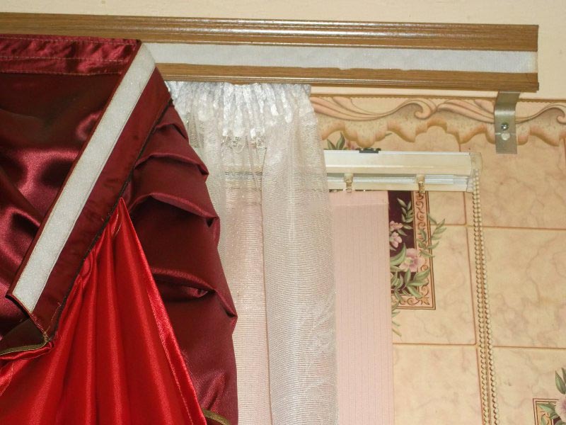 Para composiciones de tipo mixto, necesitará una doble cornisa, equipada con cuerdas especiales. Tíralos en pequeños dientes. La cuerda del arco absolutamente imperceptible se usa para cortinas, cortinas de luz.