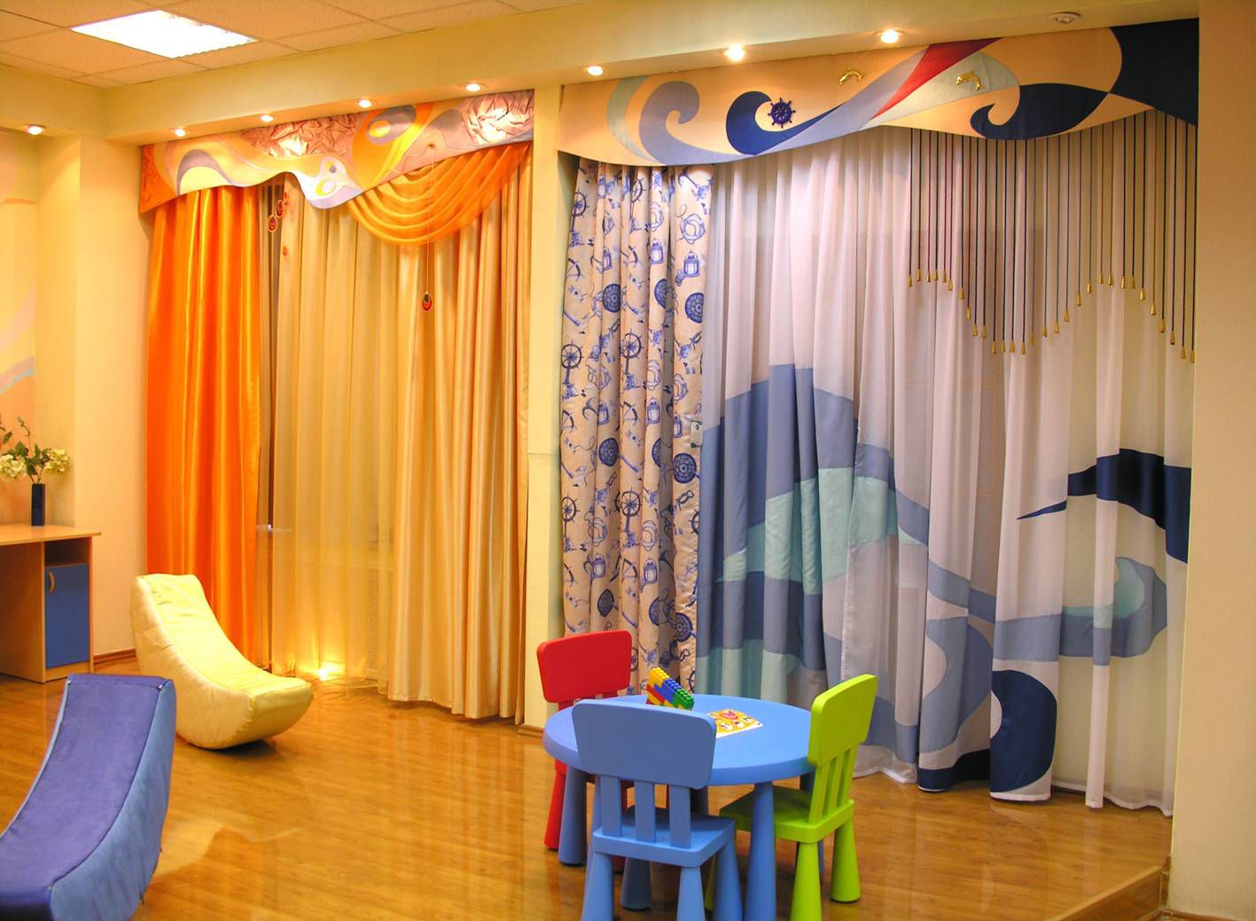 A la guardería. Los lambrequines en la habitación de un niño primero deben crear un espacio armonioso. No deben oscurecer ni distorsionar la luz natural. Las construcciones masivas con una decoración excesiva no funcionarán. En lugar de los combinados, es mejor dar preferencia a los modelos de un tipo en particular.