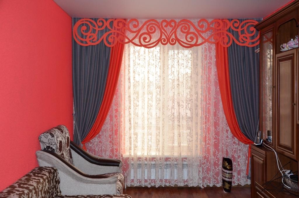 Bicolor. Una solución interior interesante en forma de tal lambrequin debería ser el único acento o tener algo en común con la idea general del diseño. Los materiales de contraste de diferentes colores se verán especialmente bien.