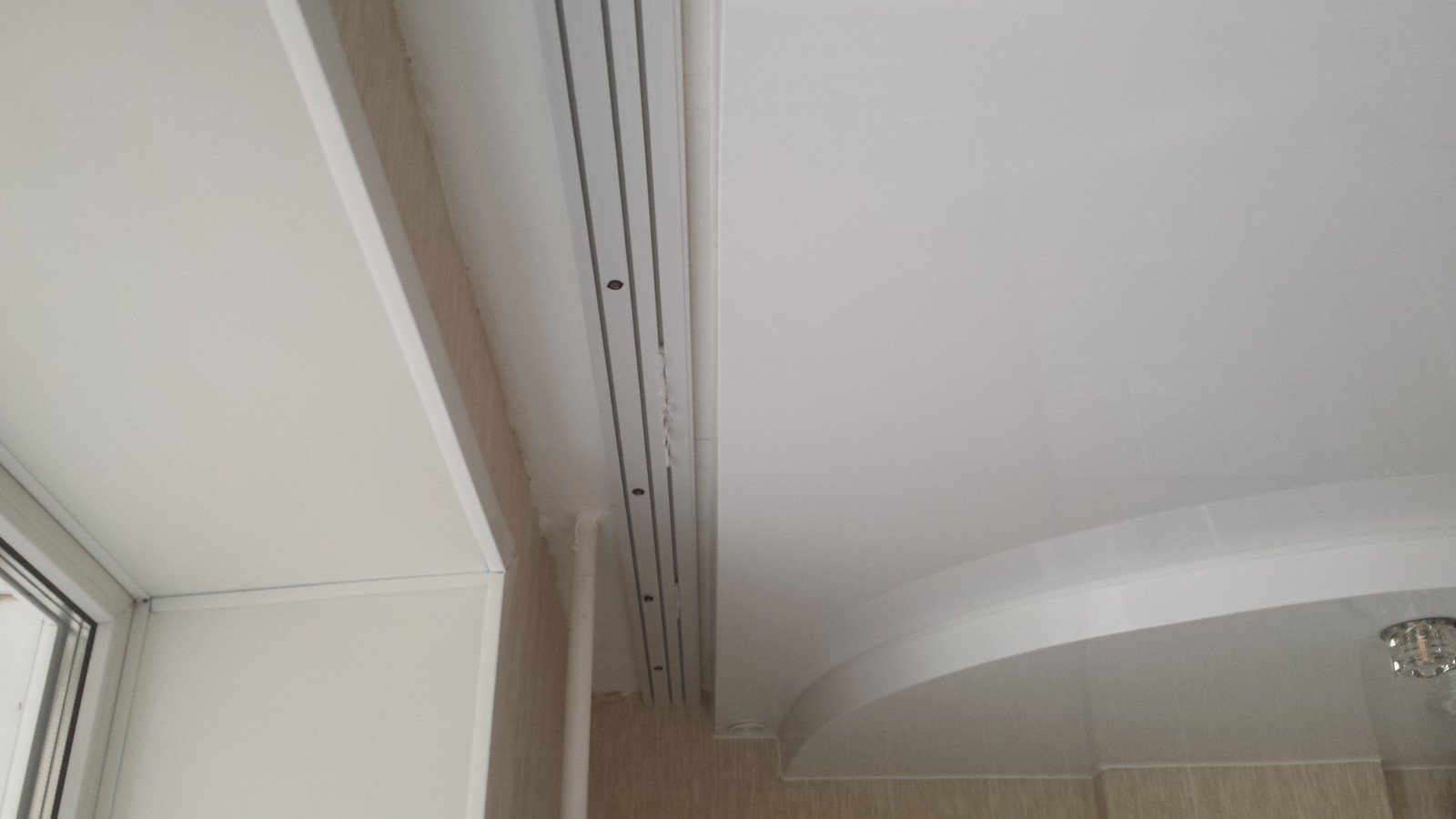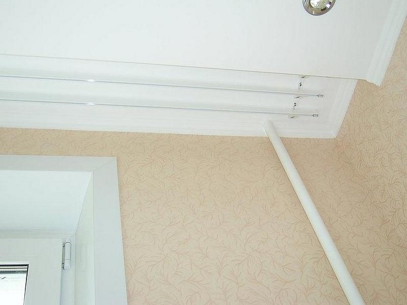 Se fija una viga de madera a pocos centímetros del lugar de instalación de la cornisa, luego se suspende la cortina, se clava una baguette en la parte de madera, sobre la cual se estira la lona del techo más tarde (después de instalar la suspensión de la cortina). La cornisa está unida al techo, hecha de concreto o madera.