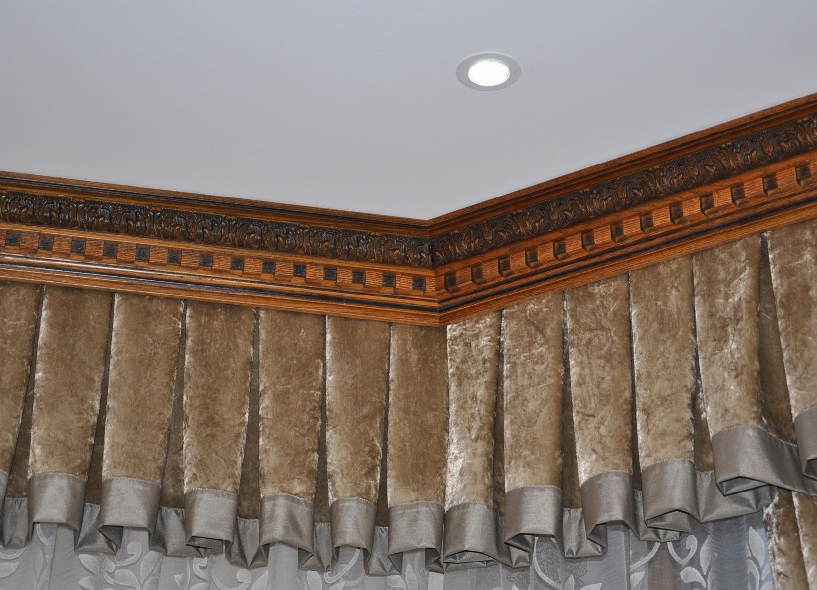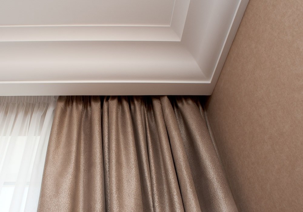 La cornisa del techo está diseñada para soportar, fijar las cortinas, mientras se combina bien con el interior existente o recién creado. La cornisa oculta le permite cubrir completamente toda la pared con una cortina. Parece que las cortinas "fluyen" directamente desde el centro del techo, la unión de la pared con el techo.
