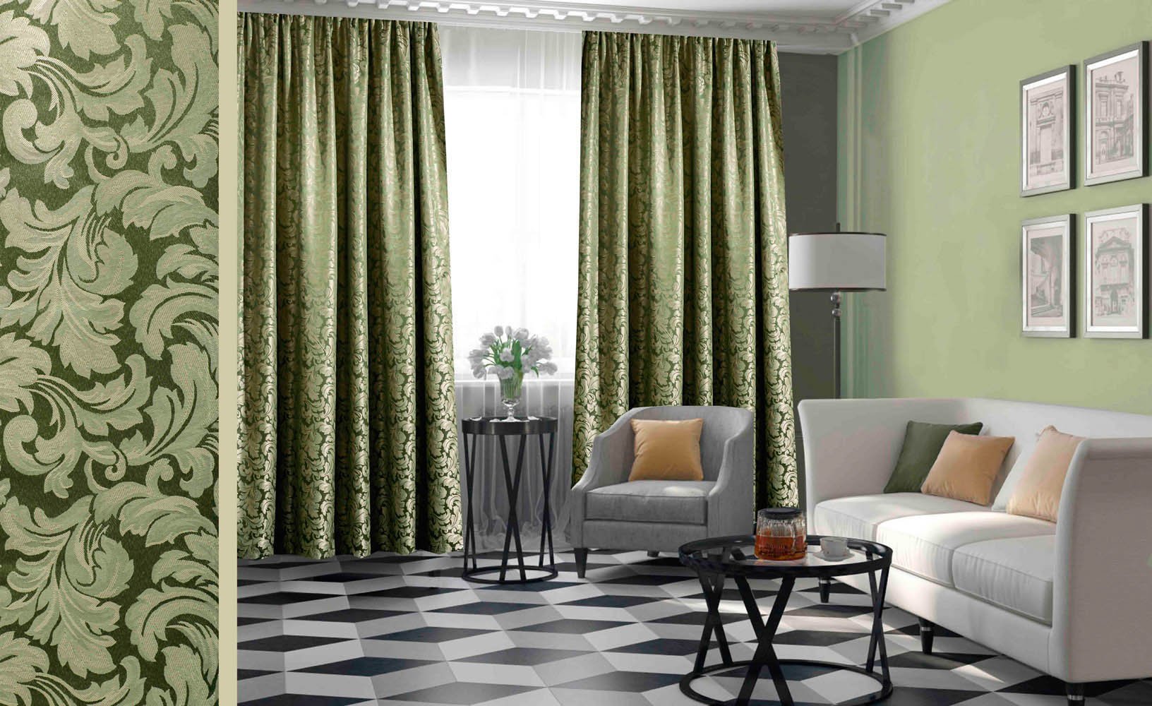 Jacquard La superficie de un material denso, como regla, está decorada con patrones en relieve (deprimidos) hechos dentro del mismo color. Las cortinas verdes Jacquard son adecuadas tanto para estilos ligeros como estrictos.
