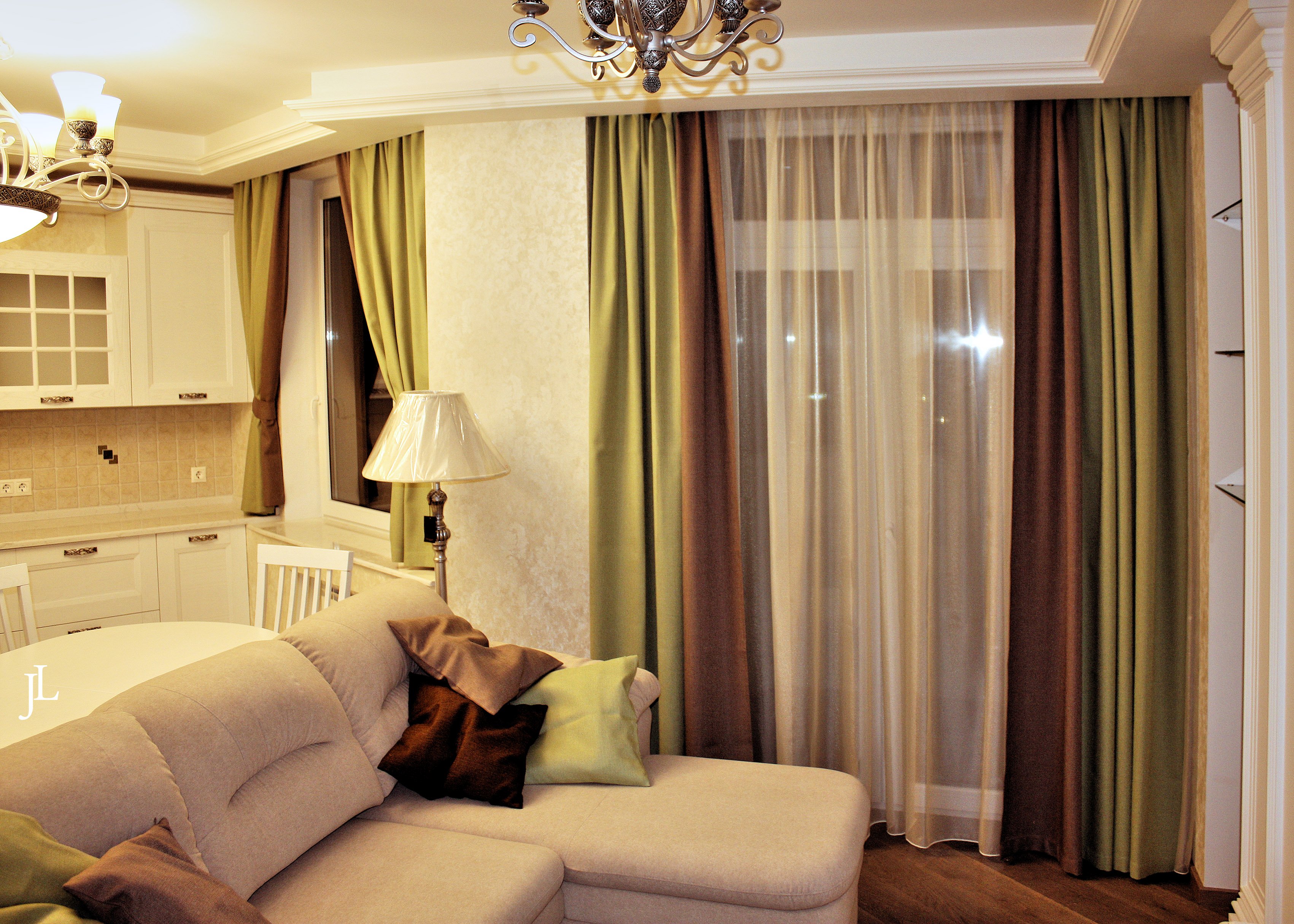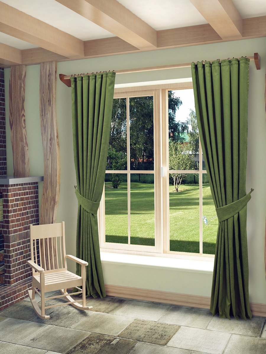 Cortinas rústicas.Cortinas cortas que apenas alcanzan el alféizar de la ventana. Para ellos, generalmente eligen telas con un patrón para enfatizar el color del interior en un estilo rústico o provenzal. El tipo de diseño más primitivo en las ventanas son las persianas, pero incluso se pueden hacer en un alegre color verde, que elimina por completo el espíritu de "oficina" de la sala de estar.