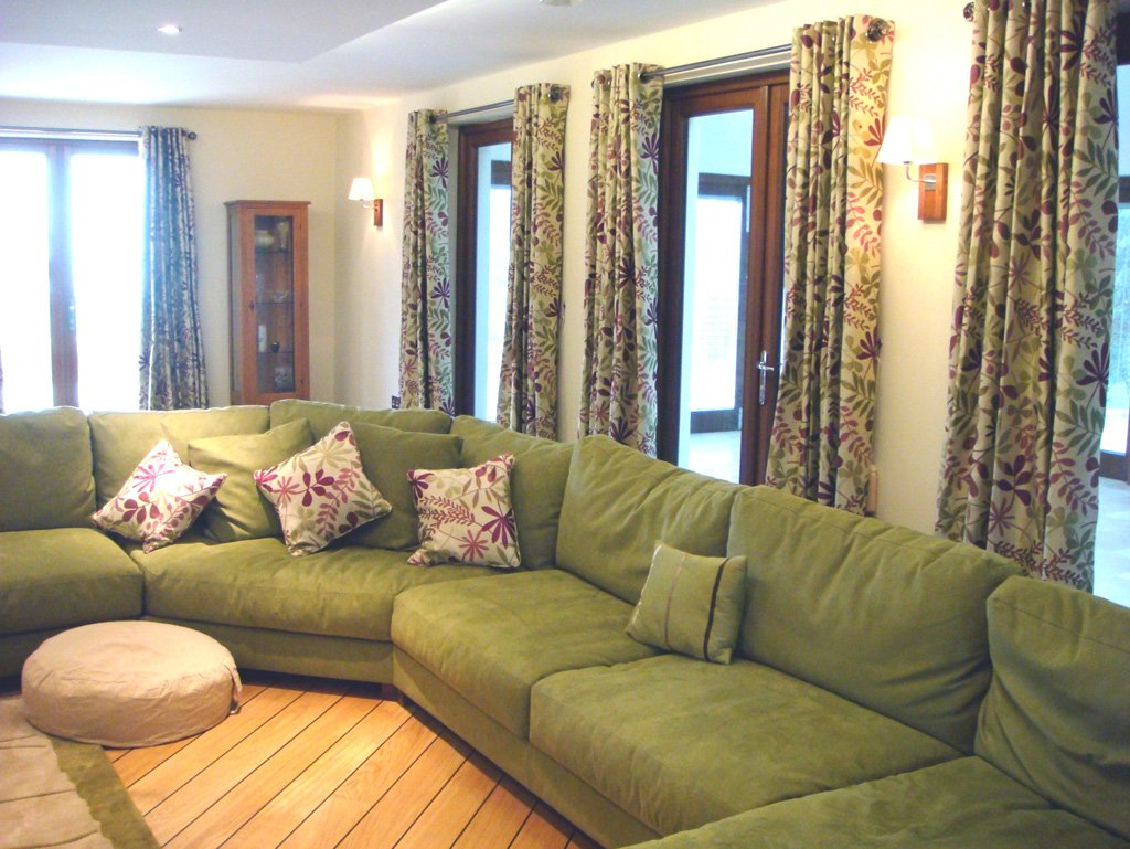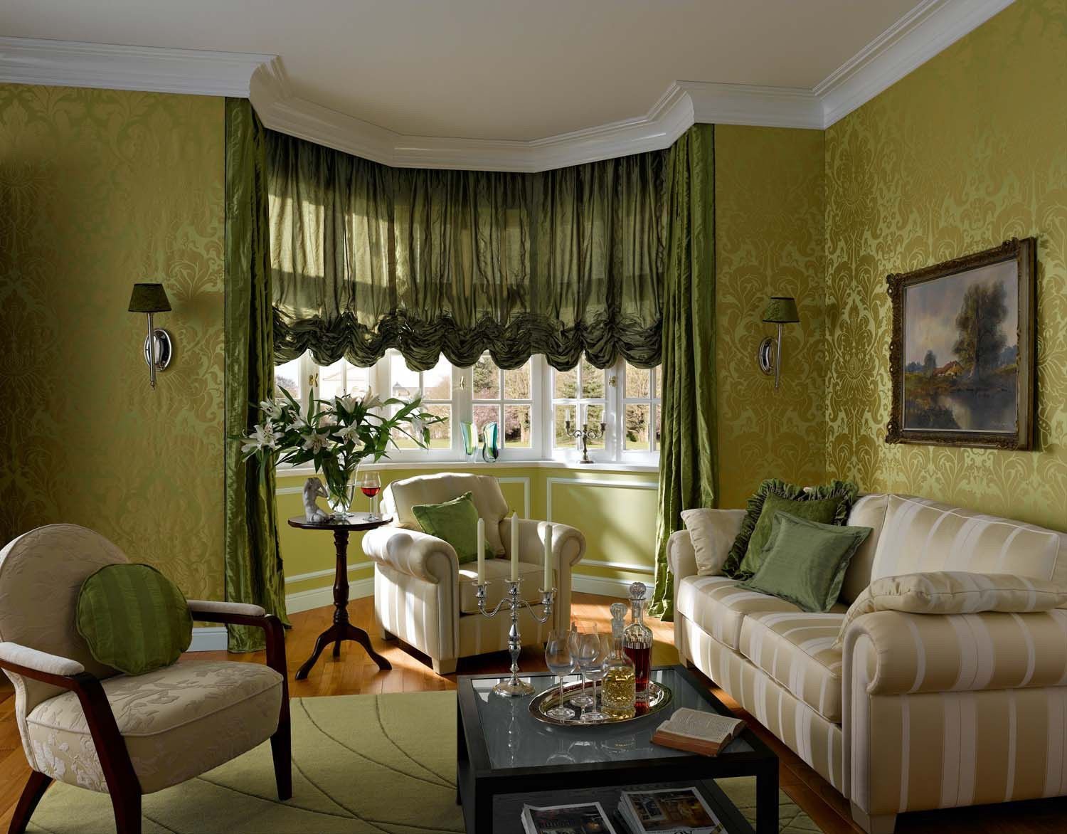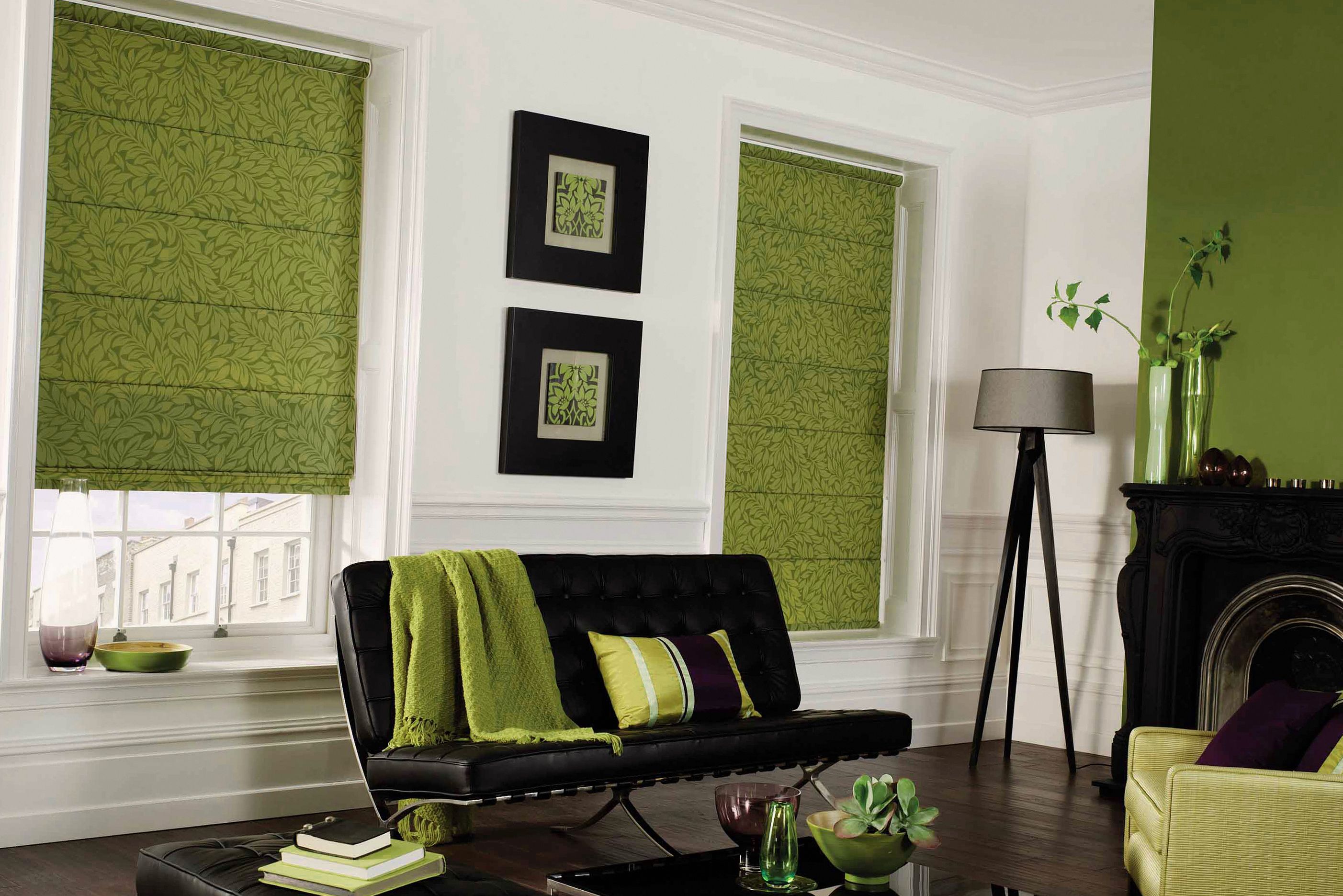 Cada tipo de dibujo es adecuado solo para ciertos estilos. Por ejemplo, las cortinas verdes decoradas con formas y líneas geométricas se verán bien en minimalismo, vanguardia, alta tecnología o futurismo.