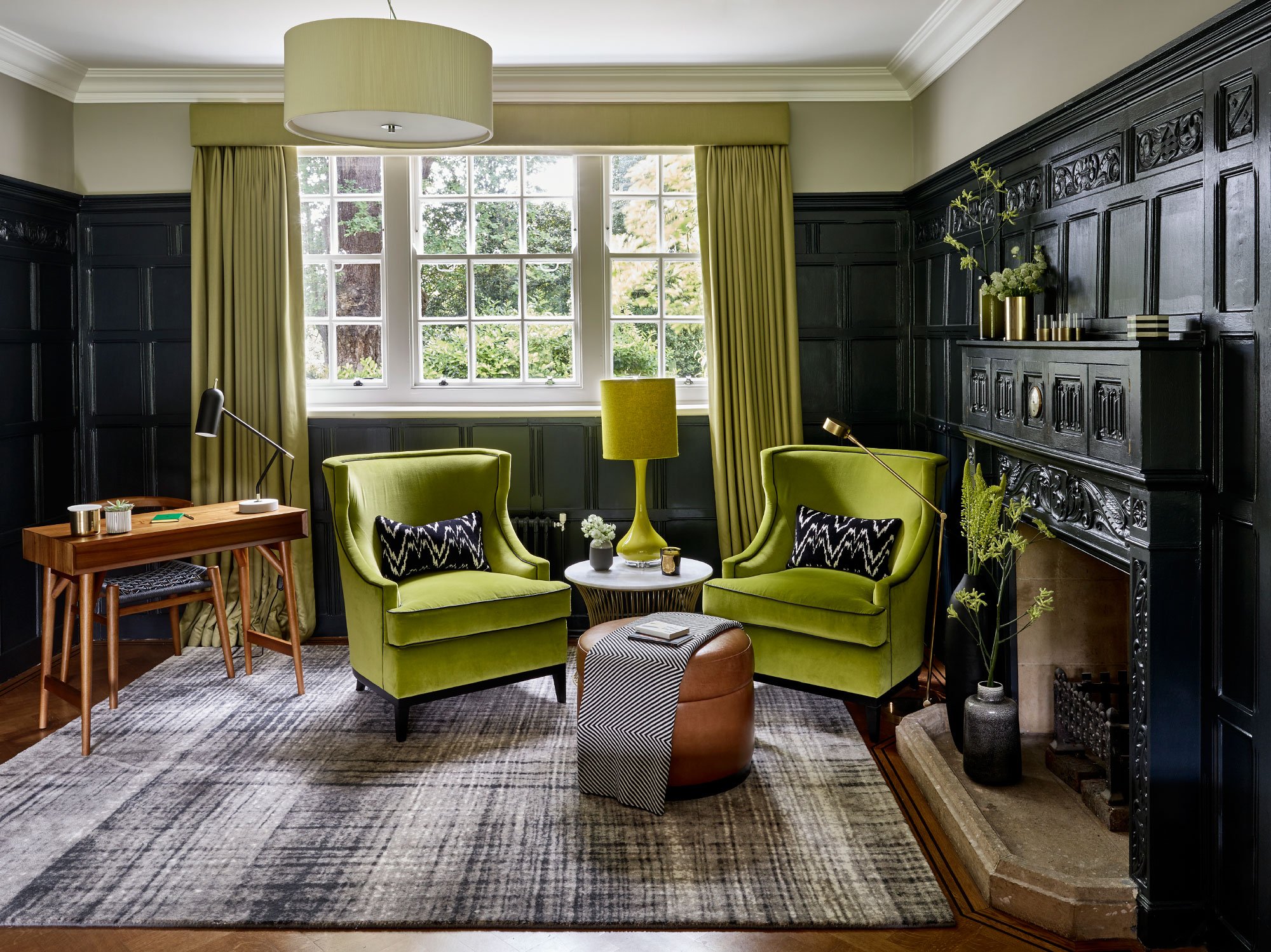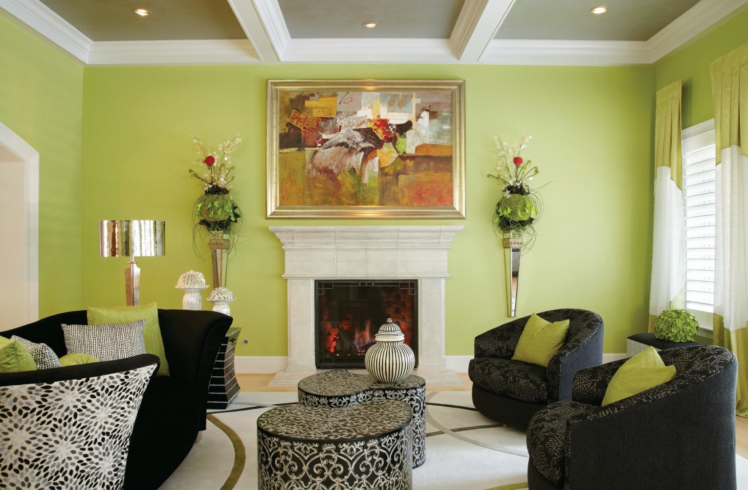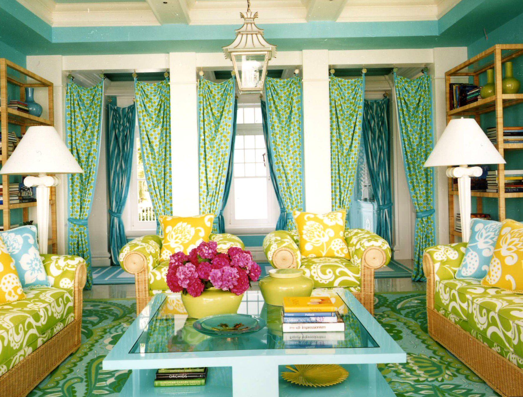 Cada tipo de dibujo es adecuado solo para ciertos estilos. Por ejemplo, las cortinas verdes decoradas con formas y líneas geométricas se verán bien en minimalismo, vanguardia, alta tecnología o futurismo.