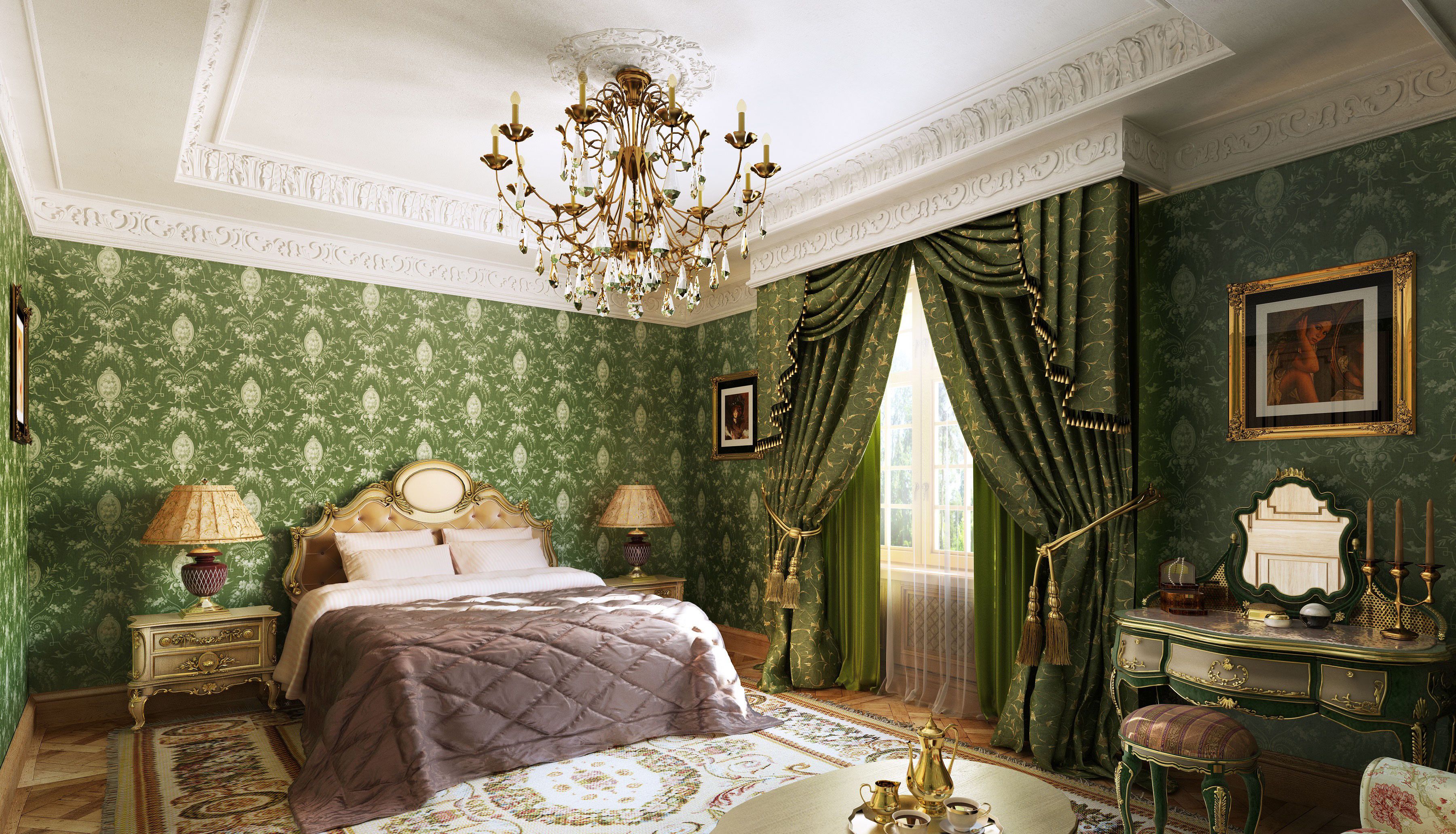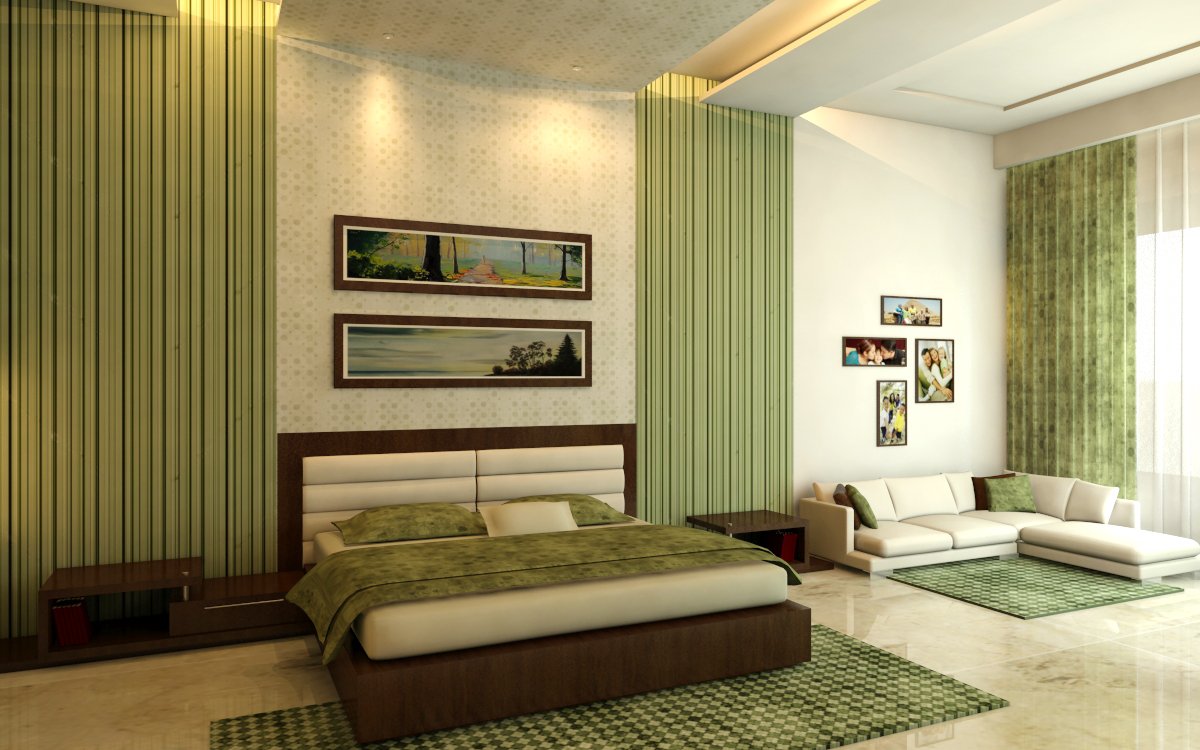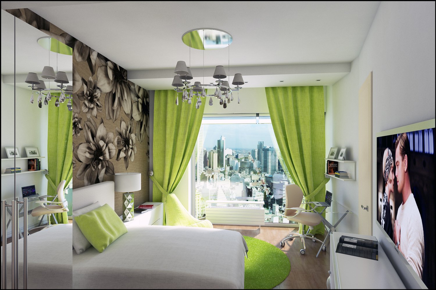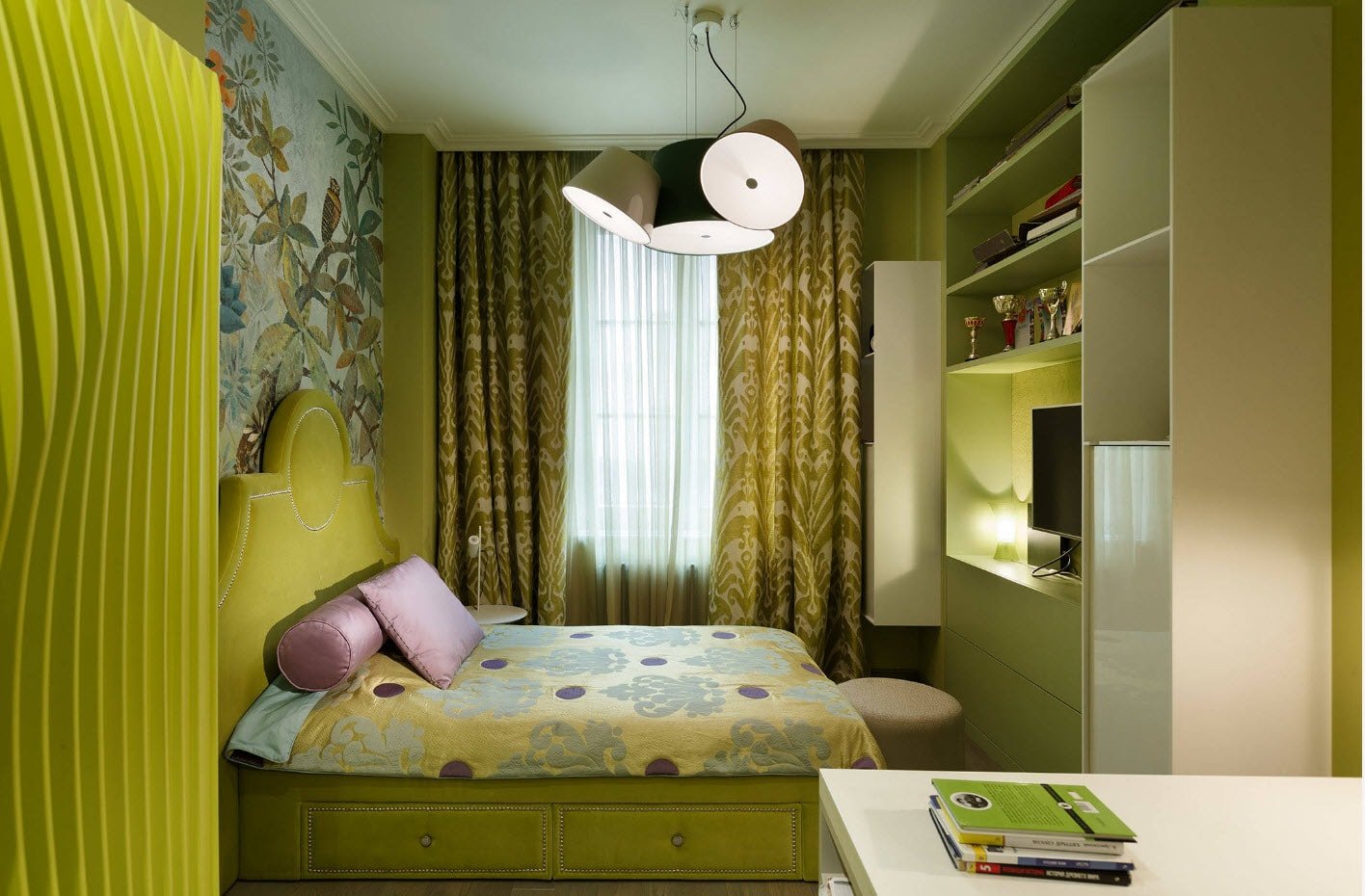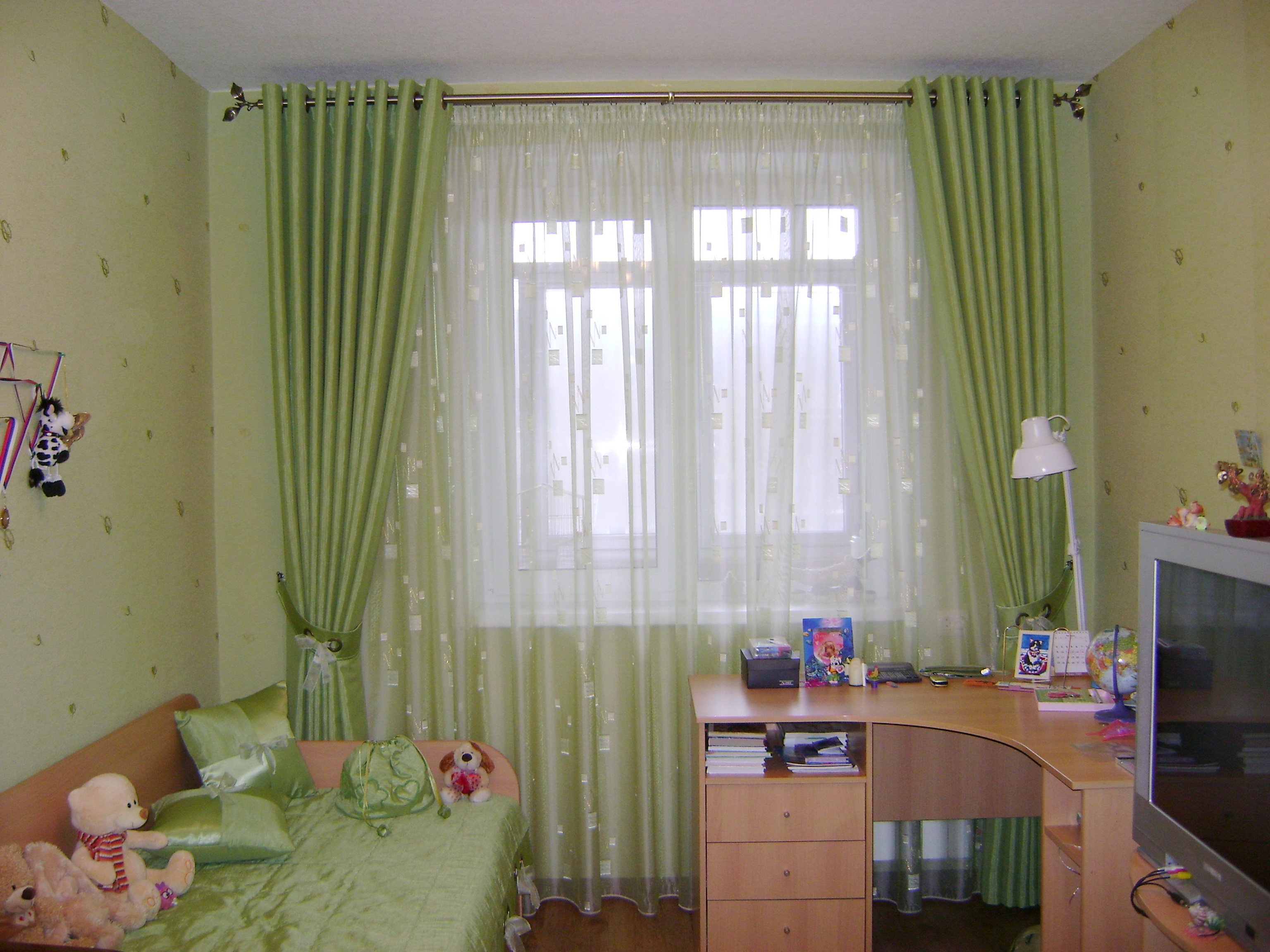 Para el dormitorio, se seleccionan cortinas de tonos verde claro, pálido o jugoso. No use tonos jade o morados en esta habitación. En una composición de color, el verde generalmente se asocia con tonos blancos y pasteles en la decoración de paredes. La litera está decorada con los mismos colores neutros: beige, café, gris, nogal. Una menta fresca o un tono verde oliva se verán bien en esta habitación. Una decisión audaz es combinar cortinas verdes con el mismo fondo de pantalla. No se recomienda usar tonos oscuros, ya que se combinan "con un crujido" y crean una atmósfera opresiva, que es inaceptable para el baño. Las jugosas cortinas de hierba o lima se ven geniales en el fondo de papel tapiz verde pálido.