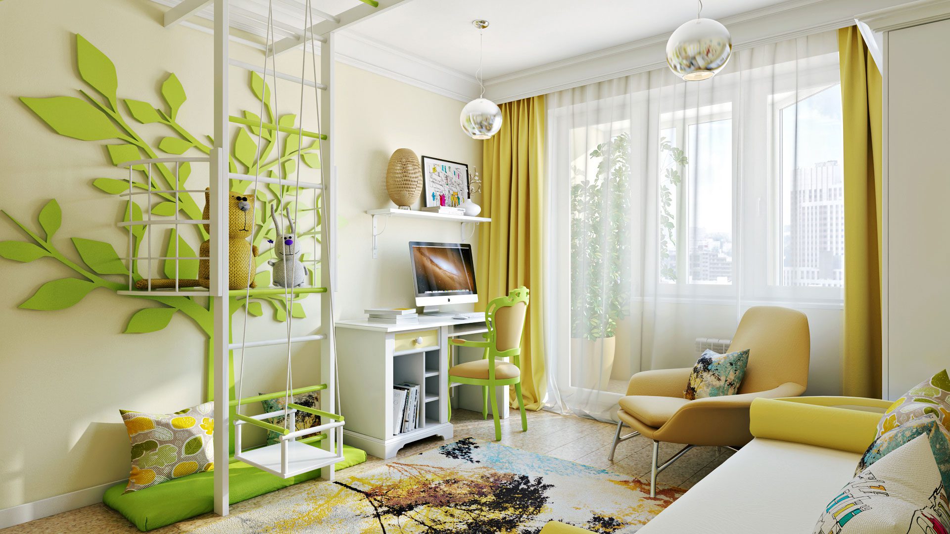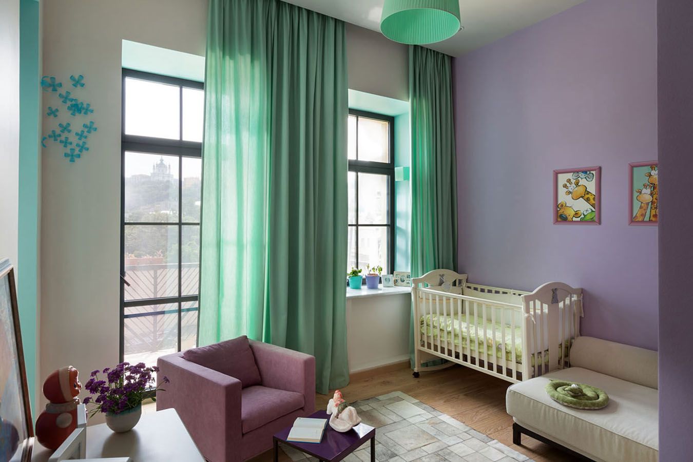 En la guardería, como regla, se usan tonos jugosos de verde: cítricos, lima, hierbas, lima. Realmente “respiran” optimismo y crean un ambiente favorable tanto para los juegos como para el estudio. En una habitación para una niña, el verde se combina con el rosa o el melocotón. Ya hemos mencionado la "naturalidad" de tales combinaciones. Para los niños, puede elegir un dúo con lila marrón, azul o extravagante.
