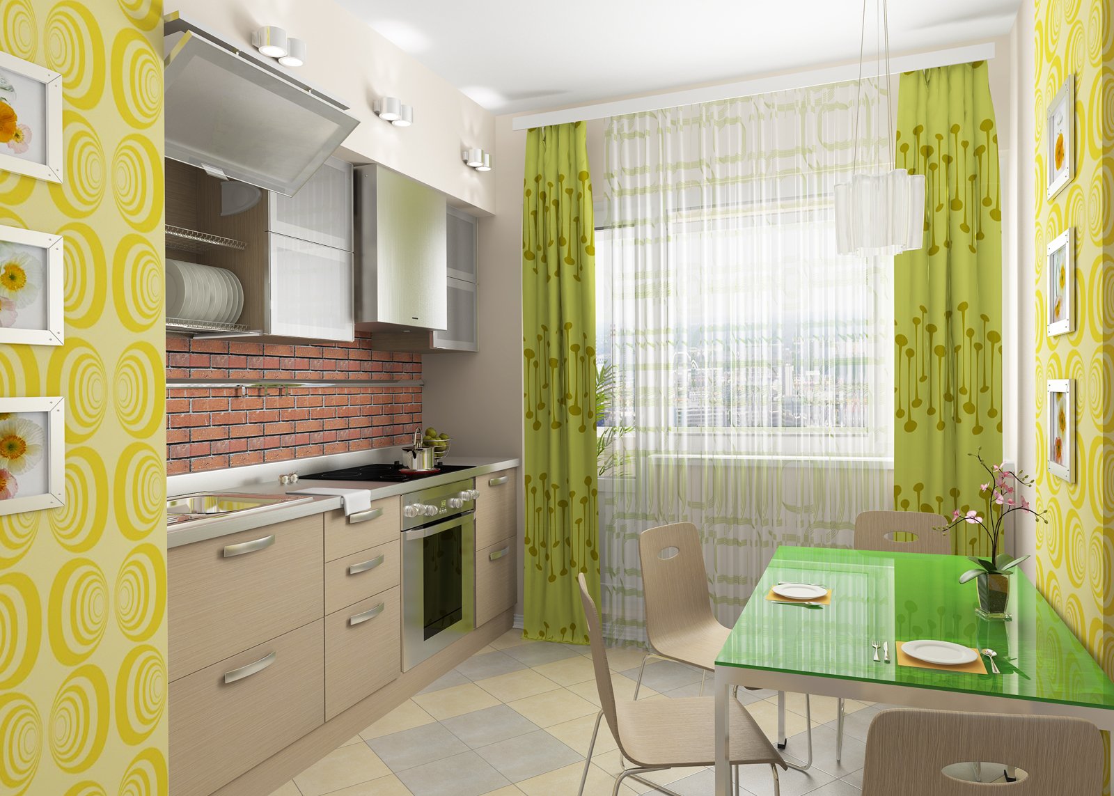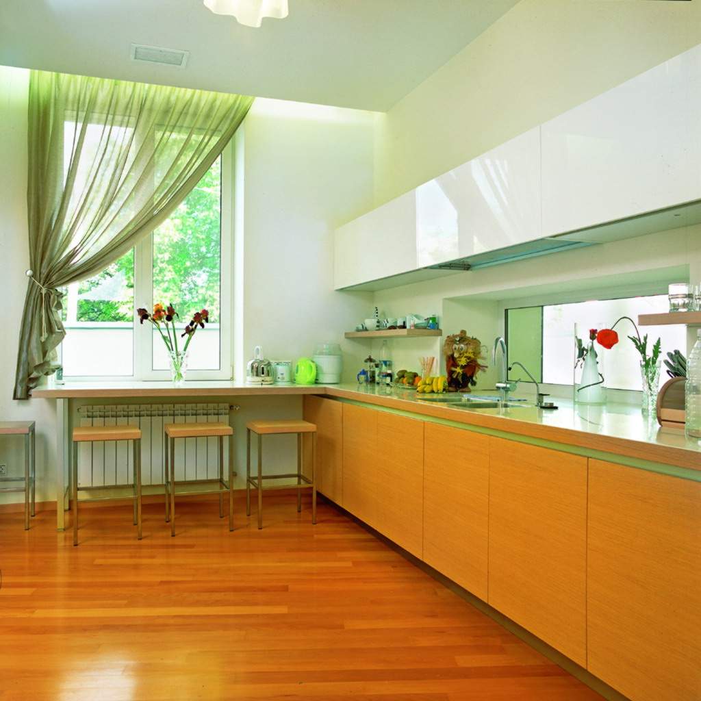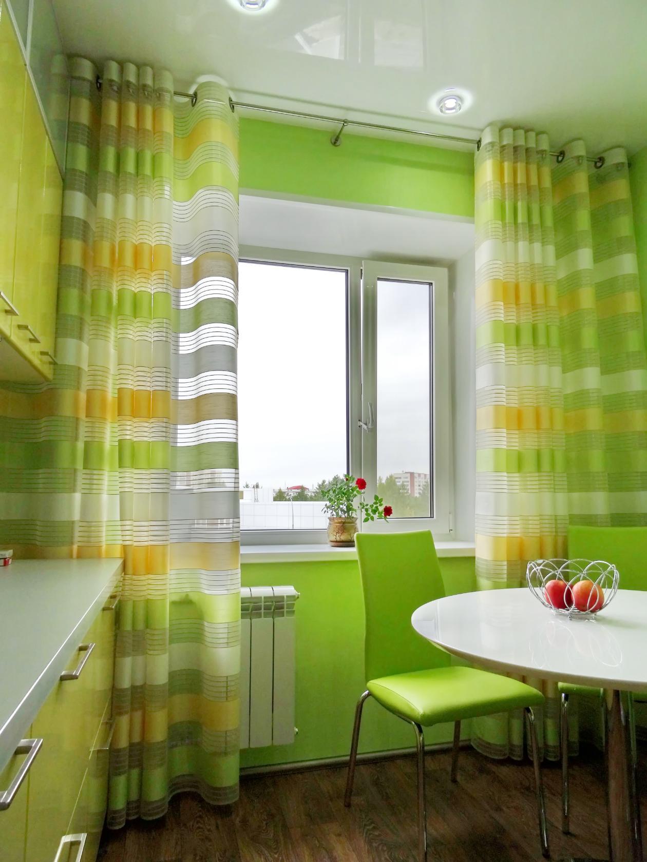 Cortinas cortas o persianas enrollables son ideales para la cocina. No tiene sentido usar cortinas pesadas en esta habitación, ya que la ama de casa es atormentada por el lavado regular. Se prefiere tul ligero de organza o velo. Es para la cocina que recomiendan elegir el verde clásico. Si usa tonos con una mezcla de amarillo, un entorno demasiado cálido causará un apetito excesivo. Un exceso de tonos azules en las variaciones del verde puede suprimir el "hambre" y hacer que la habitación sea incómoda, ligeramente "espinosa".