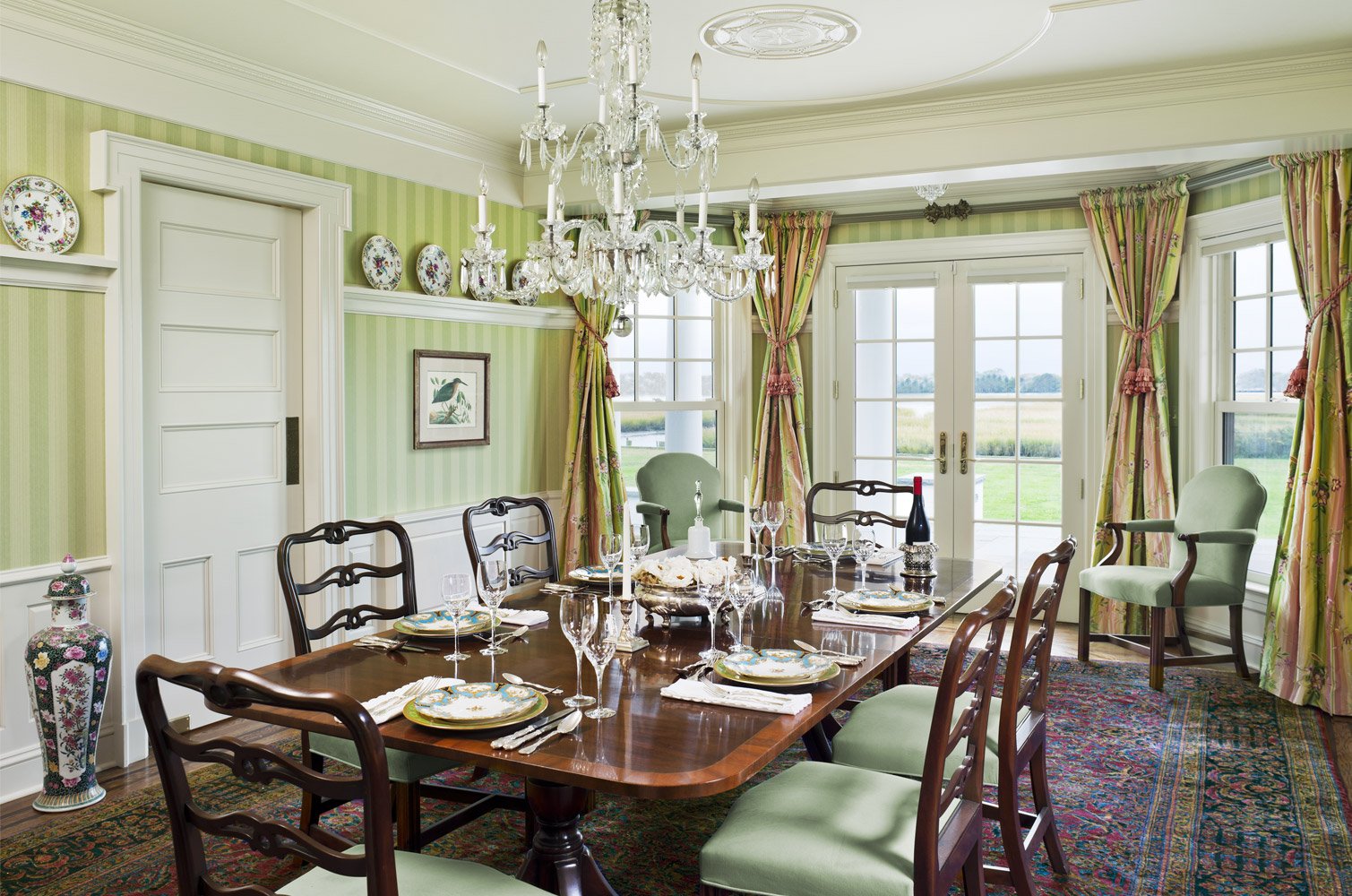 El color verde simboliza la calma, la medición, la fiabilidad y la seguridad. Resultó como resultado de una mezcla de amarillo y azul, que son inherentemente opuestos, como el calor y el frío. Por lo tanto, el verde, dependiendo de la sombra, puede calmar y agregar dinámica a la habitación. En algunos casos, los textiles que tienen un brillo demasiado intenso pueden incluso tener un efecto demasiado sedante, causando apatía e incluso depresión. Este color se asocia con hierba, tallos de flores, frutas, coronas de árboles.