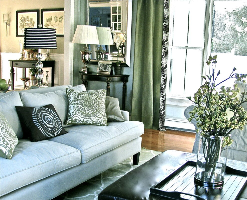 En la sala de estar, las cortinas verdes, como regla, se seleccionan para que coincidan con el color de la alfombra en el piso o de otro hito textil grande. Esto no quiere decir que en una composición tranquila, el uso de este color solo en cortinas se vea feo.Por el contrario, si la sala de estar está decorada en tonos grises, blancos o marrones claros, entonces el verde jugará aún más brillante, independientemente de la intensidad de la sombra. Sin embargo, más a menudo el color de las cortinas está lógicamente "atado" en otra decoración. Esto puede ser no solo una alfombra, sino también una tela escocesa, tapicería de un sofá o sillones, almohadas, pequeñas decoraciones (jarrones, ataúdes) o fachadas de un gabinete, un pie, una cómoda.