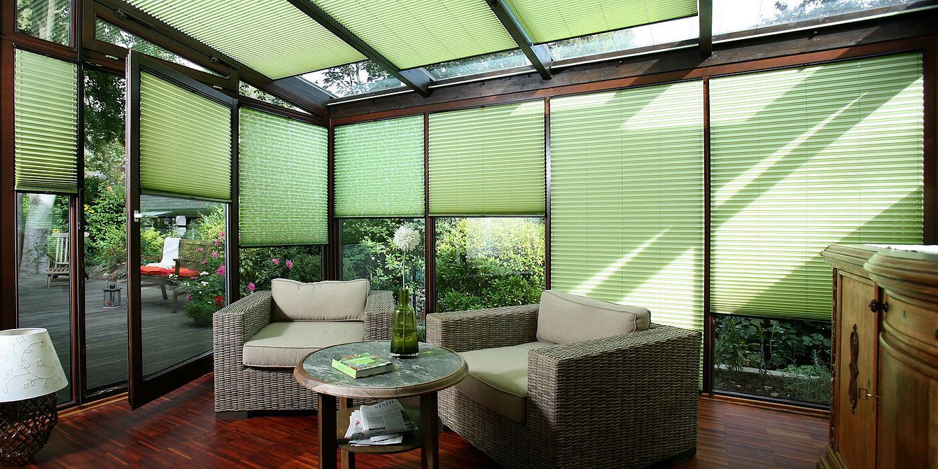 El tipo de diseño más primitivo en las ventanas son las persianas, pero incluso se pueden hacer en un alegre color verde, que elimina por completo el espíritu de "oficina" de la sala de estar.