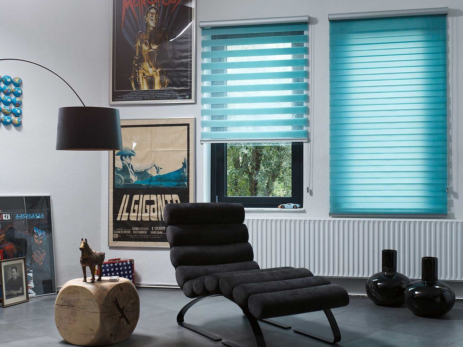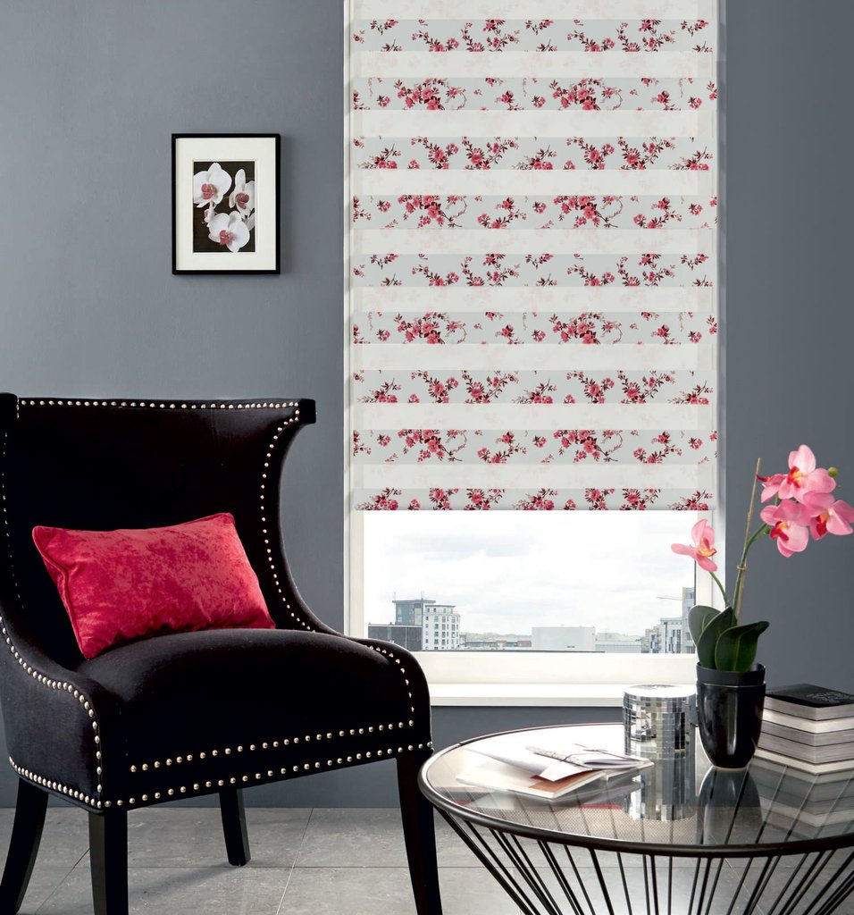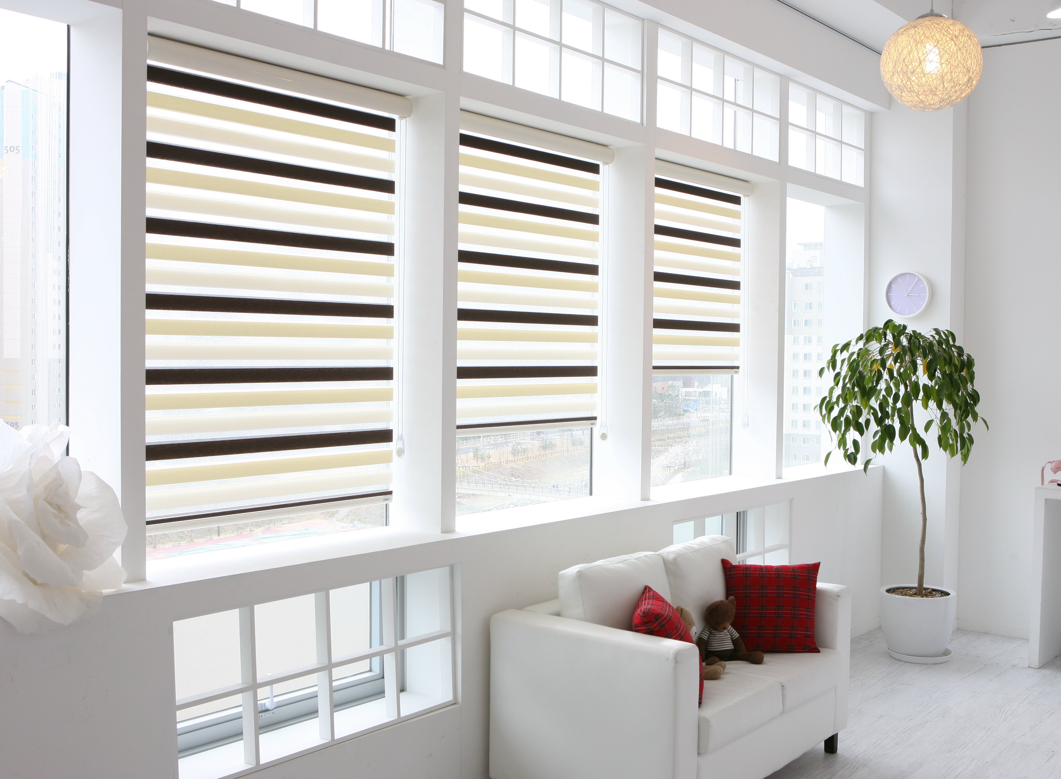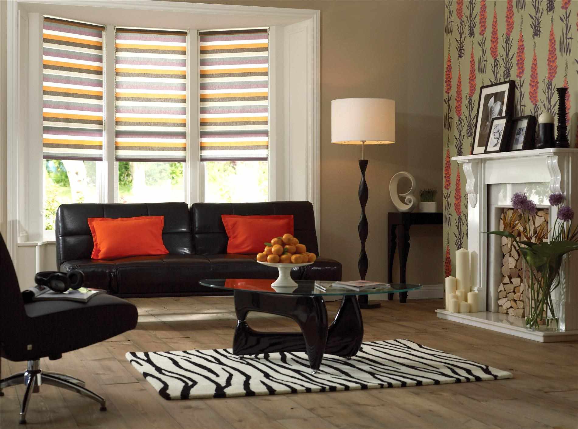 "Día-noche". La idea de las persianas surgió sobre la base de cortinas plisadas con el mismo nombre. El paquete incluye dos rollos de tela. Un material es denso y transmite luz débilmente, y el segundo es translúcido. Las rayas de textiles se alternan entre sí según el principio de "cebra". Al girar la perilla, una persona puede ajustar la intensidad de la luz, ya que las franjas se cambian gradualmente entre sí.