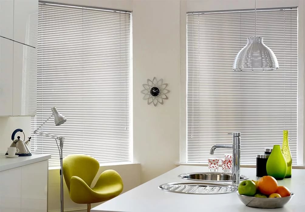 Las persianas de las persianas de aluminio se caracterizan por una mayor rigidez. Por esta razón, se recomienda comprar el material para decorar ventanas de configuración compleja. Las persianas de aluminio durarán mucho tiempo e incluso se aburrirán, aunque su versatilidad estilística le permite adaptar el elemento decorativo a cualquier decisión de diseño. El material es fácil de limpiar: es suficiente limpiar periódicamente las láminas con una esponja húmeda. El aluminio no se puede limpiar solo con compuestos abrasivos, que inevitablemente dejarán rasguños en el metal blando. El material es insensible a temperaturas extremas y alta humedad, por lo que puede usarse para decorar la cocina y el baño. Las persianas de aluminio son incluso adecuadas para ventanas en terrazas "frías", logias y áticos. Hay productos pintados total o parcialmente en varios colores o con un patrón aplicado a la superficie.