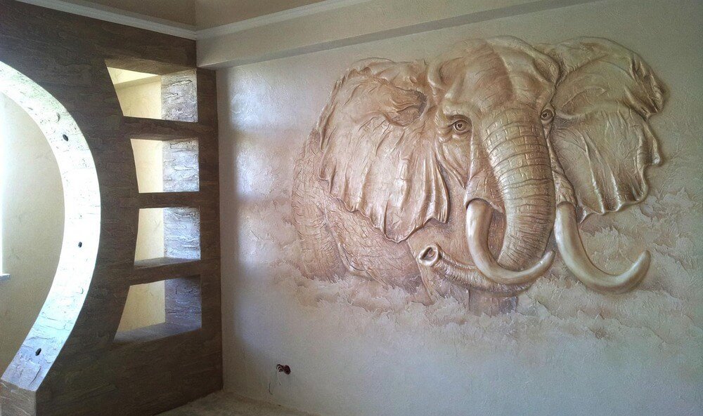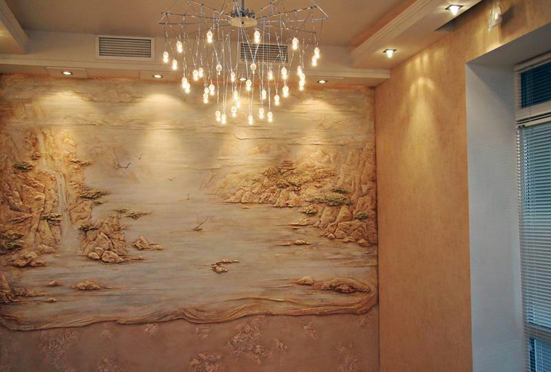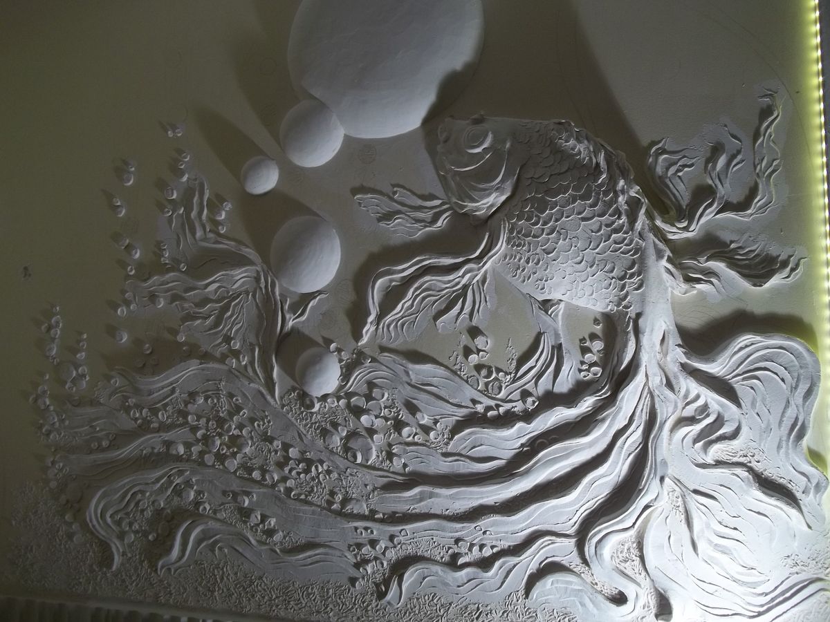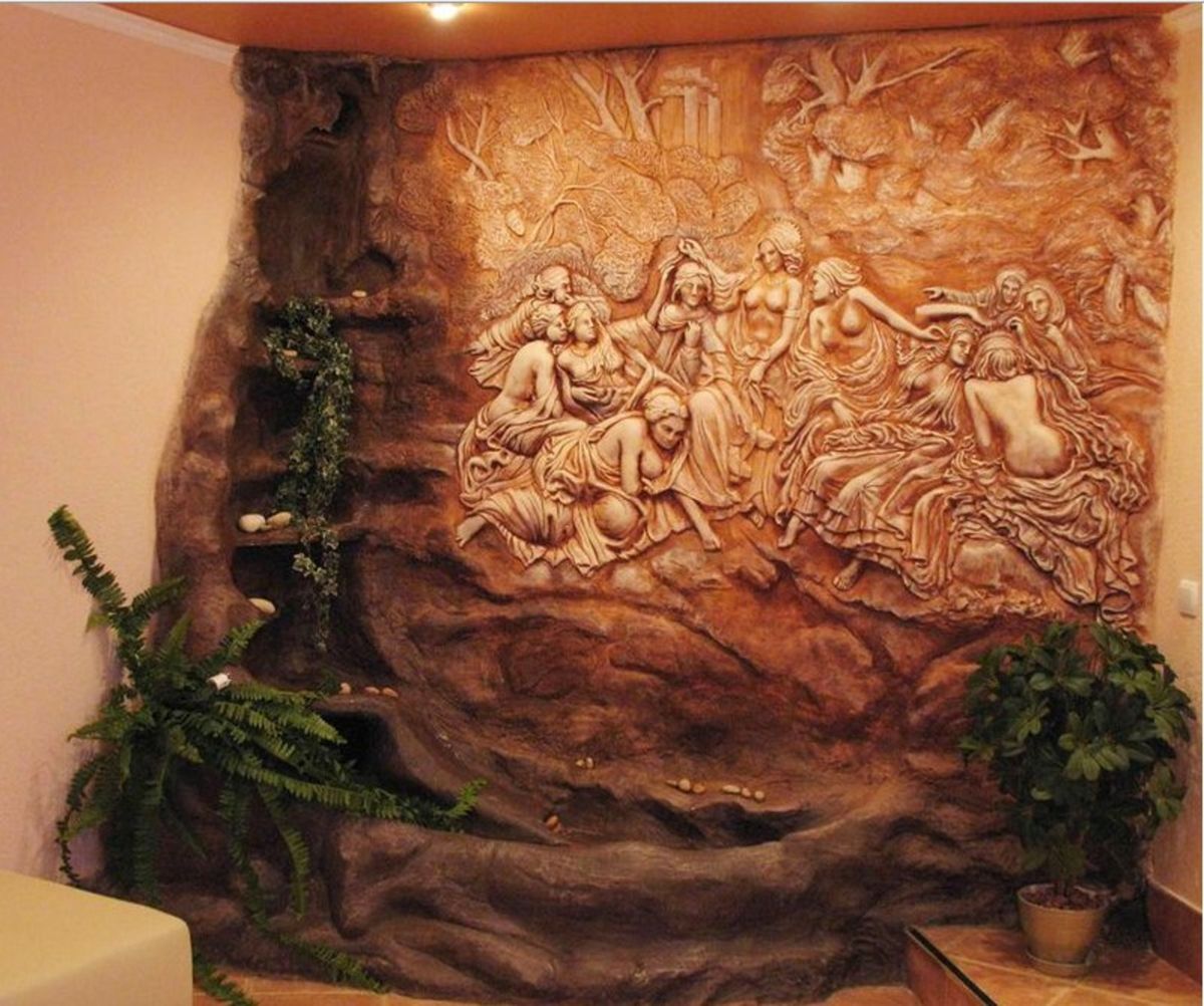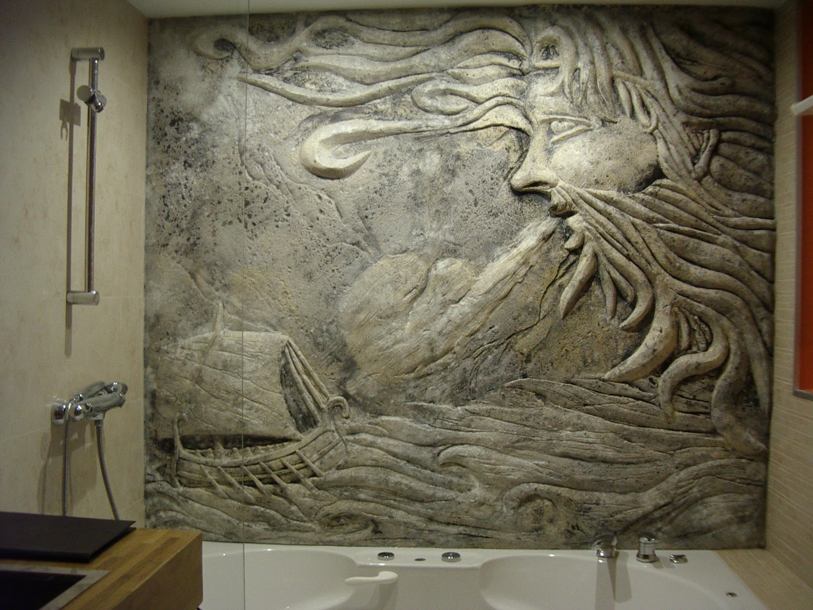 Las imágenes volumétricas de bancos de peces, patines, algas, “campos” de coral y fantásticos panoramas de las posesiones de Tritón son adecuados para el estilo marino. Por supuesto, un novato no podrá hacer tales composiciones la primera vez sin errores. Tienes que entrenar durante mucho tiempo y rellenar tu mano. Este es quizás el principal inconveniente del bajorrelieve. Es imposible crearlo hermoso sin mucho tiempo dedicado a enseñar la habilidad del escultor. La excepción serán solo relieves abstractos que sean adecuados para el mismo estilo o minimalismo. A diferencia de la pintura decorativa, los bajorrelieves no necesitan resaltado adicional. La luz de fondo enfatiza perfectamente cada línea. Este tipo de decoración es popular para decorar arcos, chimeneas, aberturas y paredes decorativas. Con su ayuda, puede enmascarar correctamente las irregularidades de la superficie, ocultar las líneas de comunicación o distorsionar el espacio en una habitación de forma irregular.
