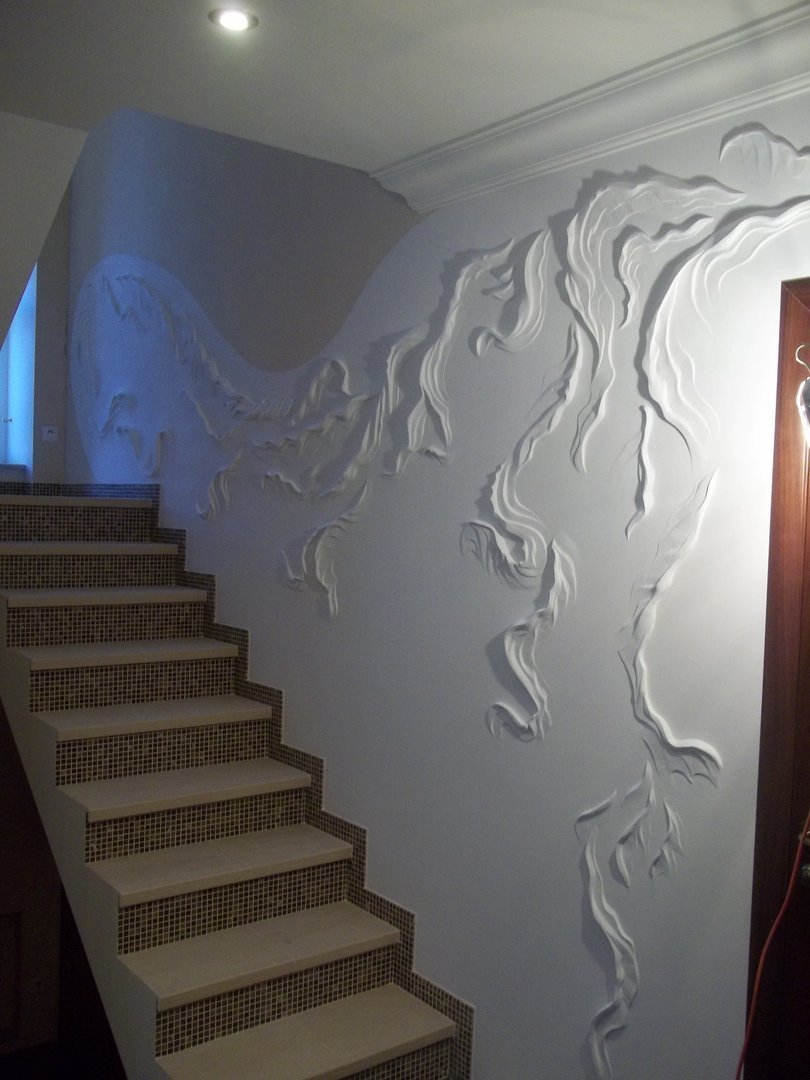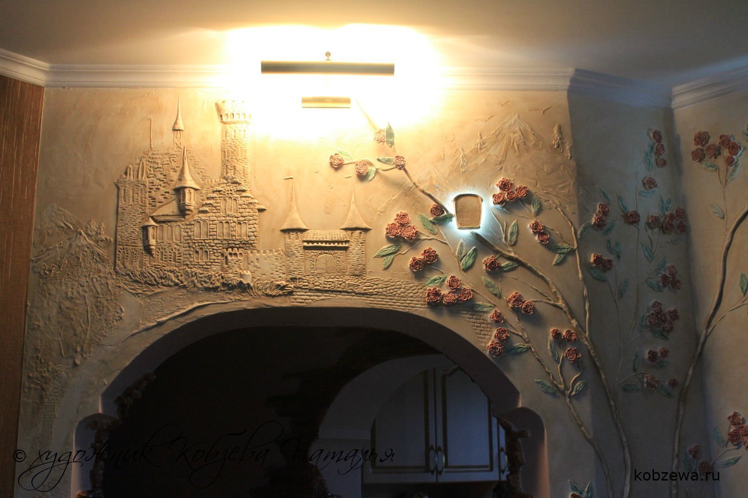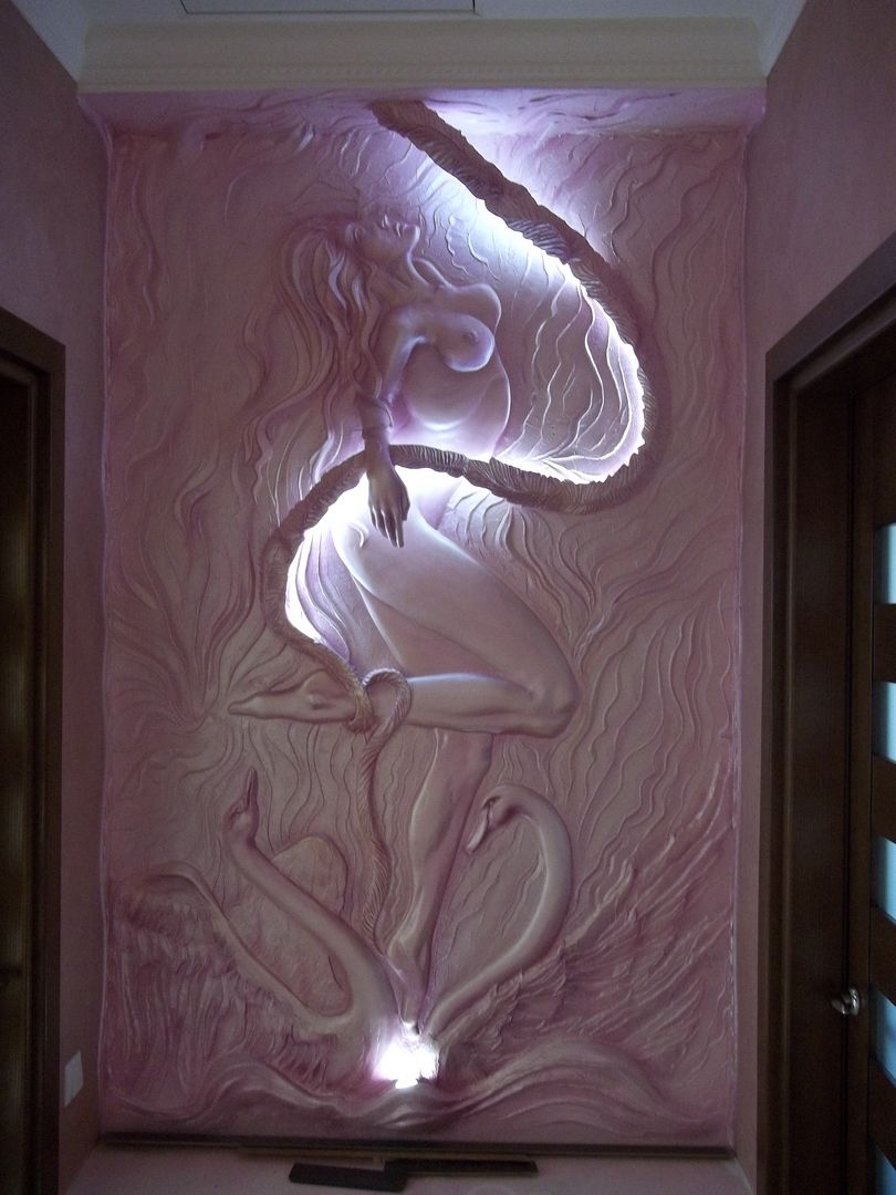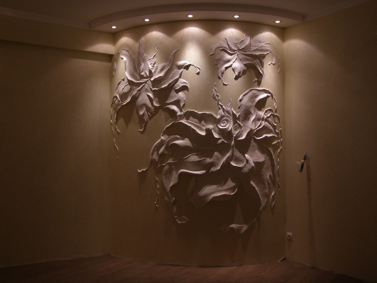 Las imágenes volumétricas de bancos de peces, patines, algas, “campos” de coral y fantásticos panoramas de las posesiones de Tritón son adecuados para el estilo marino. Por supuesto, un novato no podrá hacer tales composiciones la primera vez sin errores. Tienes que entrenar durante mucho tiempo y rellenar tu mano. Este es quizás el principal inconveniente del bajorrelieve. Es imposible crearlo hermoso sin mucho tiempo dedicado a enseñar la habilidad del escultor. La excepción serán solo relieves abstractos que sean adecuados para el mismo estilo o minimalismo. A diferencia de la pintura decorativa, los bajorrelieves no necesitan resaltado adicional. La luz de fondo enfatiza perfectamente cada línea. Este tipo de decoración es popular para decorar arcos, chimeneas, aberturas y paredes decorativas. Con su ayuda, puede enmascarar correctamente las irregularidades de la superficie, ocultar las líneas de comunicación o distorsionar el espacio en una habitación de forma irregular.