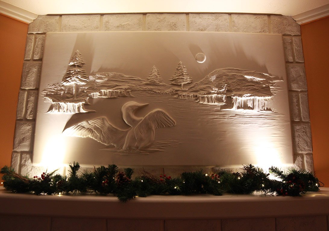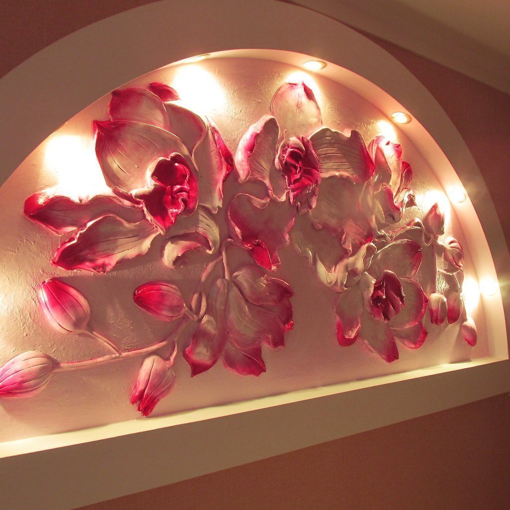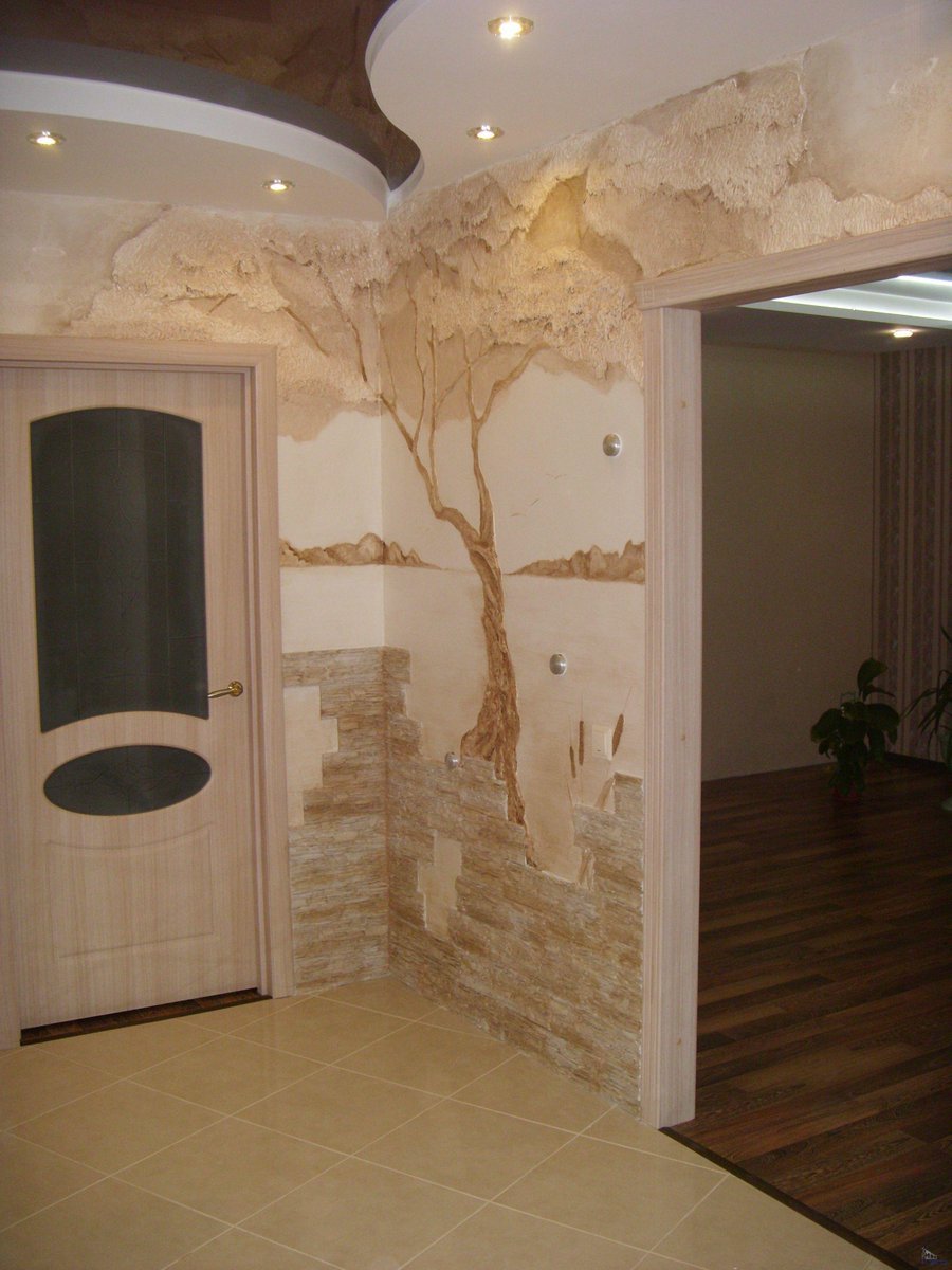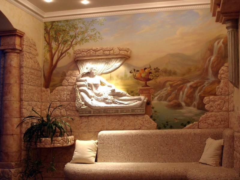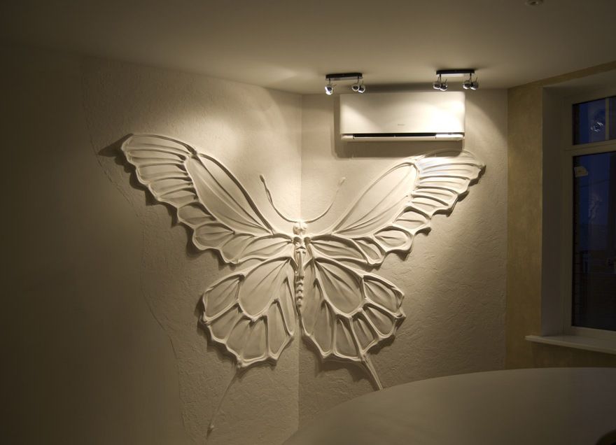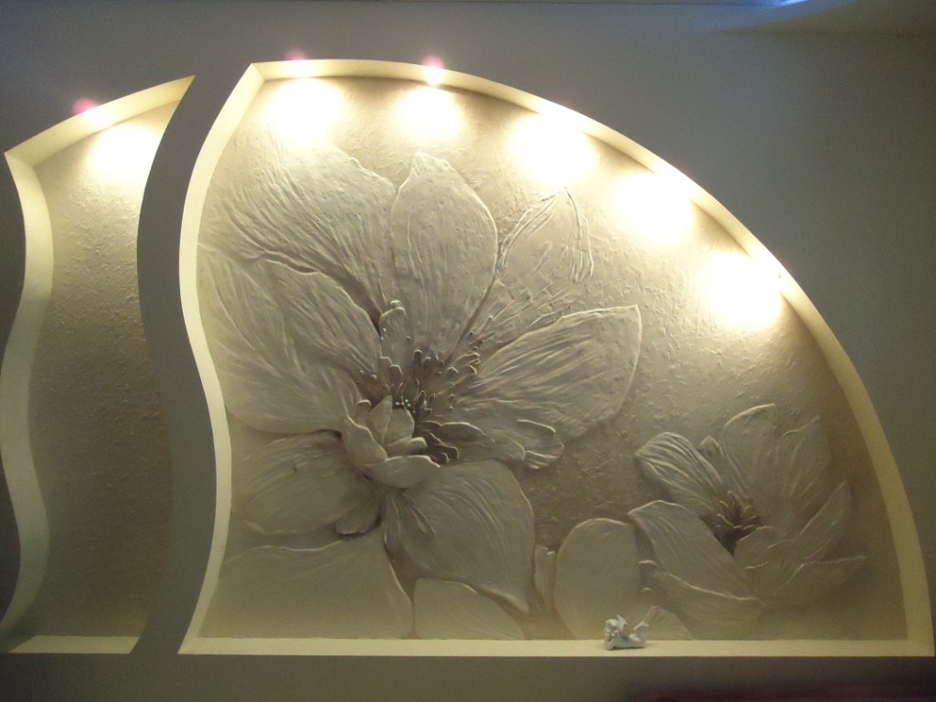 Las imágenes volumétricas de bancos de peces, patines, algas, “campos” de coral y fantásticos panoramas de las posesiones de Tritón son adecuados para el estilo marino. Por supuesto, un novato no podrá hacer tales composiciones la primera vez sin errores. Tienes que entrenar durante mucho tiempo y rellenar tu mano. Este es quizás el principal inconveniente del bajorrelieve. Es imposible crearlo hermoso sin mucho tiempo dedicado a enseñar la habilidad del escultor. La excepción serán solo relieves abstractos que sean adecuados para el mismo estilo o minimalismo. A diferencia de la pintura decorativa, los bajorrelieves no necesitan resaltado adicional. La luz de fondo enfatiza perfectamente cada línea. Este tipo de decoración es popular para decorar arcos, chimeneas, aberturas y paredes decorativas. Con su ayuda, puede enmascarar correctamente las irregularidades de la superficie, ocultar las líneas de comunicación o distorsionar el espacio en una habitación de forma irregular.